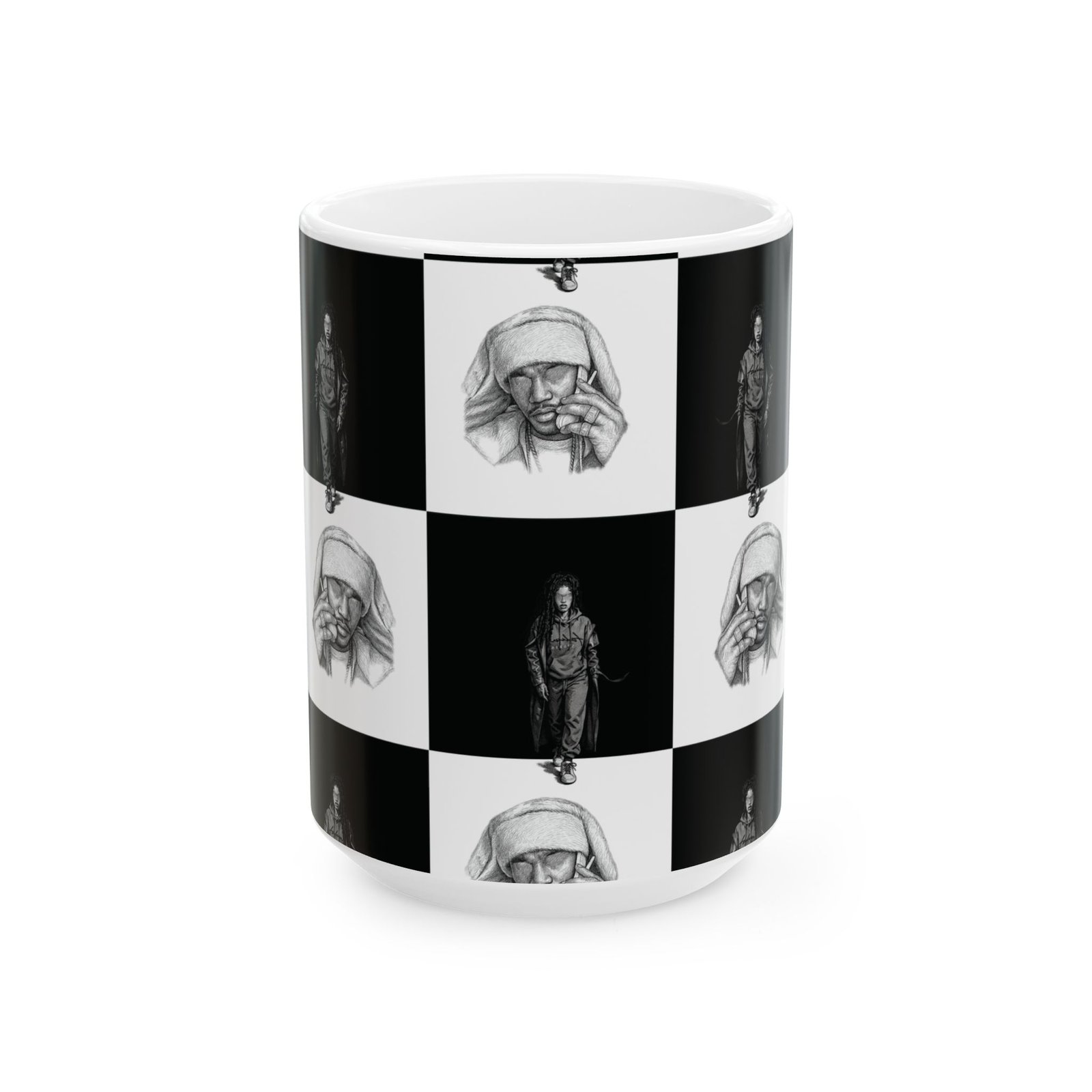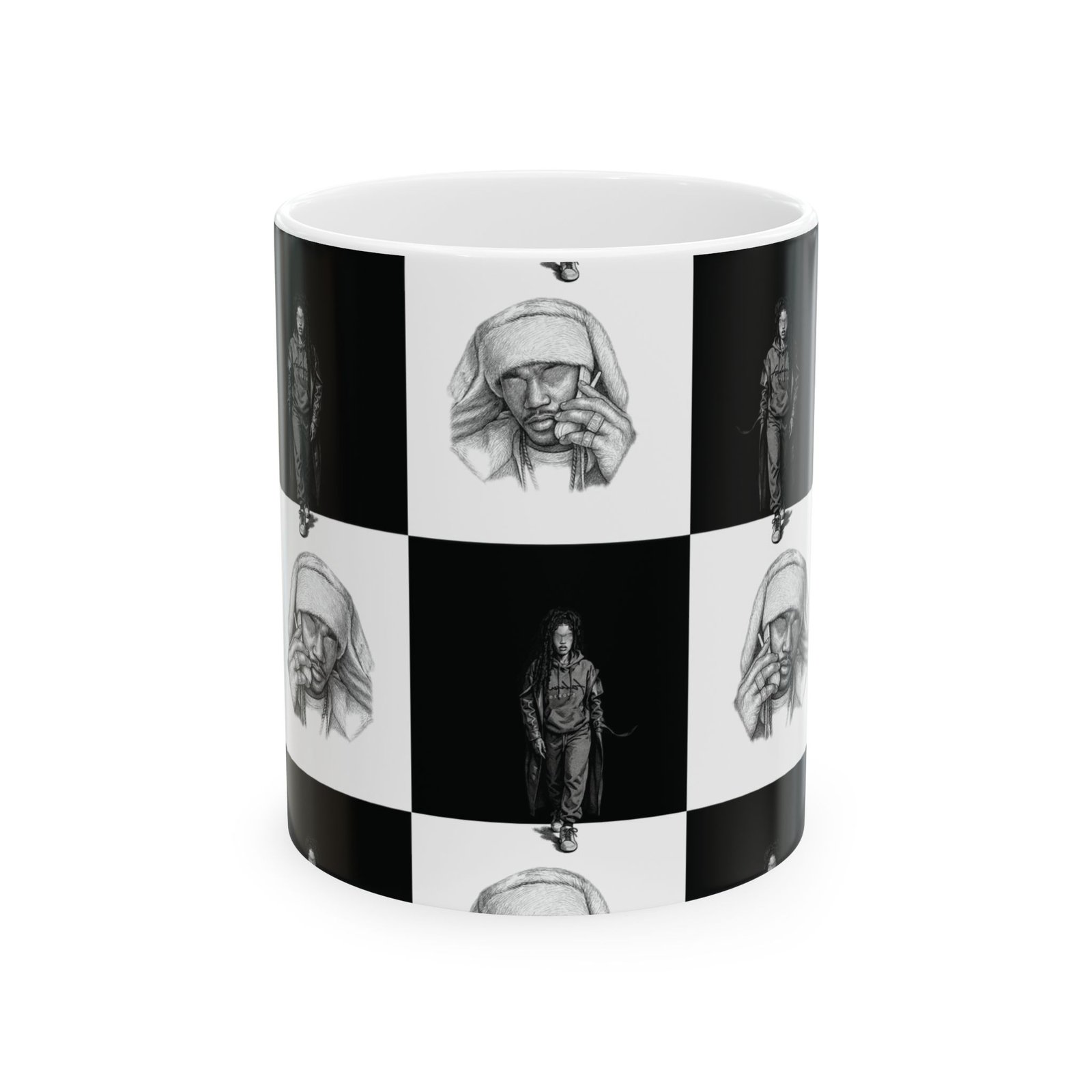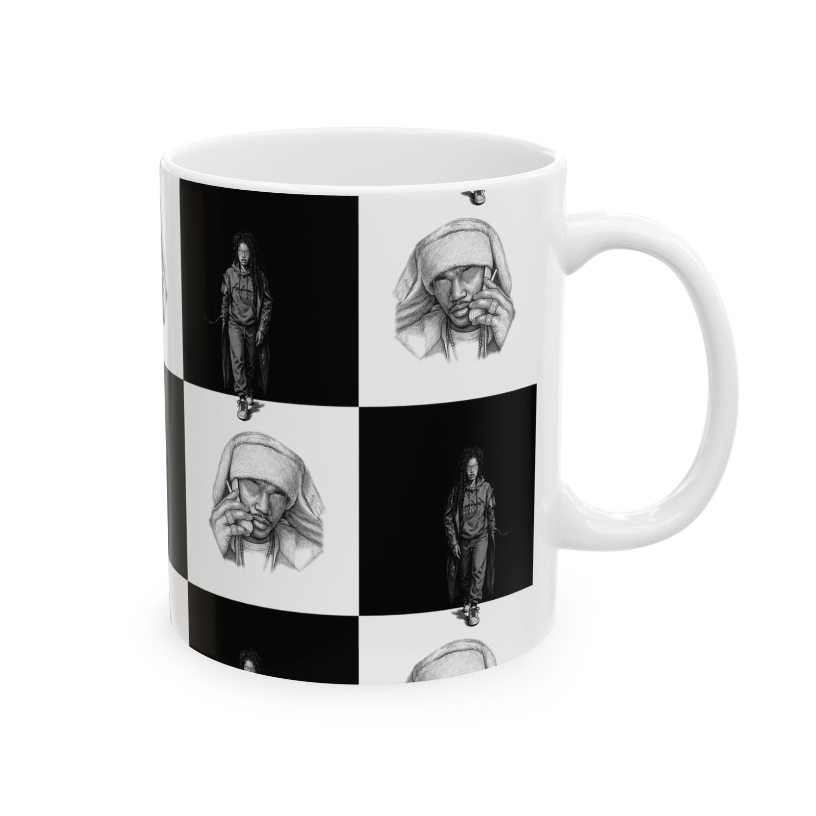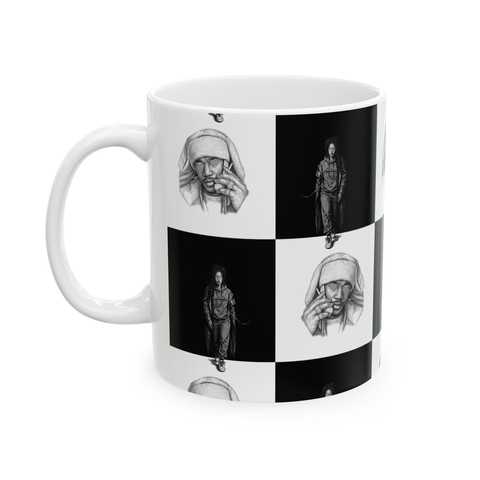 This ceramic mug brings a quiet, artful energy to your morning routine. Its monochrome checkerboard design alternates thoughtful portrait sketches with solitary figures, creating a contemplative rhythm as you sip. The smooth white ceramic and rounded C-handle feel familiar and steady in hand. Use it for early coffee on the porch, late-night tea while sketching, or beside a stack of notebooks during creative work. The visuals invite pause — a small, personal moment of reflection between busy tasks.