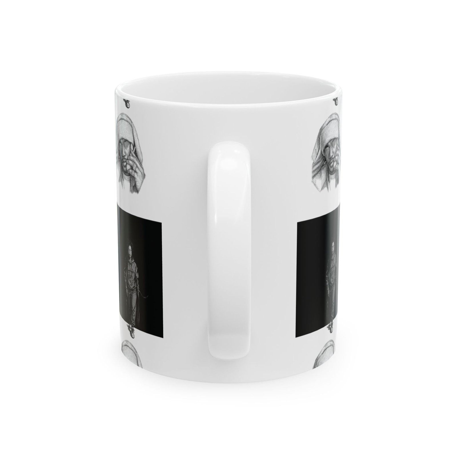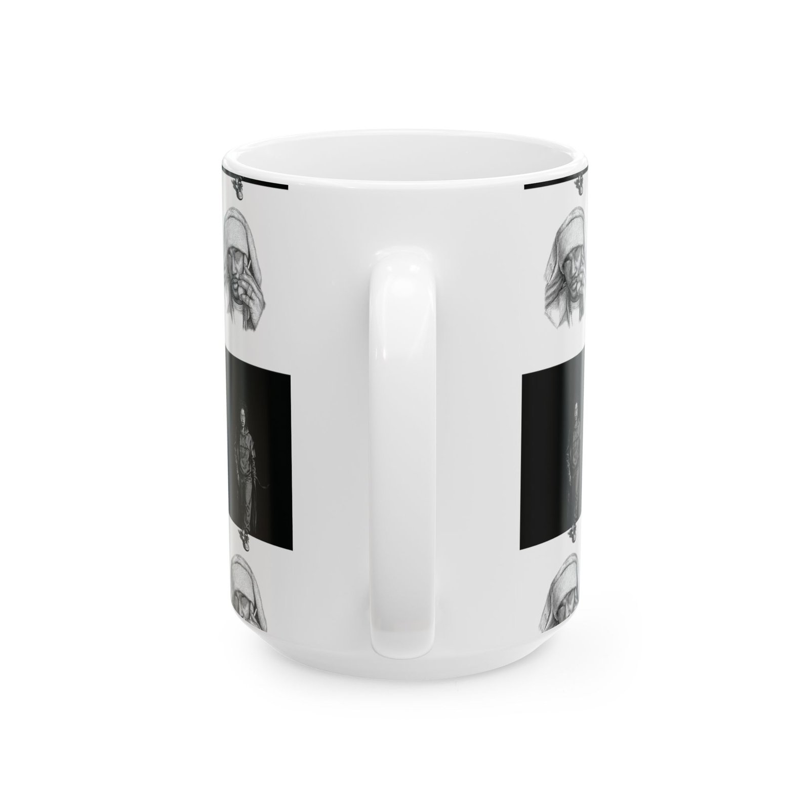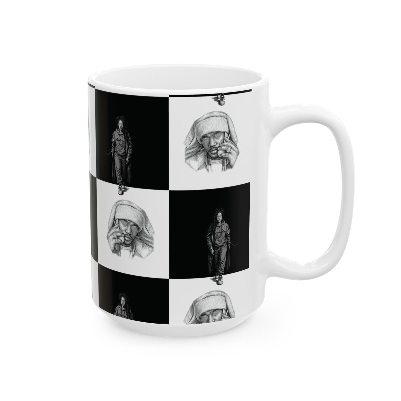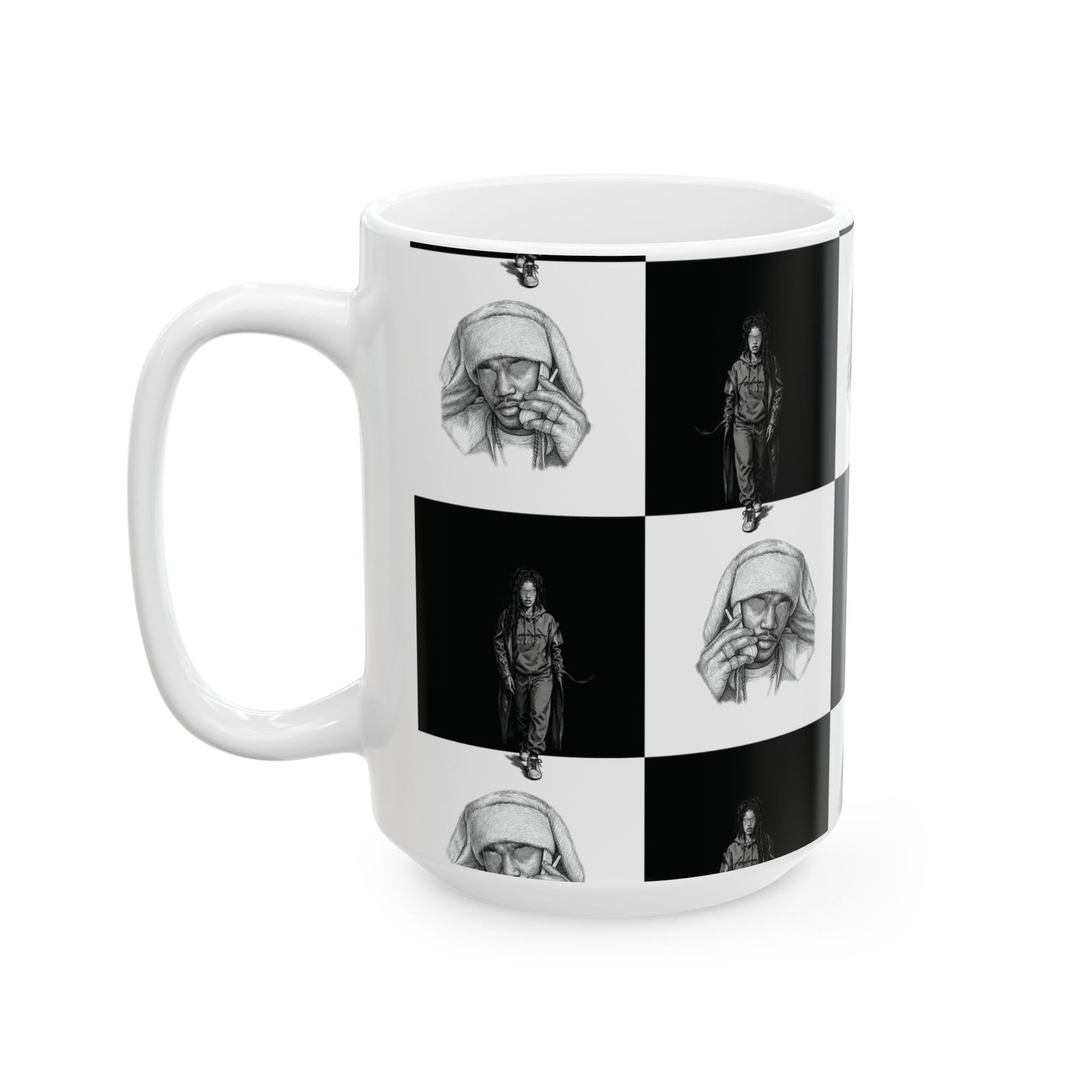 This ceramic mug brings a quiet, artful energy to your morning routine. Its monochrome checkerboard design alternates thoughtful portrait sketches with solitary figures, creating a contemplative rhythm as you sip. The smooth white ceramic and rounded C-handle feel familiar and steady in hand. Use it for early coffee on the porch, late-night tea while sketching, or beside a stack of notebooks during creative work. The visuals invite pause — a small, personal moment of reflection between busy tasks.