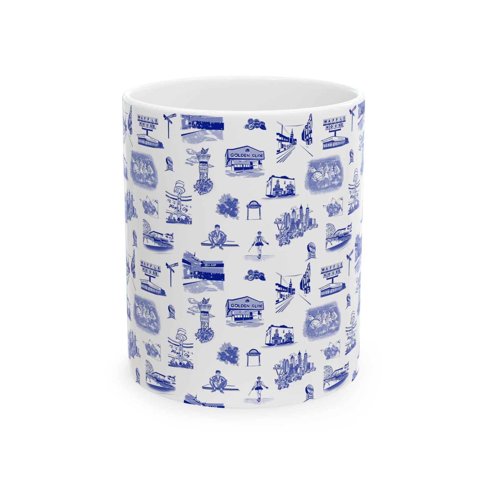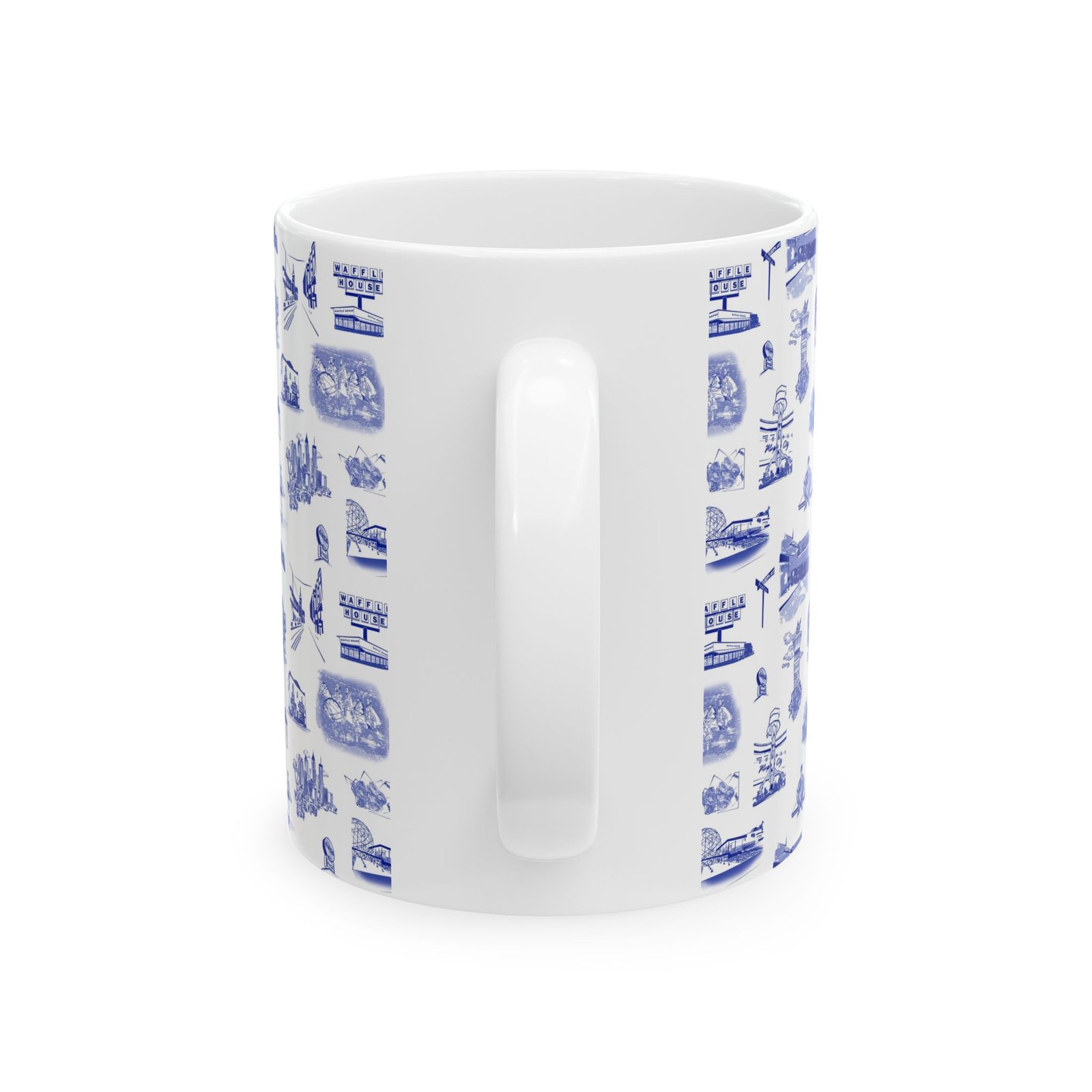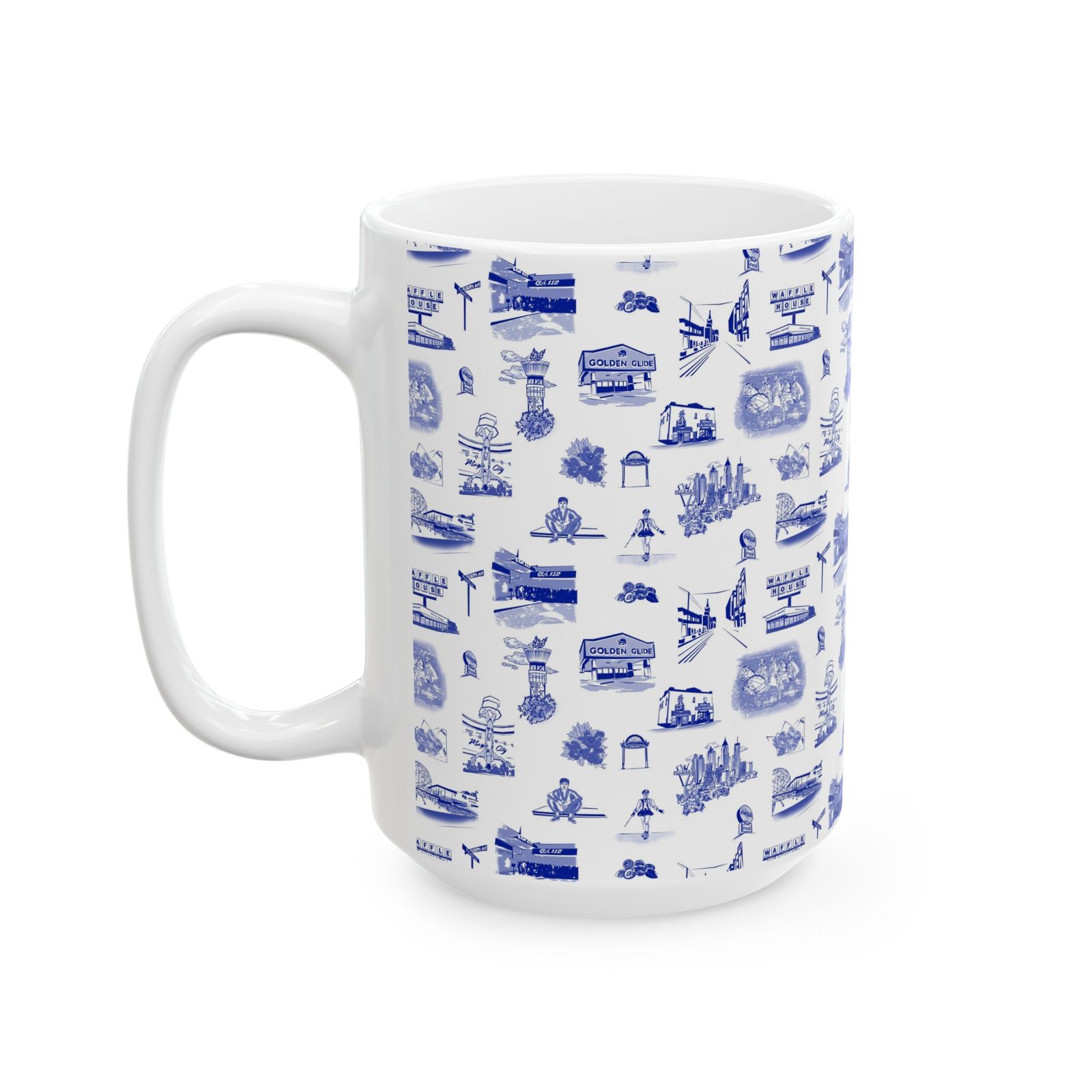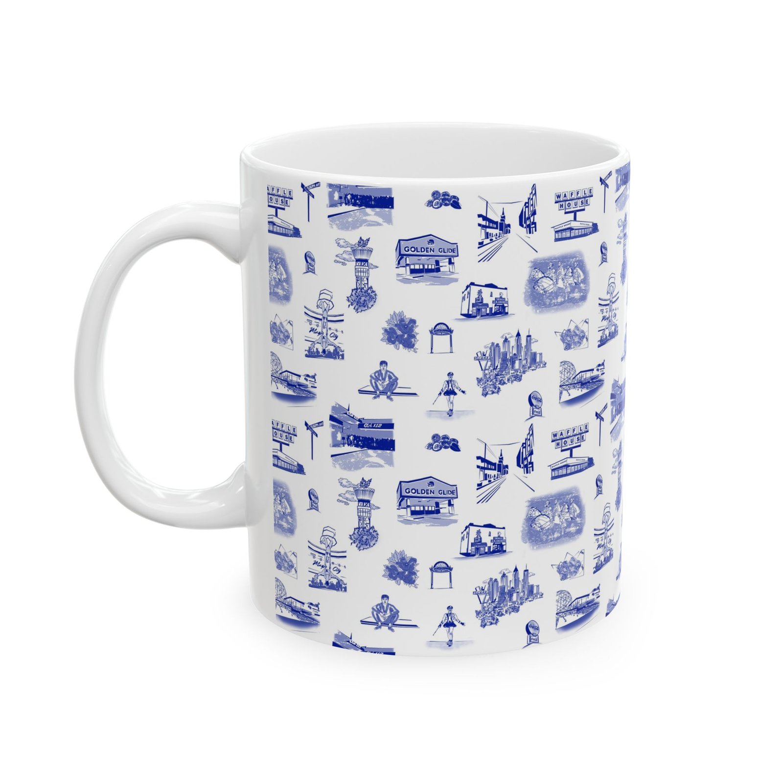 This glossy ceramic mug brings a quiet, nostalgic charm to every sip. Delicate blue toile-style illustrations wrap the exterior, each tiny scene drawing you into a coastal town of cafés, lighthouses, and boardwalk moments. It feels like a calm morning by the harbor — warm hands around the cup, steam rising, and a slow start to the day. The comfortable C-handle and bright, durable print make it an effortless companion for routine rituals or thoughtful pauses. Use it at a cluttered artist’s desk, beside a reading lamp, or as part of a laid-back brunch spread to add subtle character without shouting for attention.
