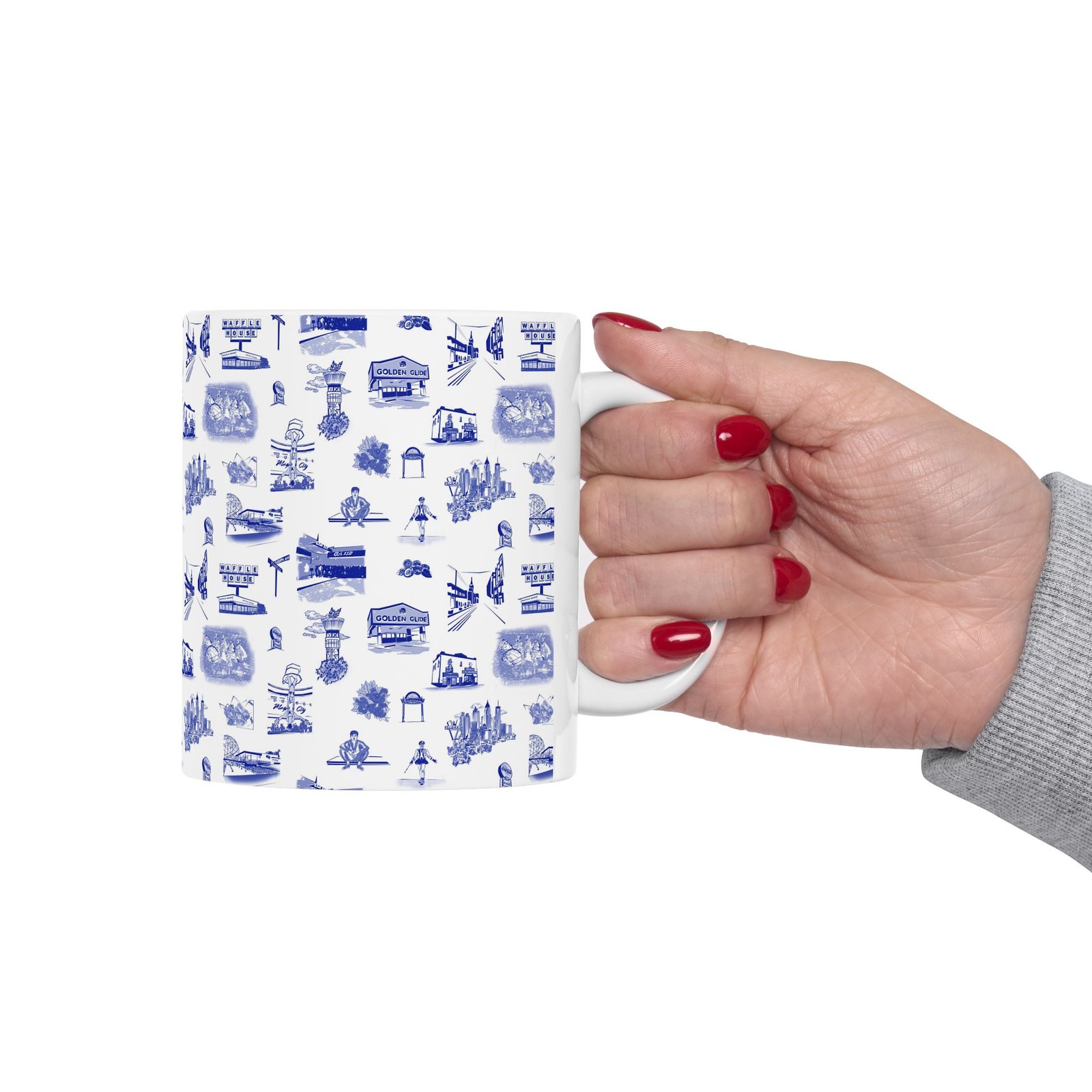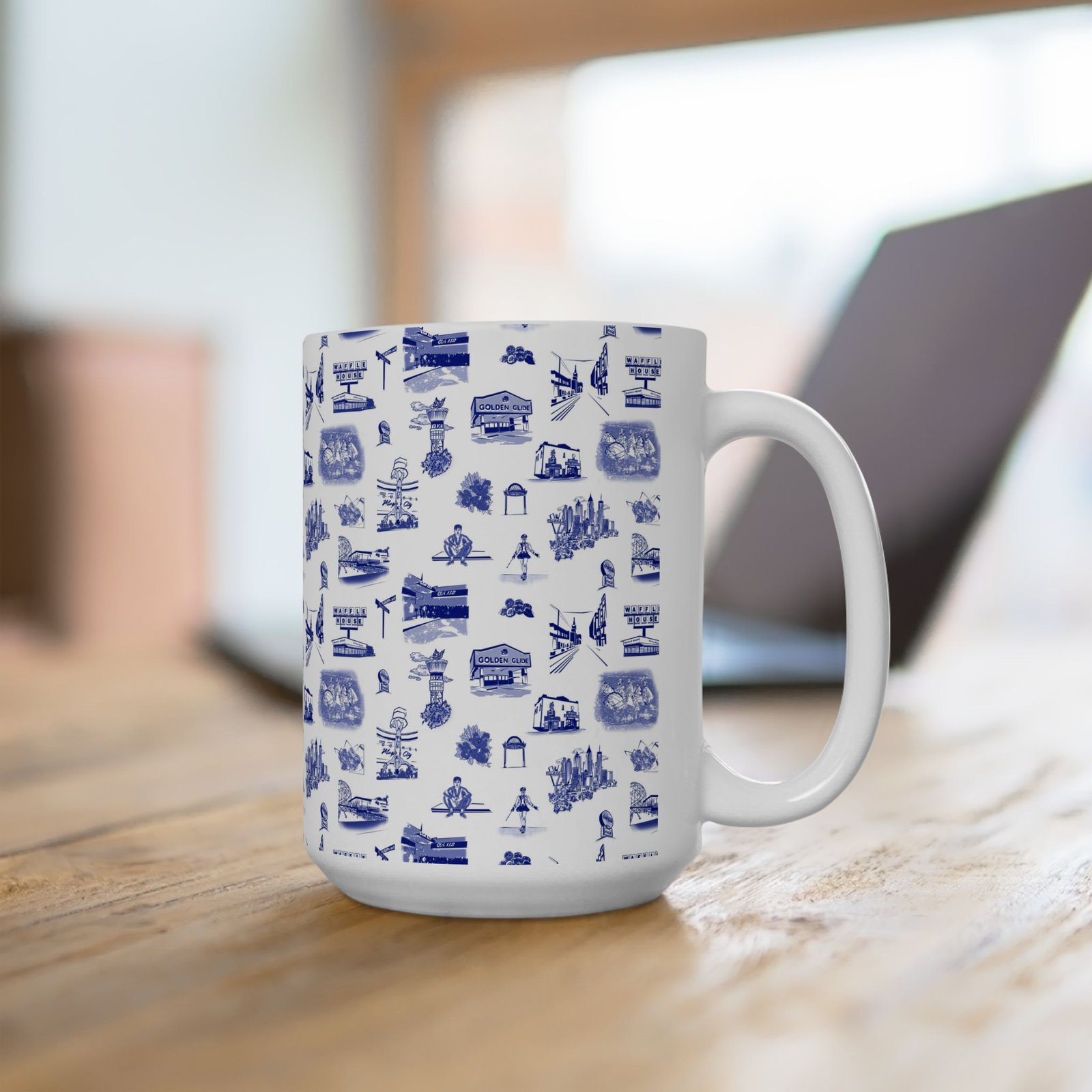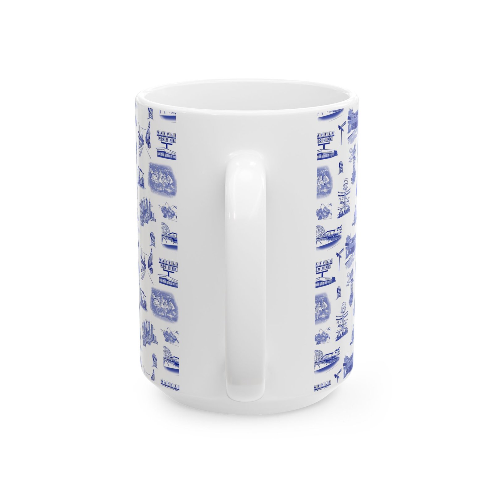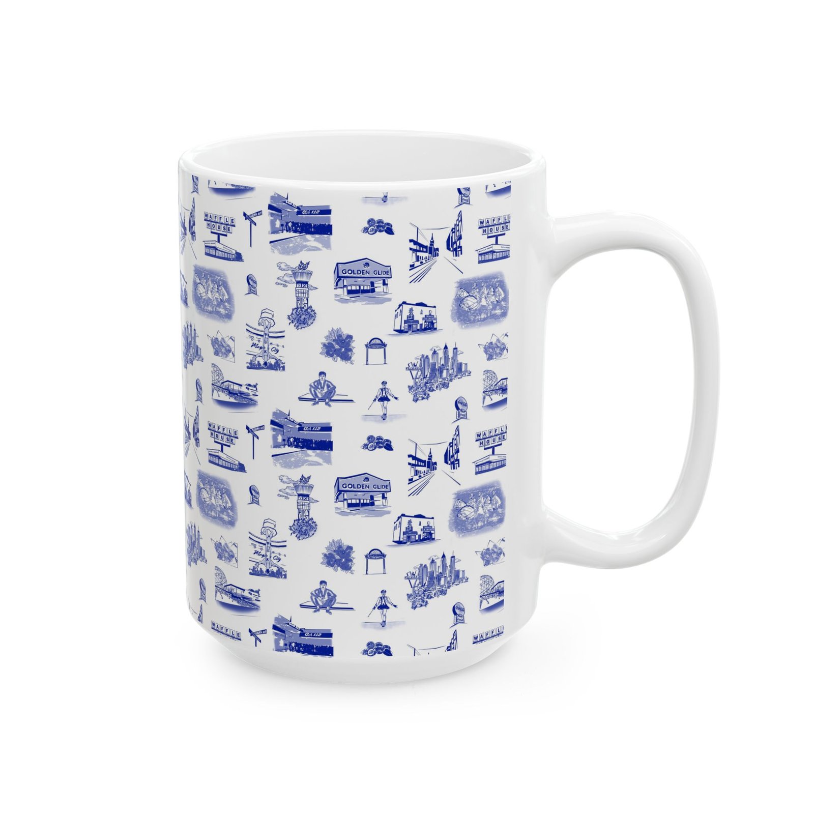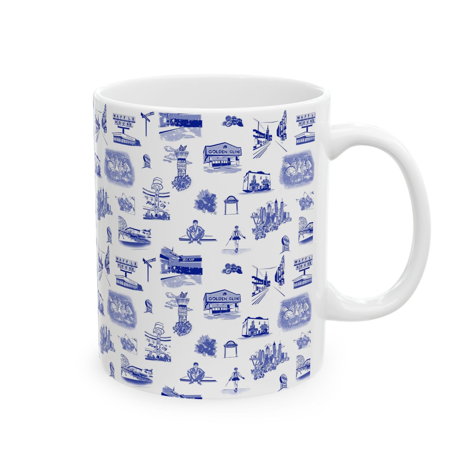 This glossy ceramic mug brings a quiet, nostalgic charm to every sip. Delicate blue toile-style illustrations wrap the exterior, each tiny scene drawing you into a coastal town of cafés, lighthouses, and boardwalk moments. It feels like a calm morning by the harbor — warm hands around the cup, steam rising, and a slow start to the day. The comfortable C-handle and bright, durable print make it an effortless companion for routine rituals or thoughtful pauses. Use it at a cluttered artist’s desk, beside a reading lamp, or as part of a laid-back brunch spread to add subtle character without shouting for attention.