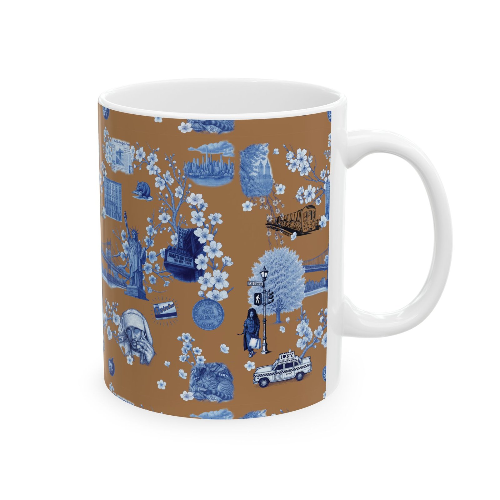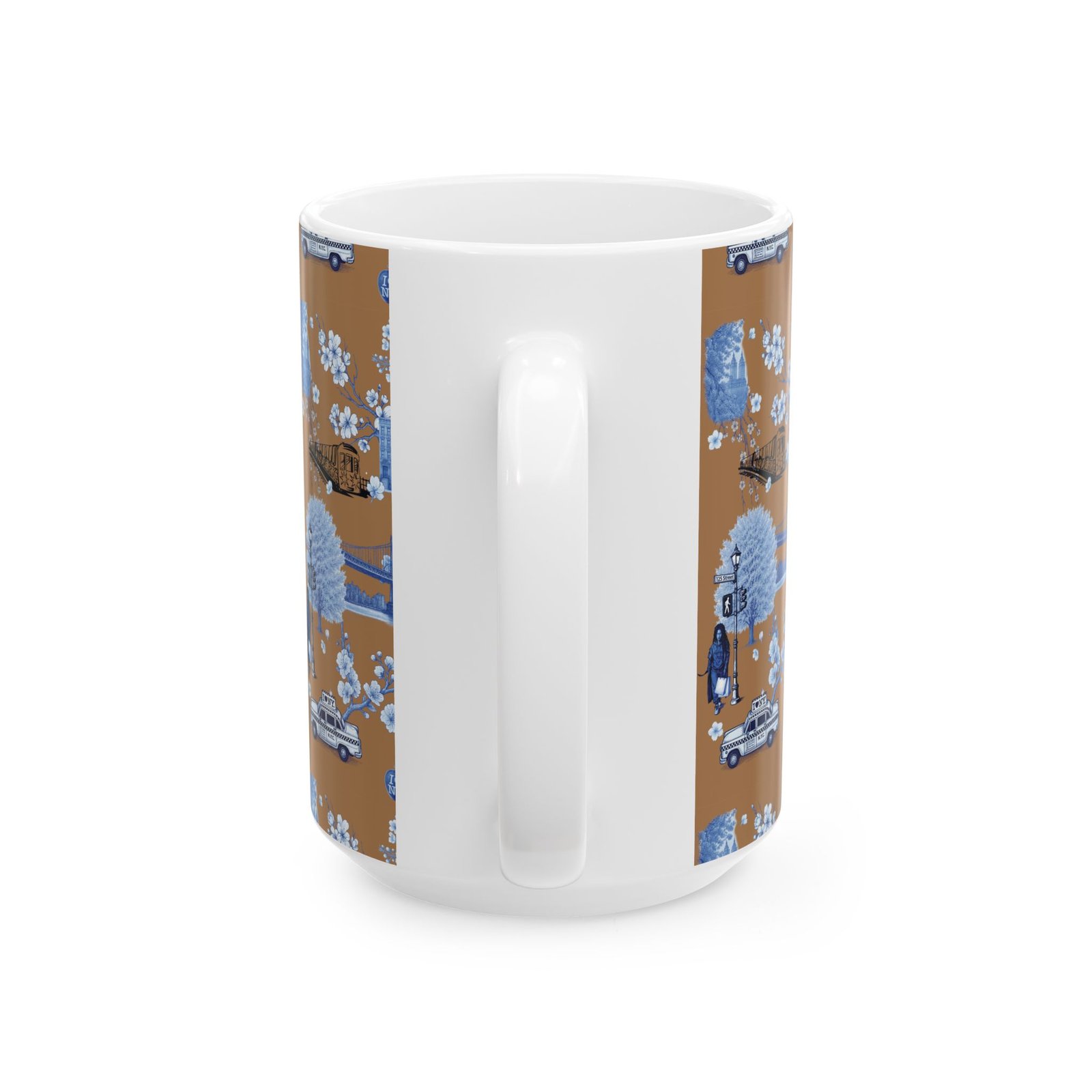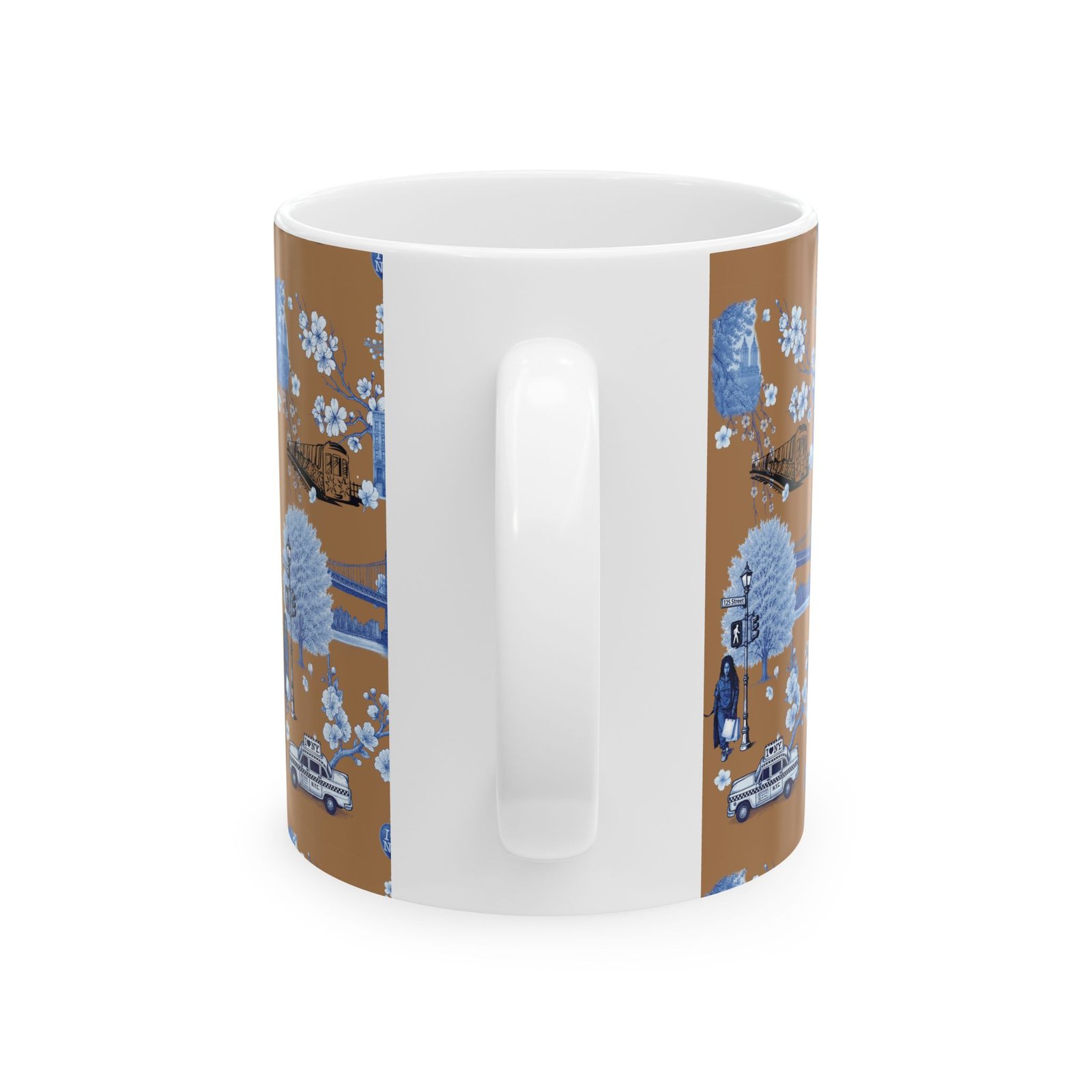 Warm, nostalgic, and a little whimsical — this 11 oz ceramic mug wraps your morning coffee in a miniature storybook. Blue toile-style illustrations float across a warm caramel background: bridges, vintage cars, small-town storefronts and tiny scenes framed by delicate blossoms. Each sip becomes a quiet moment of travel and memory, whether you’re easing into the day at your kitchen table or settling in with a paperback.