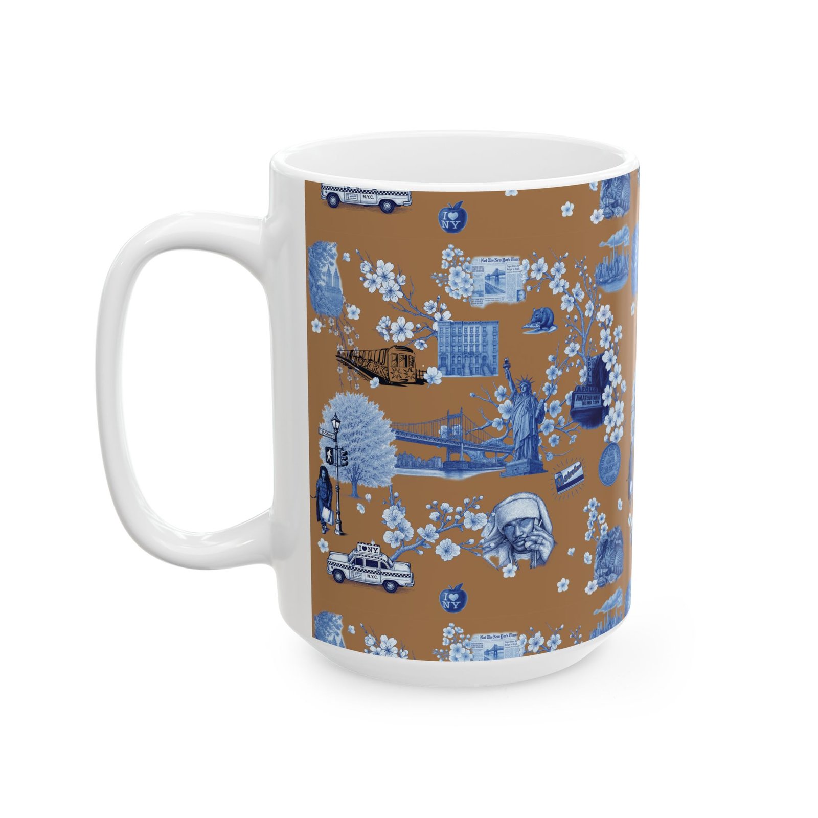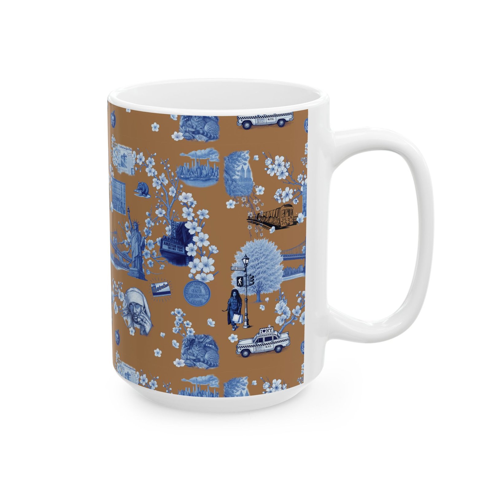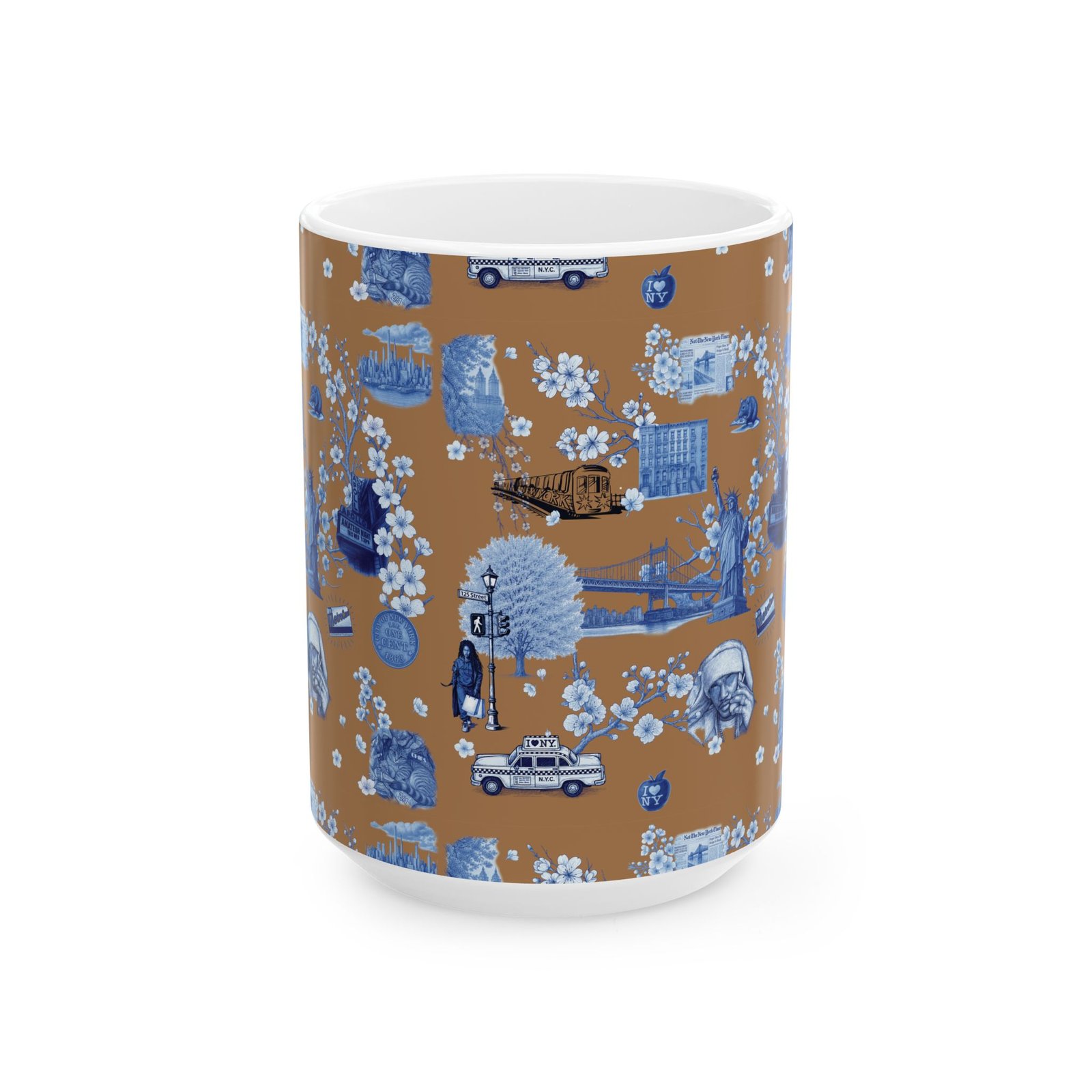 Warm, nostalgic, and a little whimsical — this 11 oz ceramic mug wraps your morning coffee in a miniature storybook. Blue toile-style illustrations float across a warm caramel background: bridges, vintage cars, small-town storefronts and tiny scenes framed by delicate blossoms. Each sip becomes a quiet moment of travel and memory, whether you’re easing into the day at your kitchen table or settling in with a paperback.