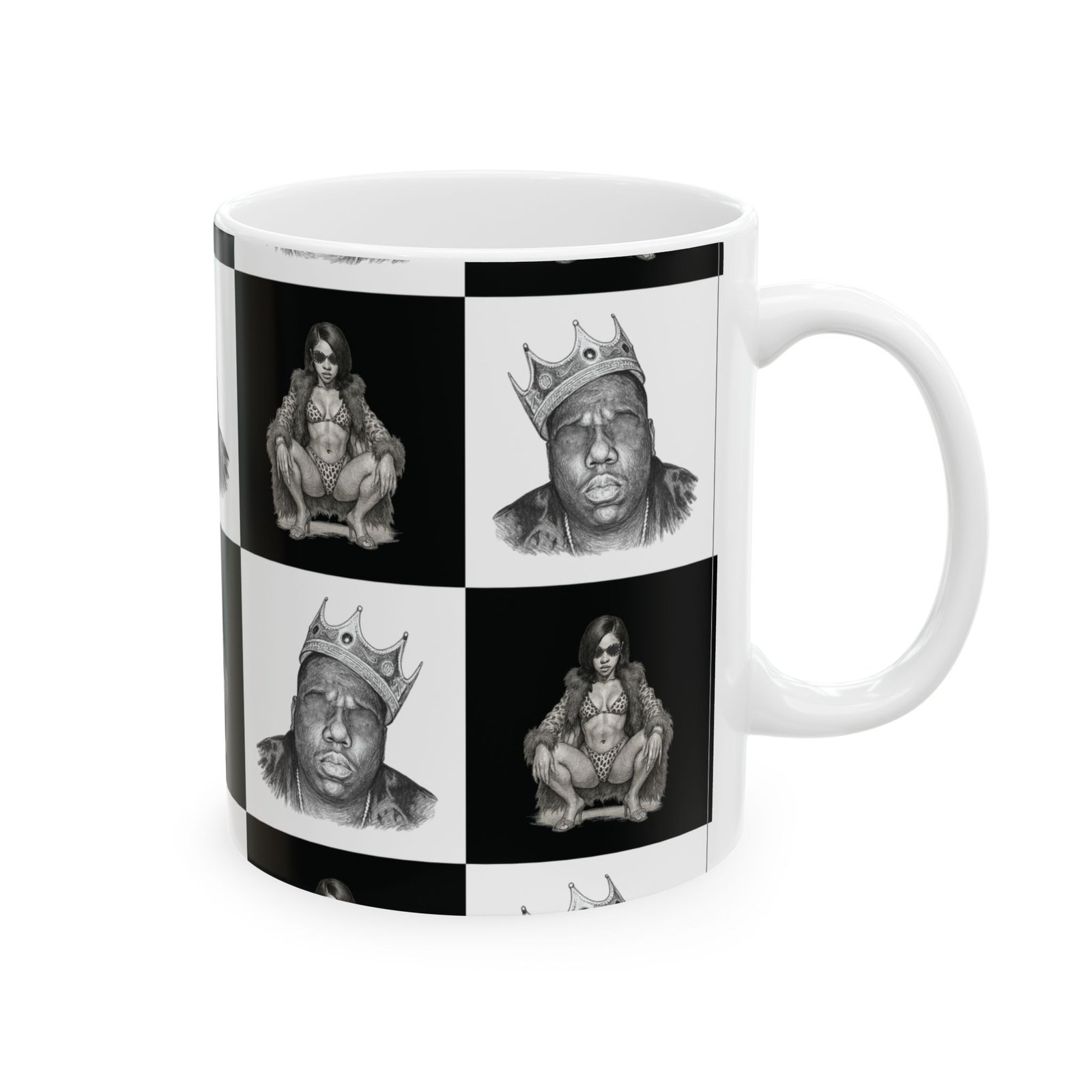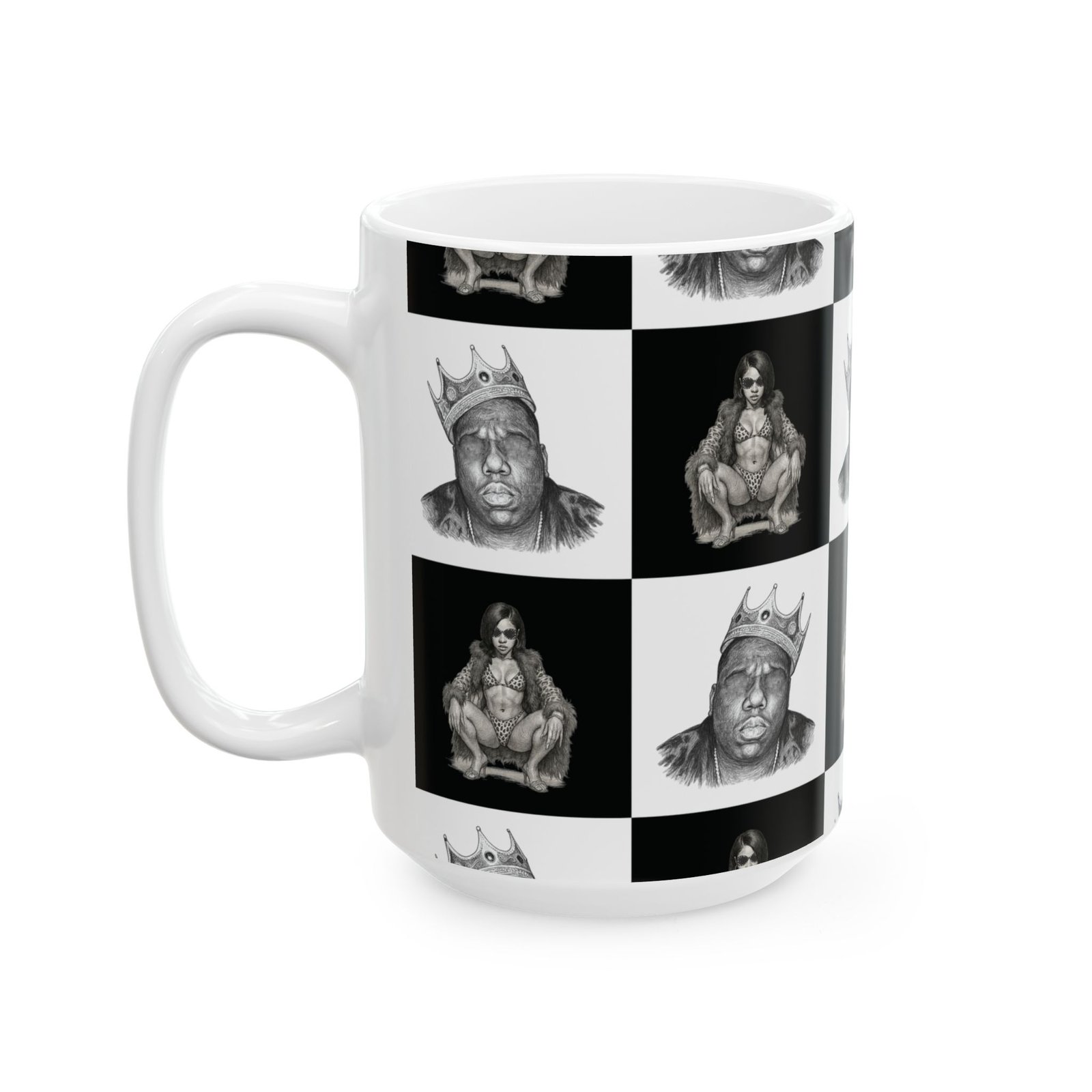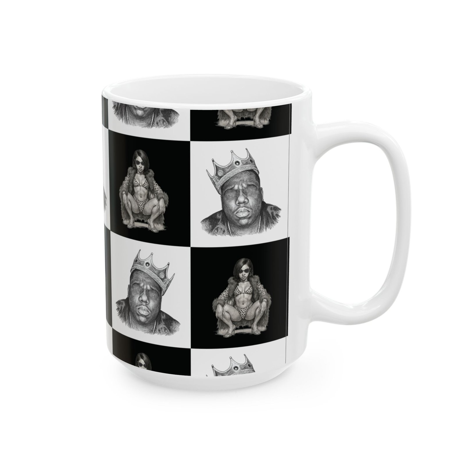 A bold ceramic mug with a high-contrast, black-and-white portrait grid that feels like street-art turned daily ritual. The glossy finish and crisp printing bring out fine pencil-style details in each portrait square, creating a graphic, urban rhythm around the mug. It’s the kind of piece that catches the eye on a cluttered desk and becomes part of a morning routine — a moment of attitude with your coffee, tea, or cocoa. The comfortable C-handle and sturdy white ceramic body make it easy to reach for every day, while the microwave- and dishwasher-safe build keeps it practical. Available in two sizes to match whatever you pour into it, this mug pairs well with playlists, late-night sketching sessions, or slow weekend mornings spent flipping through vinyls.
