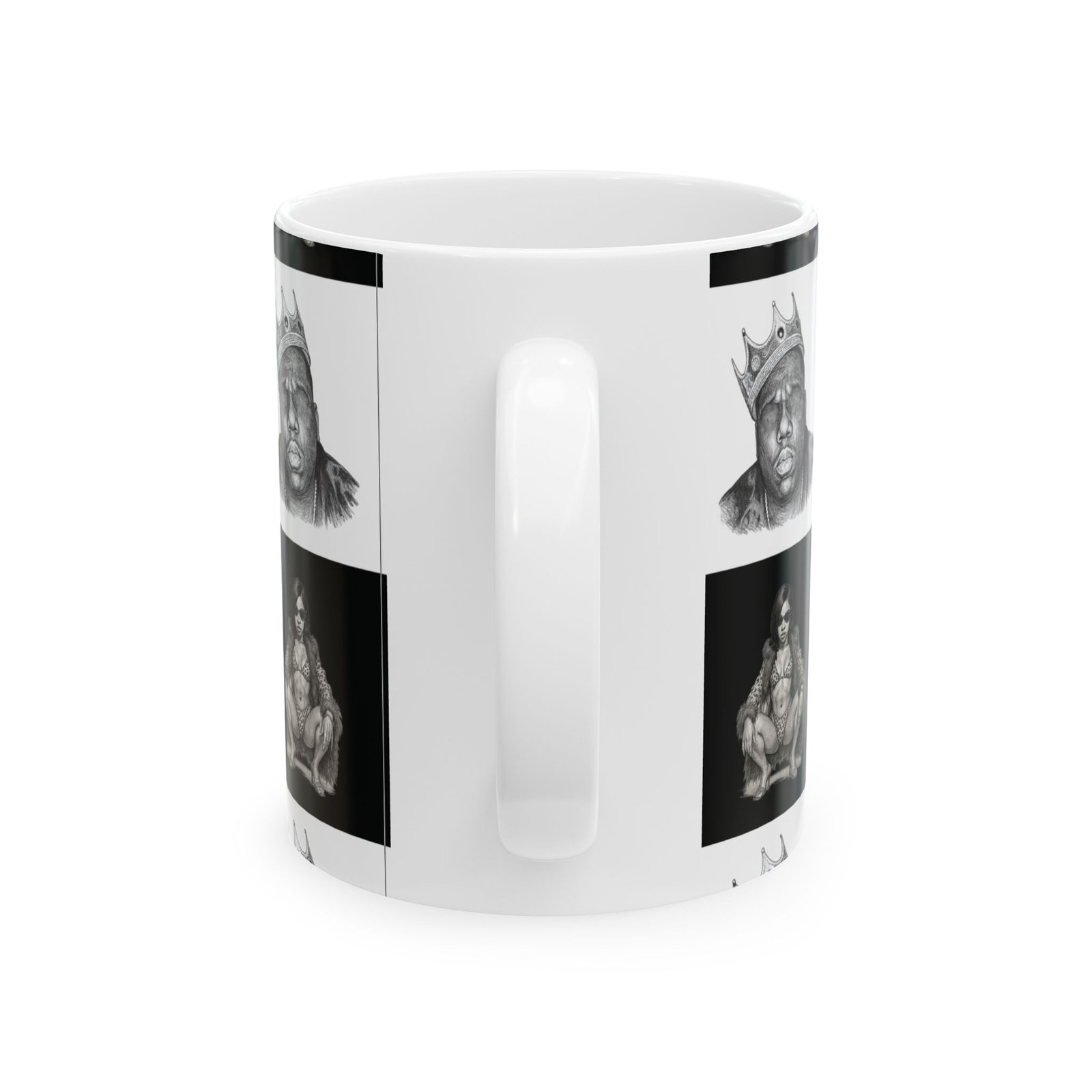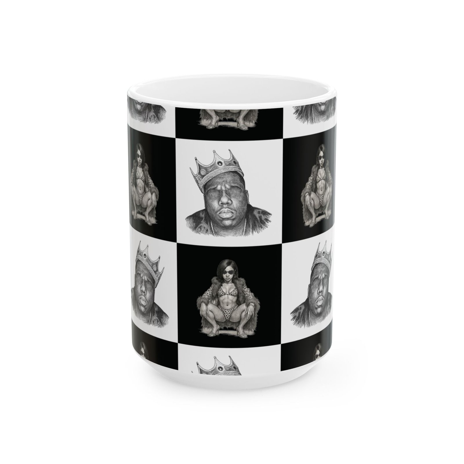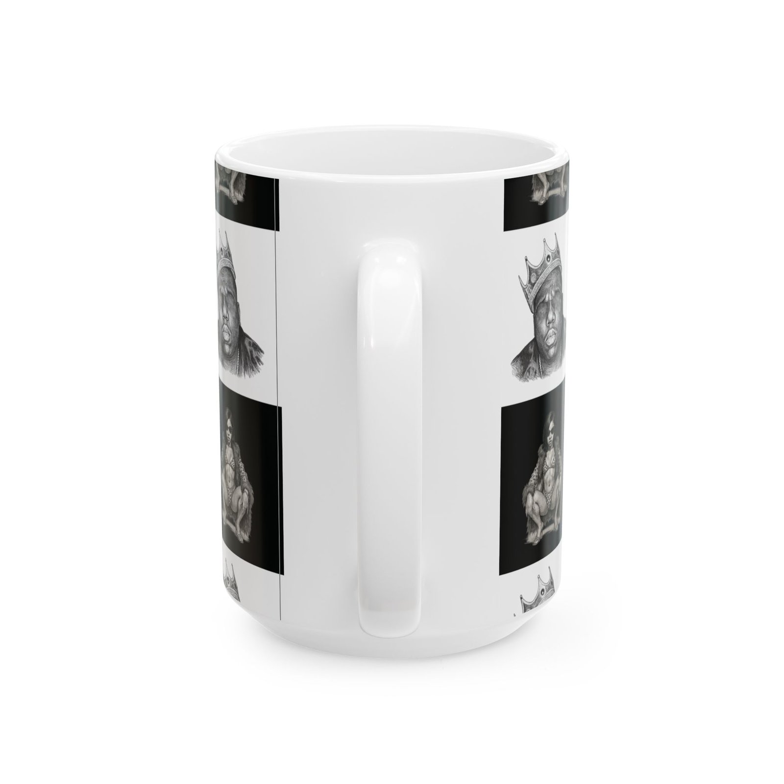 A bold ceramic mug with a high-contrast, black-and-white portrait grid that feels like street-art turned daily ritual. The glossy finish and crisp printing bring out fine pencil-style details in each portrait square, creating a graphic, urban rhythm around the mug. It’s the kind of piece that catches the eye on a cluttered desk and becomes part of a morning routine — a moment of attitude with your coffee, tea, or cocoa. The comfortable C-handle and sturdy white ceramic body make it easy to reach for every day, while the microwave- and dishwasher-safe build keeps it practical. Available in two sizes to match whatever you pour into it, this mug pairs well with playlists, late-night sketching sessions, or slow weekend mornings spent flipping through vinyls.