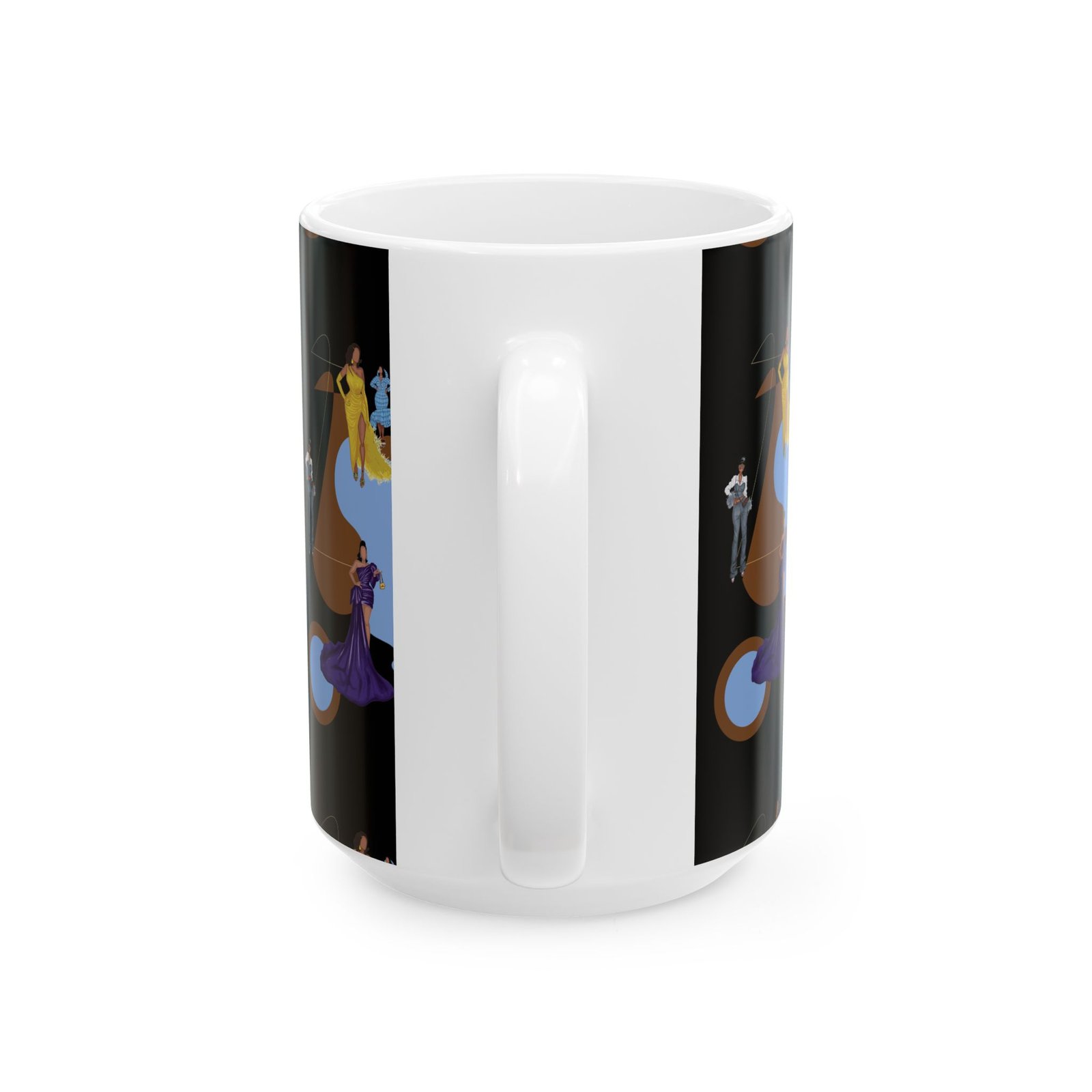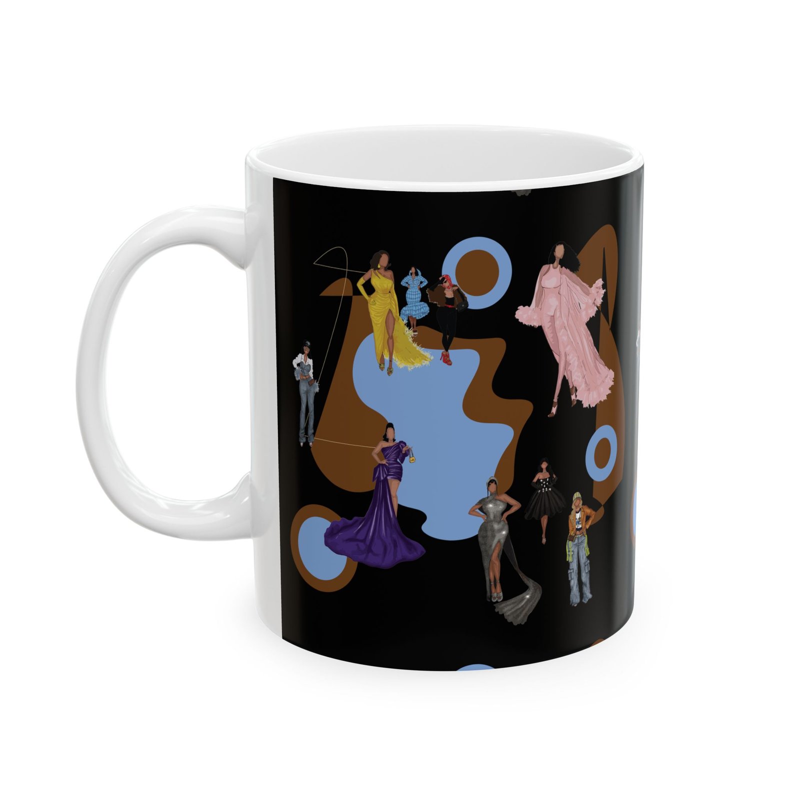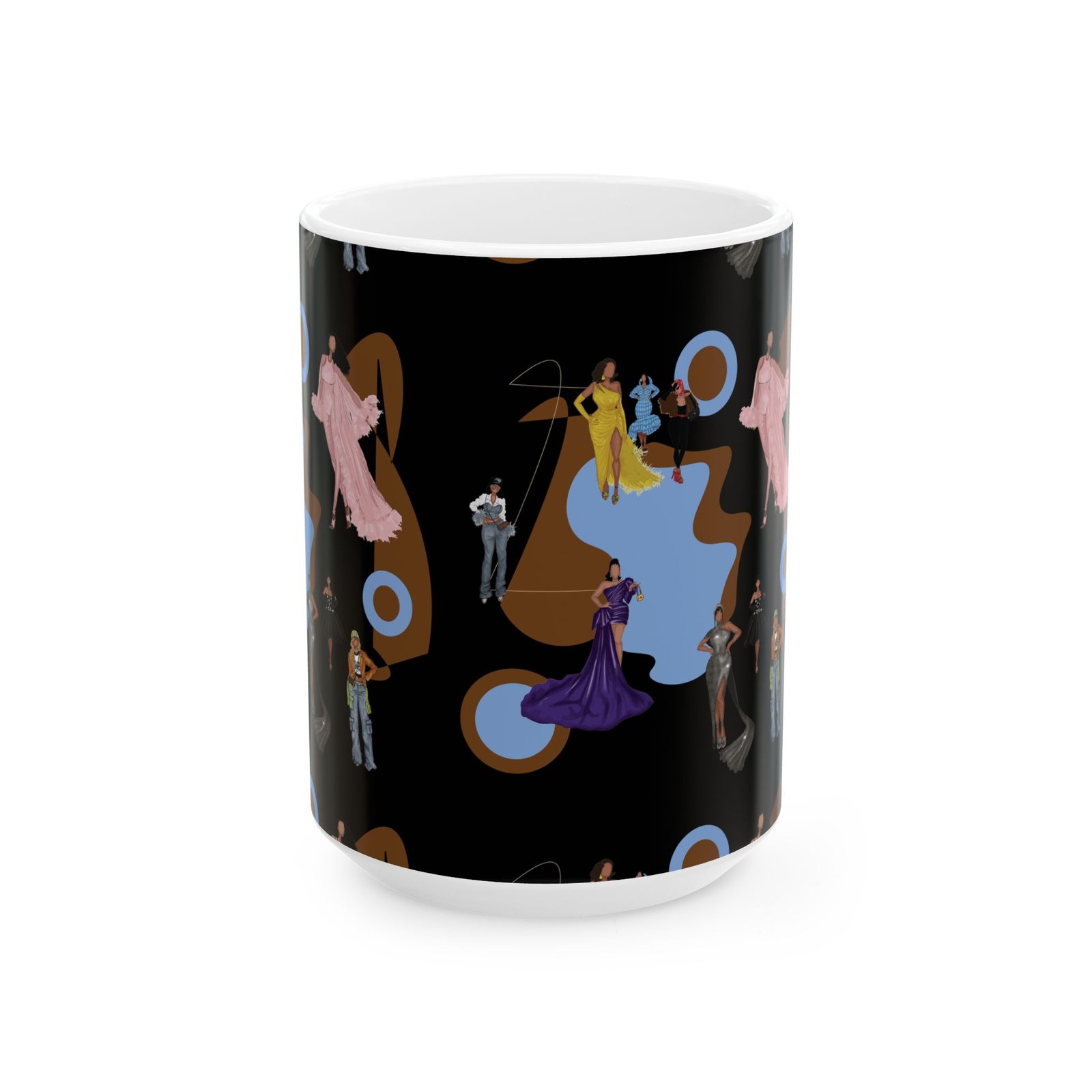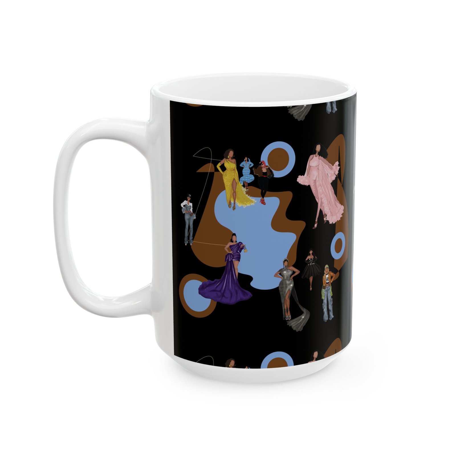 This 11oz ceramic mug brings a touch of vintage glamour to morning routines. Figures in flowing gowns and tailored suits drift across a rich black backdrop, layered over warm brown shapes and muted blue targets for a retro, theatrical mood. It feels like stepping into a backstage lounge — quiet, stylish, slightly mysterious — where every sip is a moment to slow down and admire detail. Use it while sketching costume ideas, journaling after a late performance, or settling in with music that matches the design’s mood.