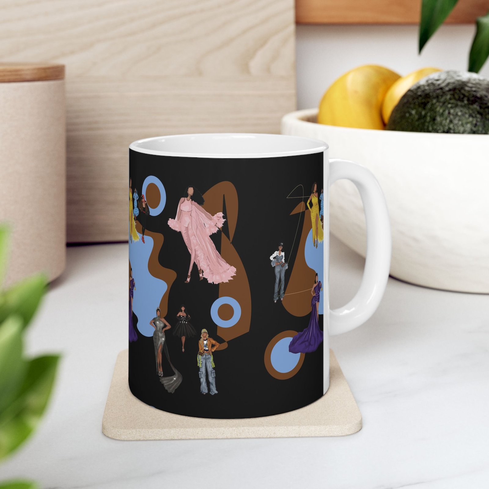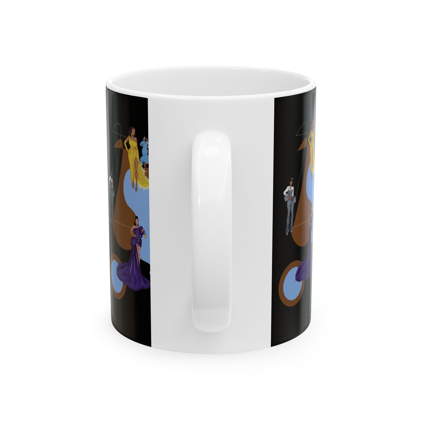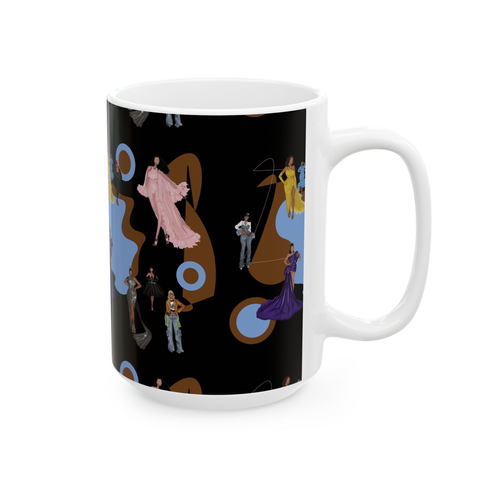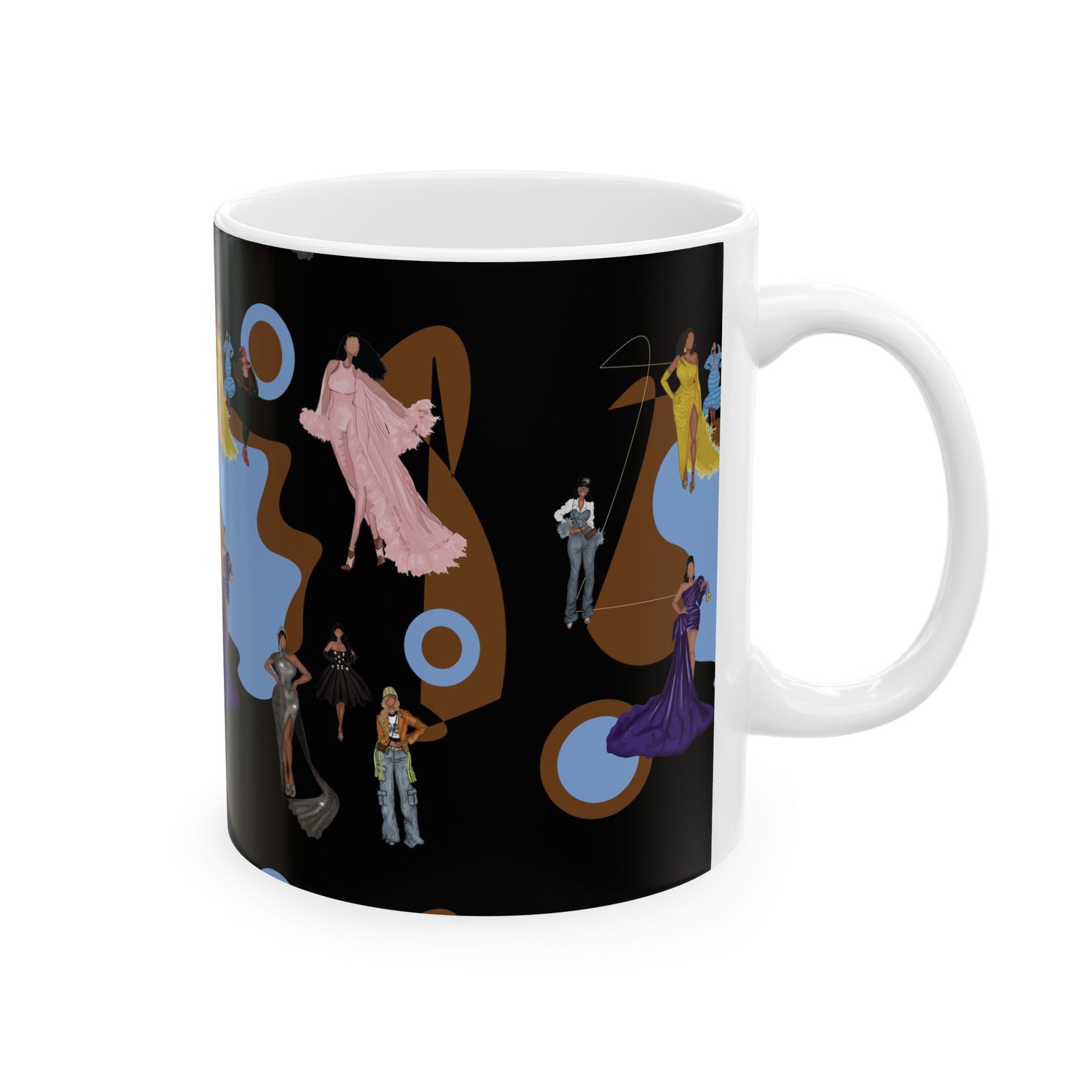 This 11oz ceramic mug brings a touch of vintage glamour to morning routines. Figures in flowing gowns and tailored suits drift across a rich black backdrop, layered over warm brown shapes and muted blue targets for a retro, theatrical mood. It feels like stepping into a backstage lounge — quiet, stylish, slightly mysterious — where every sip is a moment to slow down and admire detail. Use it while sketching costume ideas, journaling after a late performance, or settling in with music that matches the design’s mood.