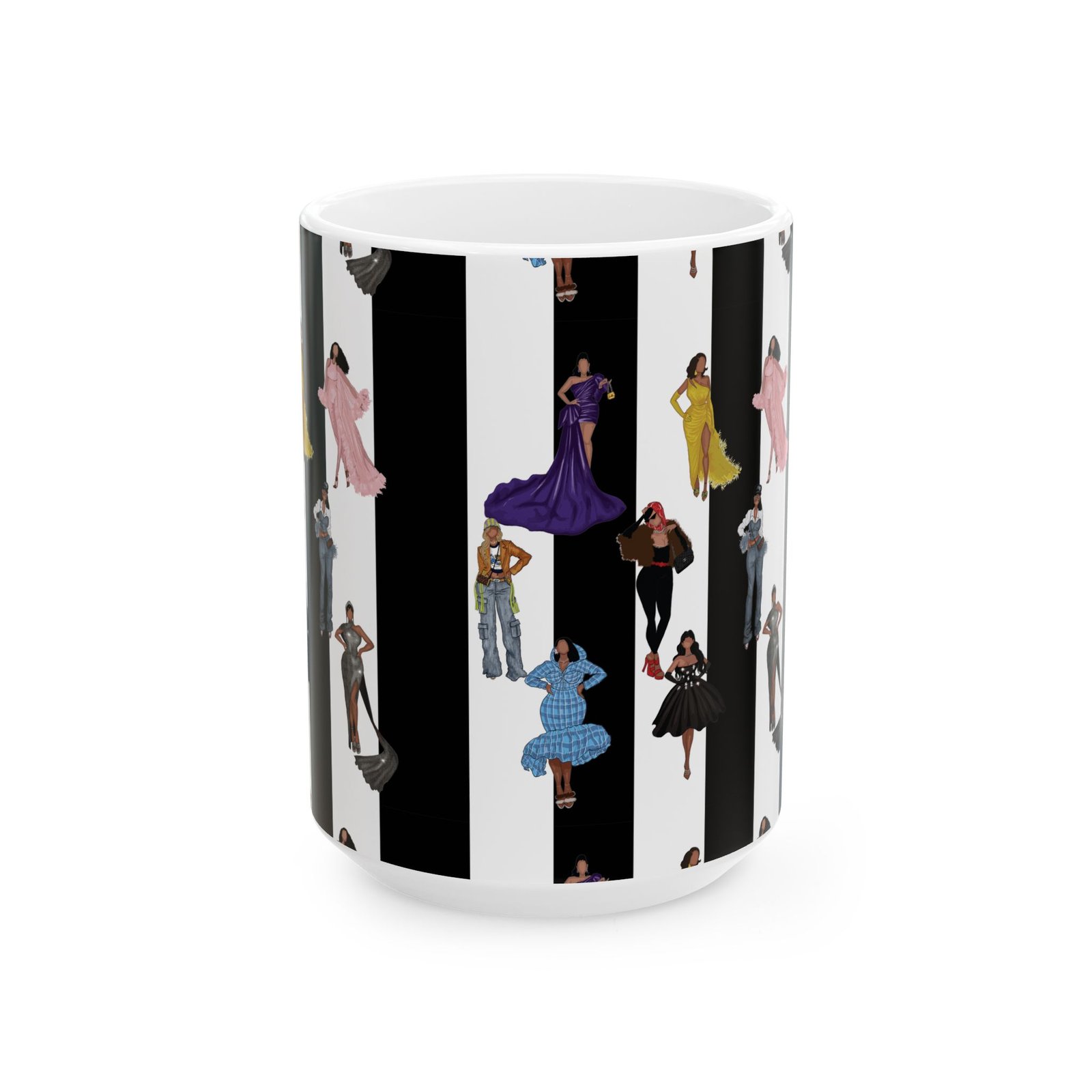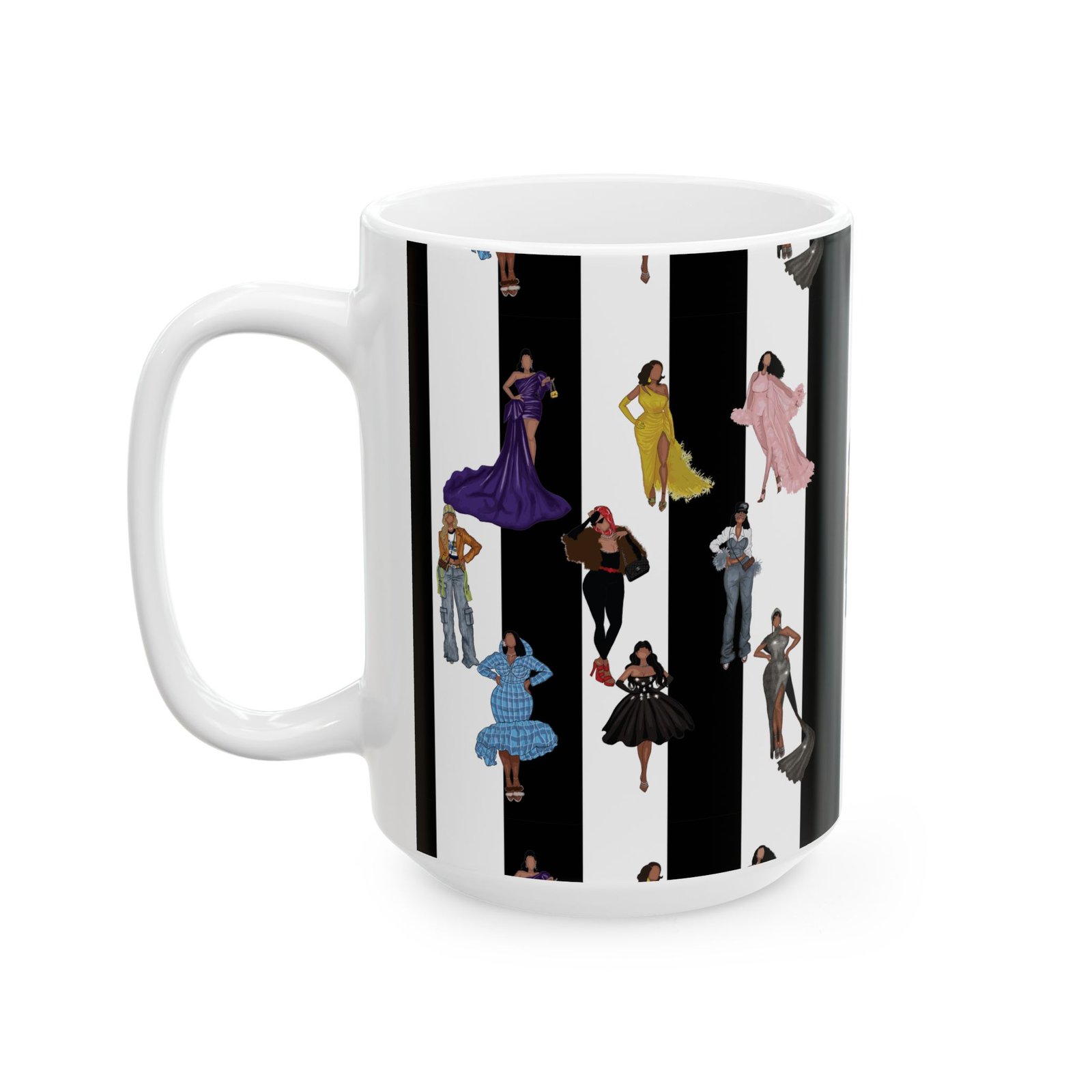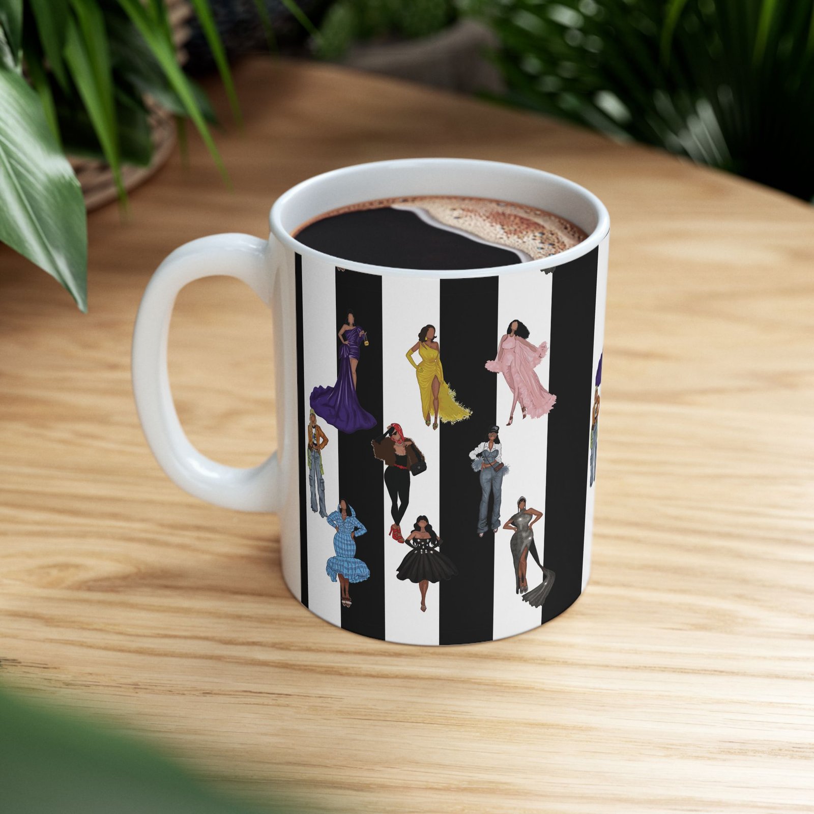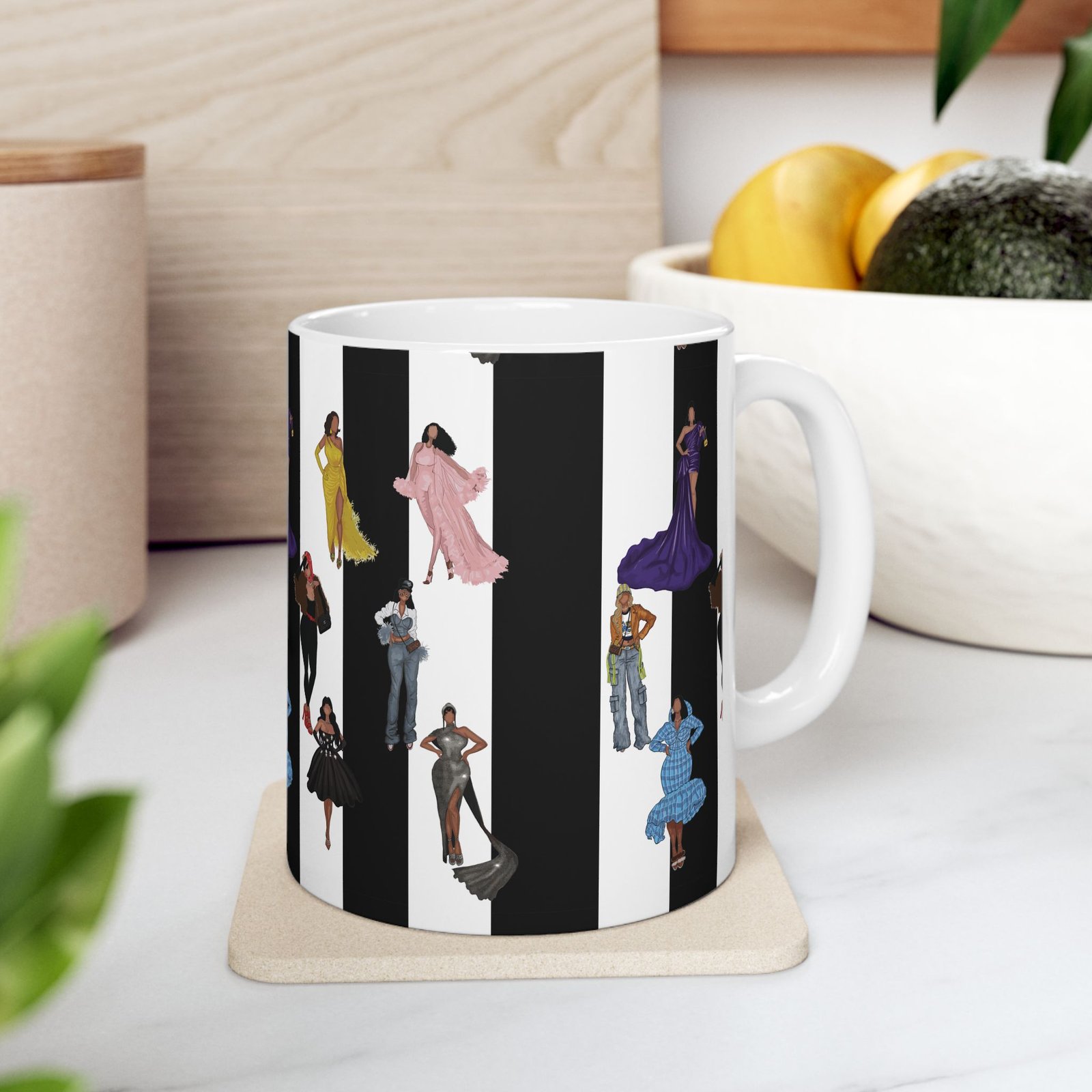 This 11oz ceramic mug brings a little runway energy to your morning ritual. Vertical black-and-white stripes wrap around the cup, punctuated by illustrations of stylish women in bold dresses and confident poses. It feels like a moment of sisterhood and style — a small, joyful reminder to stand tall while you sip coffee, tea, or cocoa. The smooth C-handle and rounded silhouette make it comfortable to hold; the bright print keeps its personality through everyday use. Use it on slow weekend mornings, while getting ready for a night out, or as a cheerful desk companion that quietly celebrates fashion and confidence.