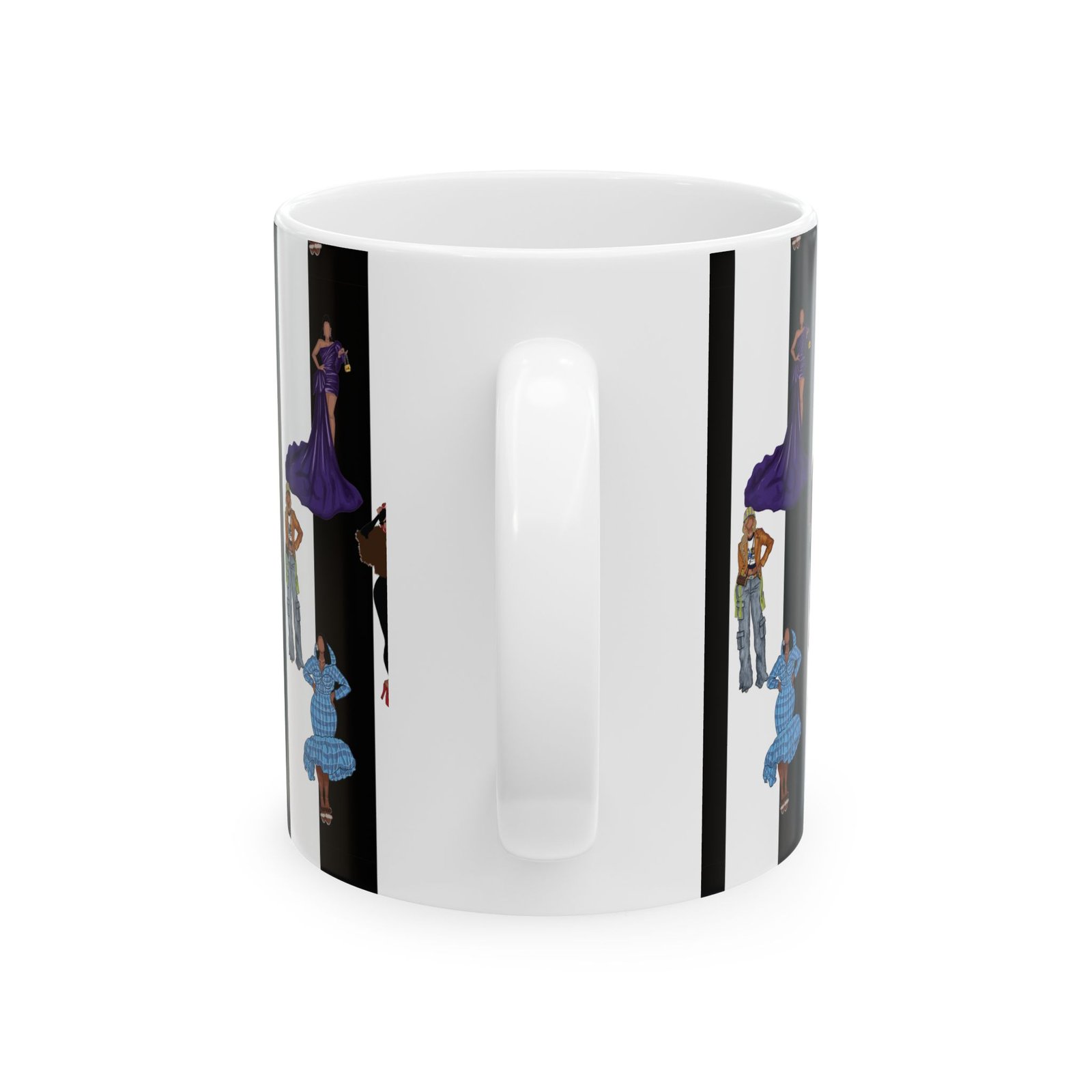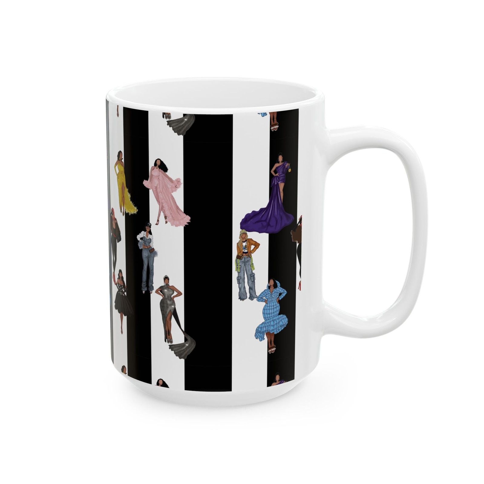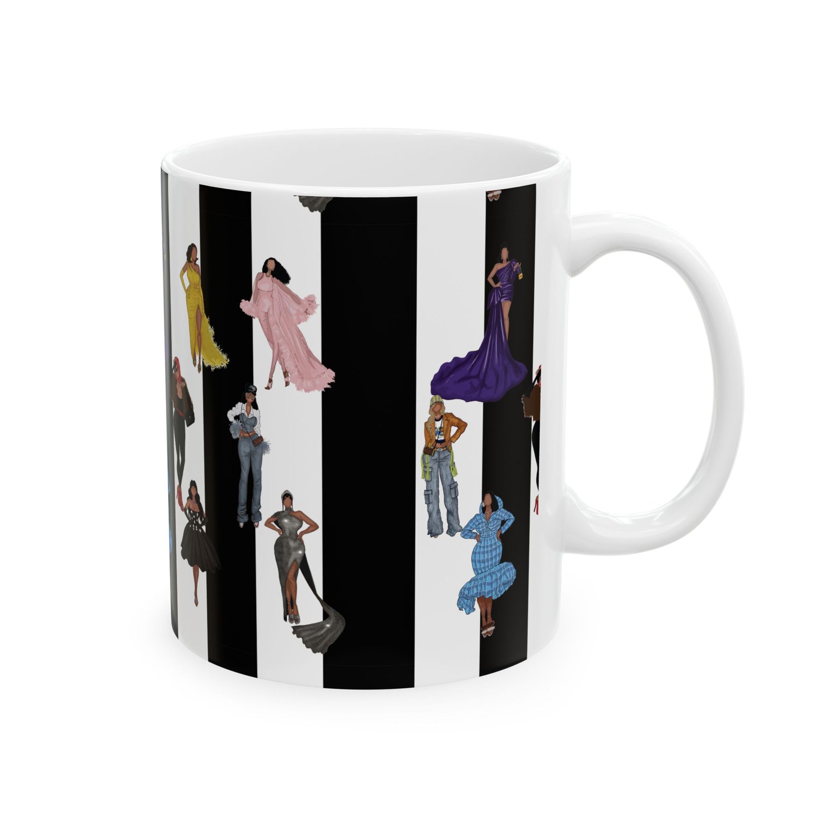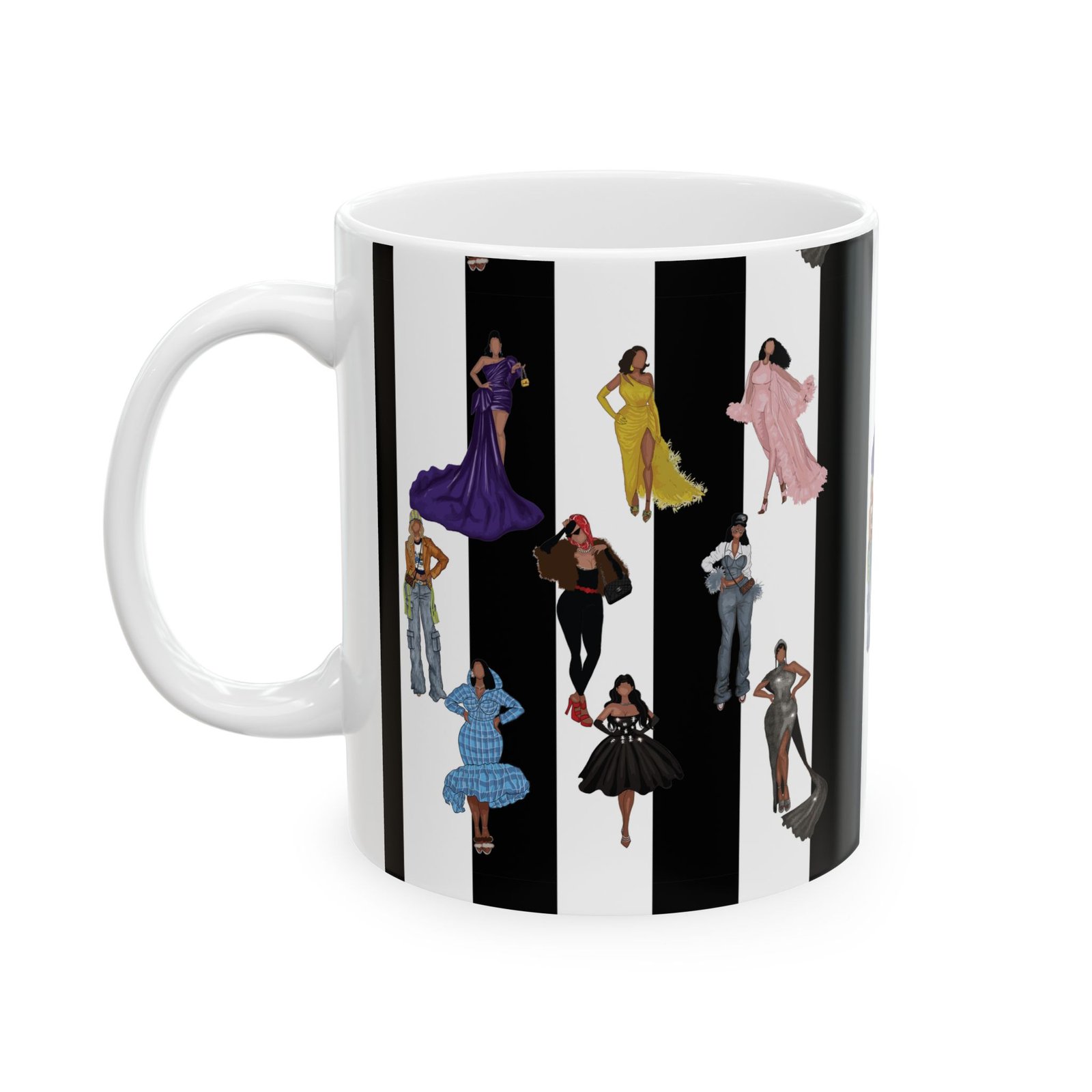 This 11oz ceramic mug brings a little runway energy to your morning ritual. Vertical black-and-white stripes wrap around the cup, punctuated by illustrations of stylish women in bold dresses and confident poses. It feels like a moment of sisterhood and style — a small, joyful reminder to stand tall while you sip coffee, tea, or cocoa. The smooth C-handle and rounded silhouette make it comfortable to hold; the bright print keeps its personality through everyday use. Use it on slow weekend mornings, while getting ready for a night out, or as a cheerful desk companion that quietly celebrates fashion and confidence.