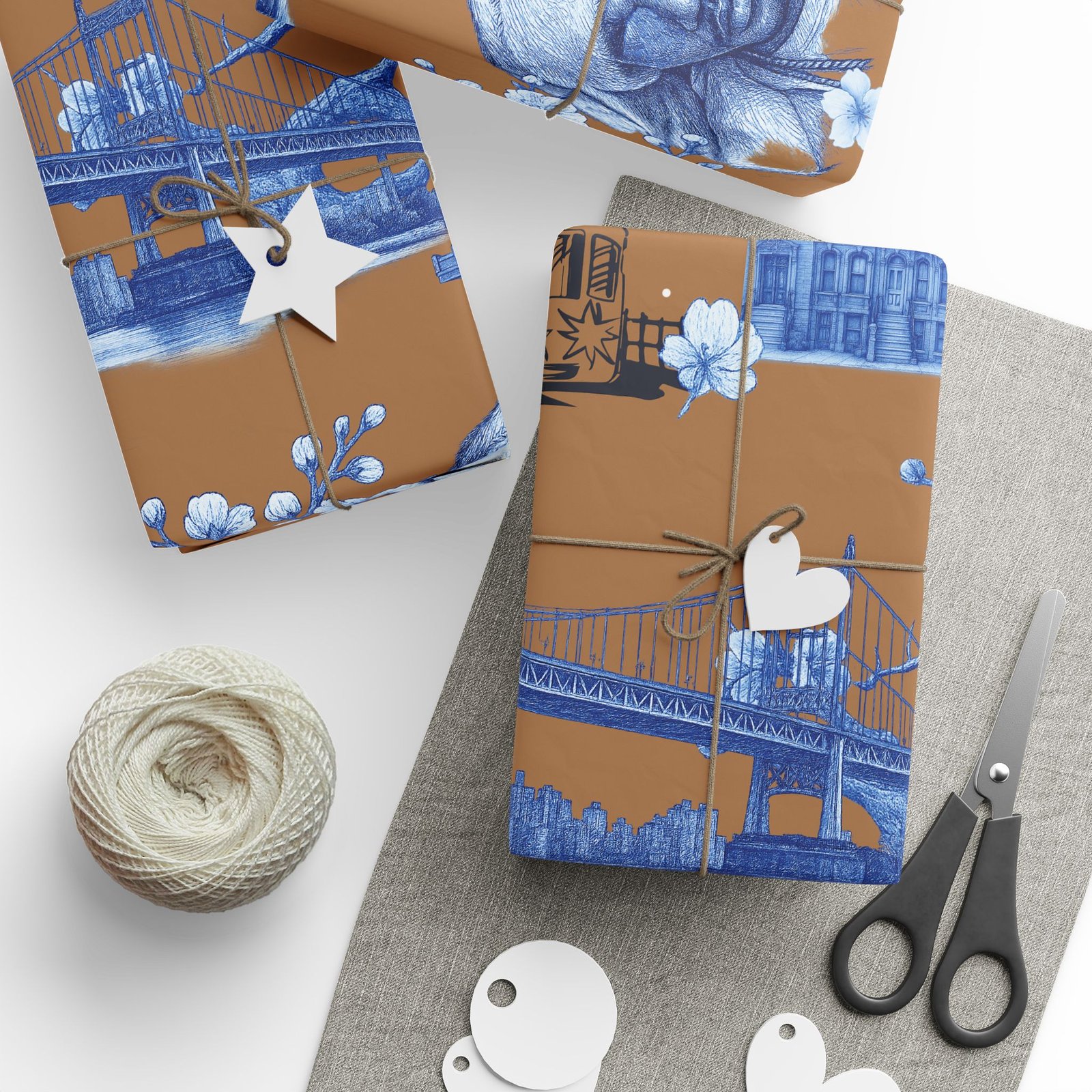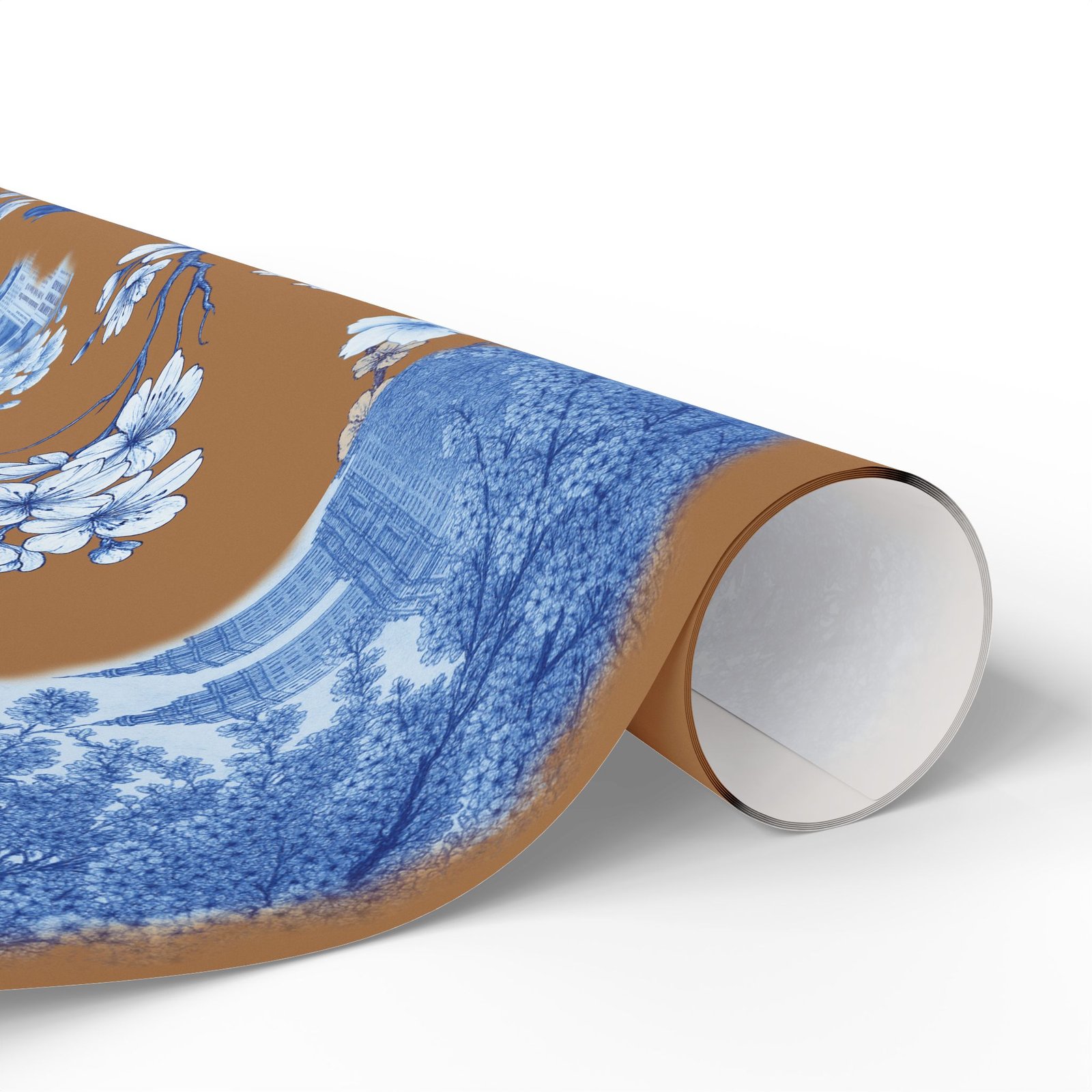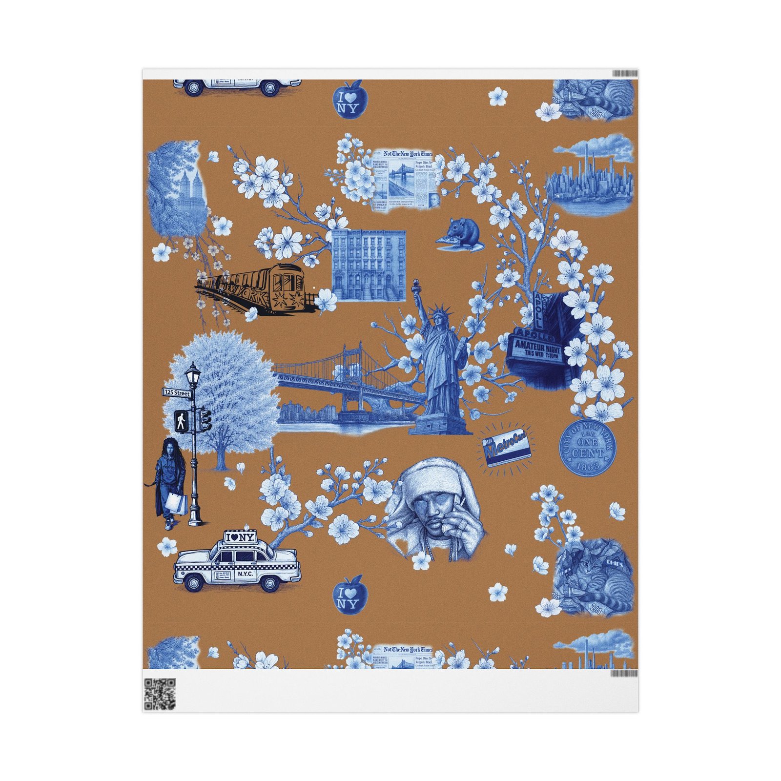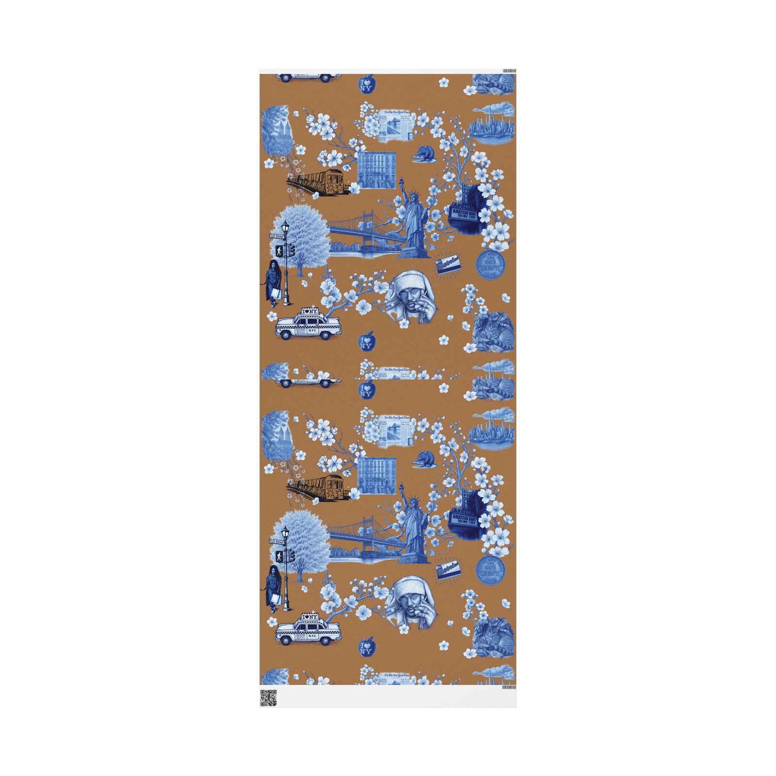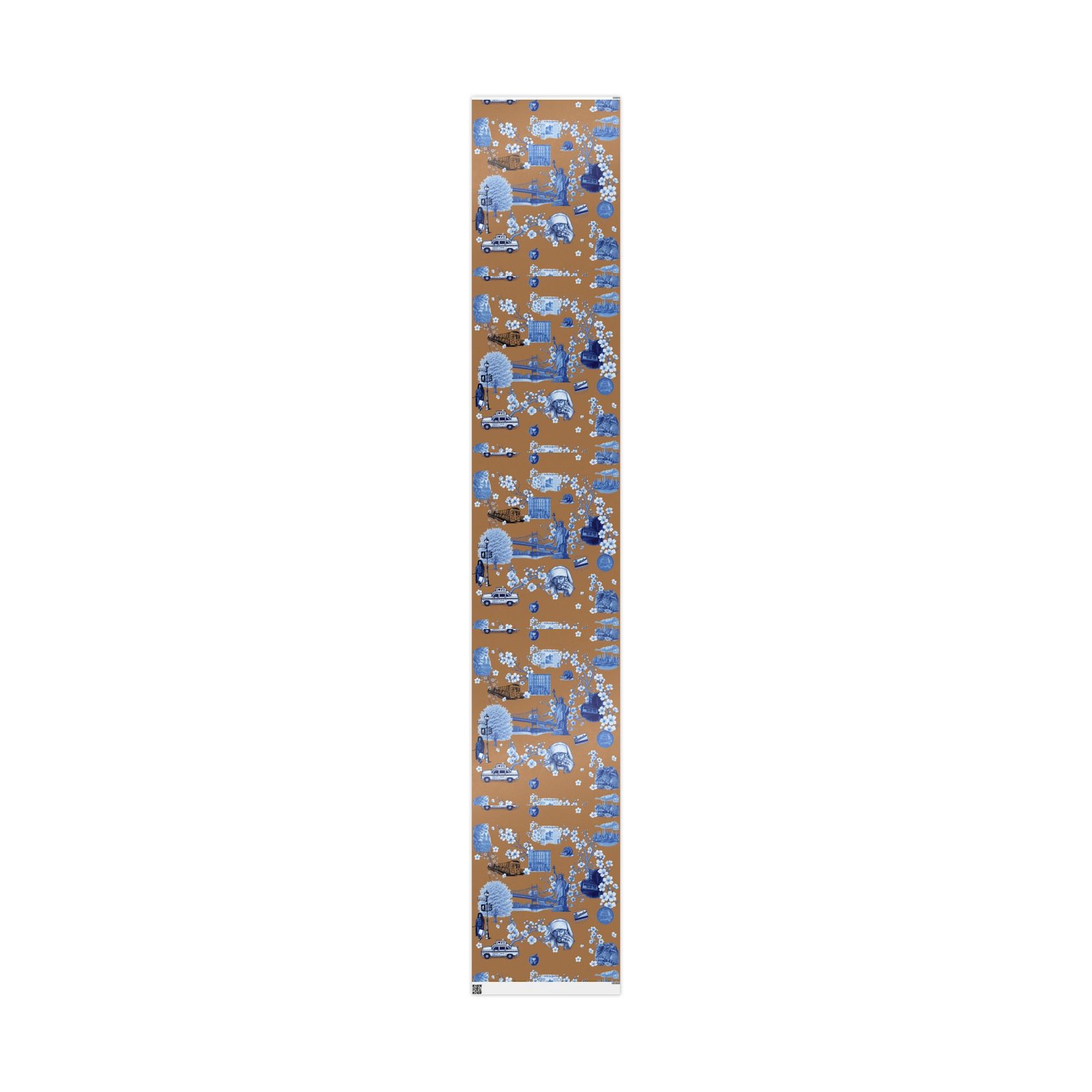 Wrap a gift in a storybook of city memories. This wrapping paper pairs warm caramel backgrounds with delicate blue-and-white illustrations—bridges, vintage taxis, neighborhood landmarks, and flowering branches—so every present arrives with a nostalgic, crafted feeling. Printed on heavyweight 90 gsm fine art paper in high-definition, the sheet lays smoothly around boxes and bundles, and you can choose between a glossy sheen that makes the colors pop or a matte finish for a softer, handcrafted look. Available in three sizes to suit small treasures or long, multi-gift runs; each roll prints on one side and includes a small white trim with a printed bar and QR code along the edge.
