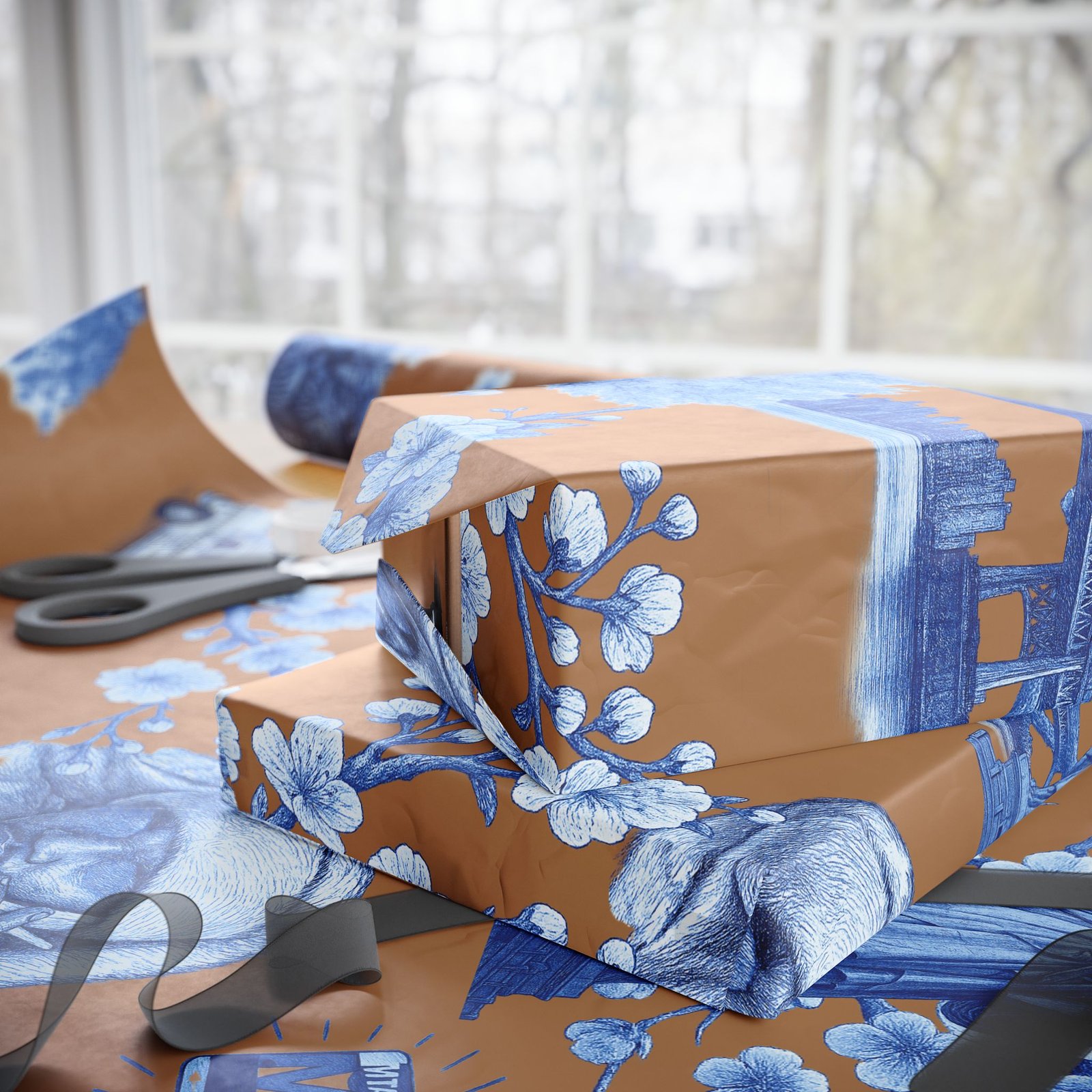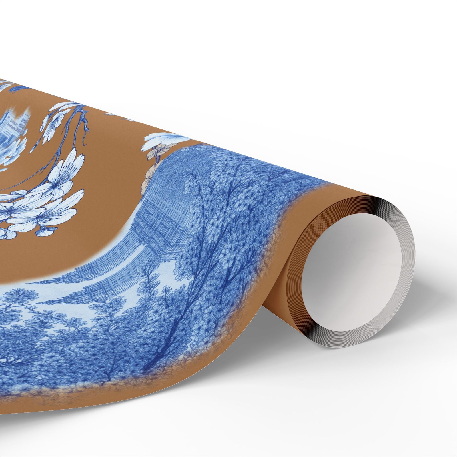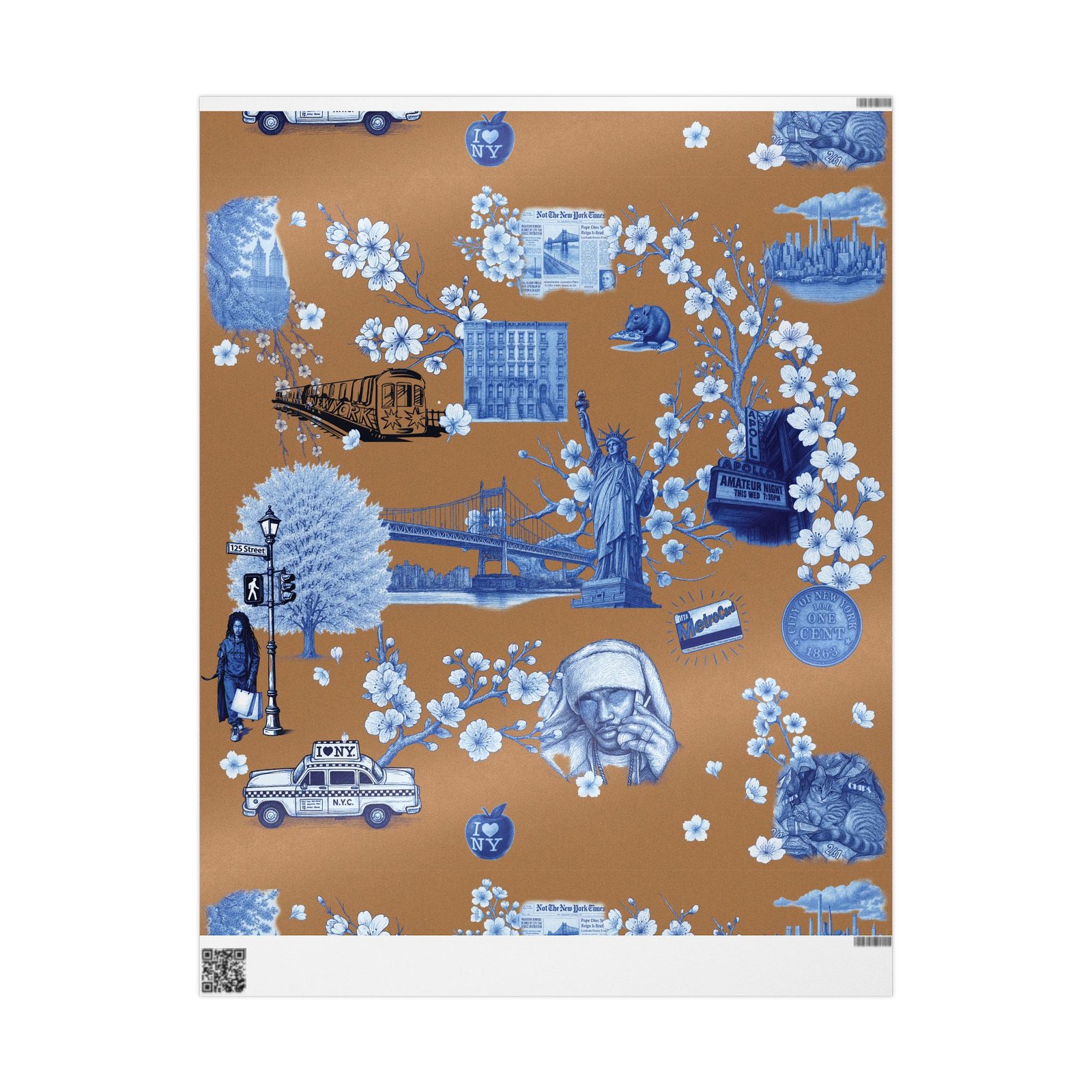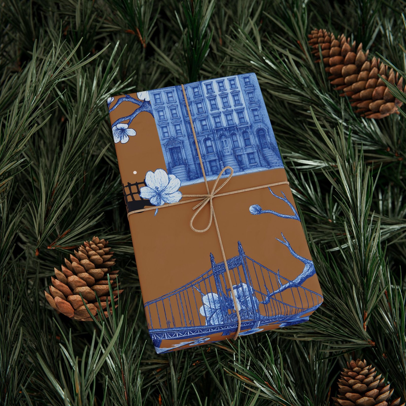 Wrap a gift in a storybook of city memories. This wrapping paper pairs warm caramel backgrounds with delicate blue-and-white illustrations—bridges, vintage taxis, neighborhood landmarks, and flowering branches—so every present arrives with a nostalgic, crafted feeling. Printed on heavyweight 90 gsm fine art paper in high-definition, the sheet lays smoothly around boxes and bundles, and you can choose between a glossy sheen that makes the colors pop or a matte finish for a softer, handcrafted look. Available in three sizes to suit small treasures or long, multi-gift runs; each roll prints on one side and includes a small white trim with a printed bar and QR code along the edge.