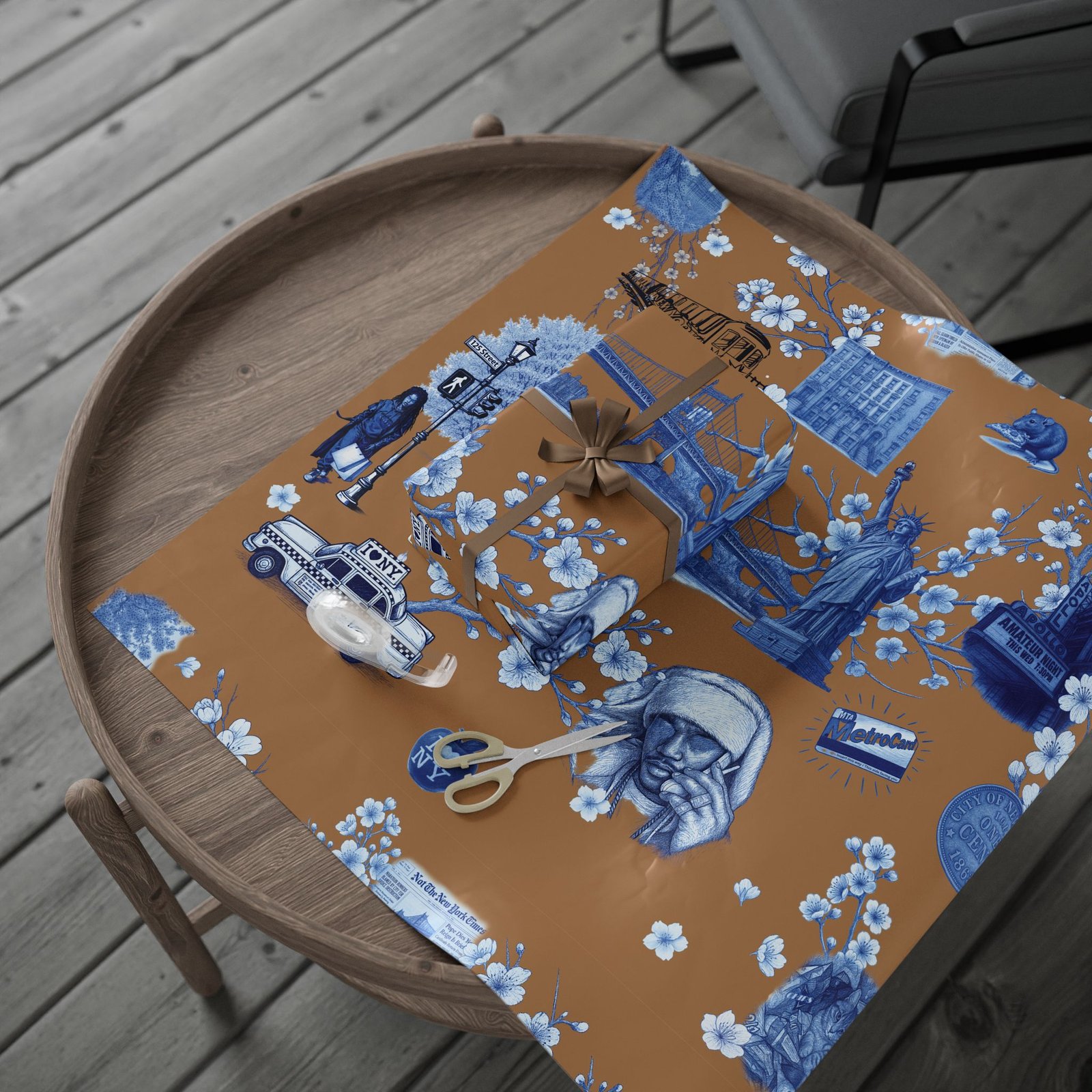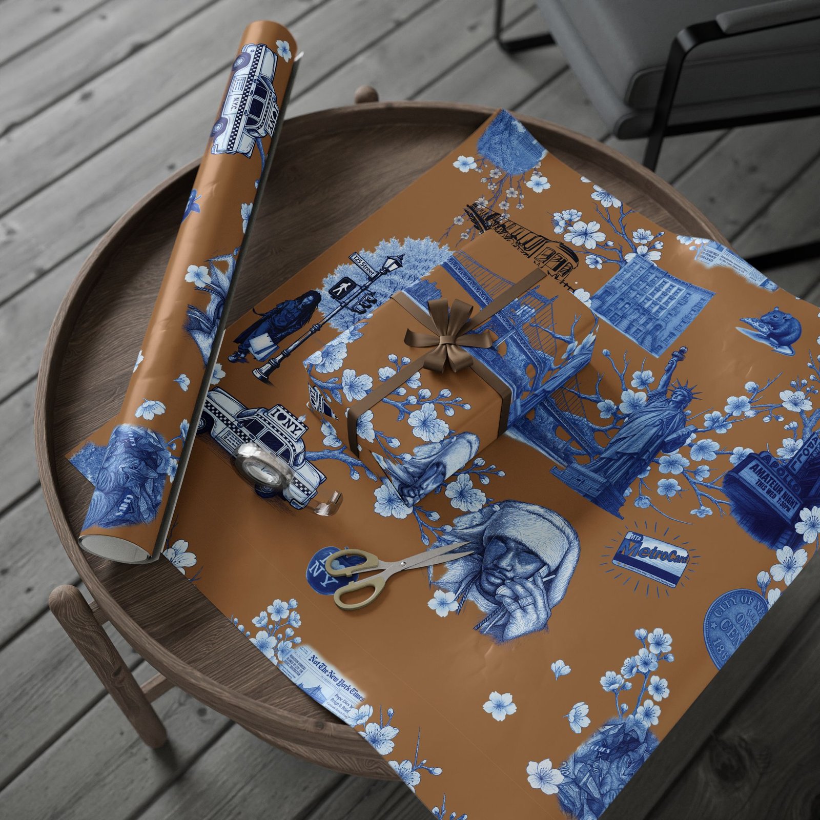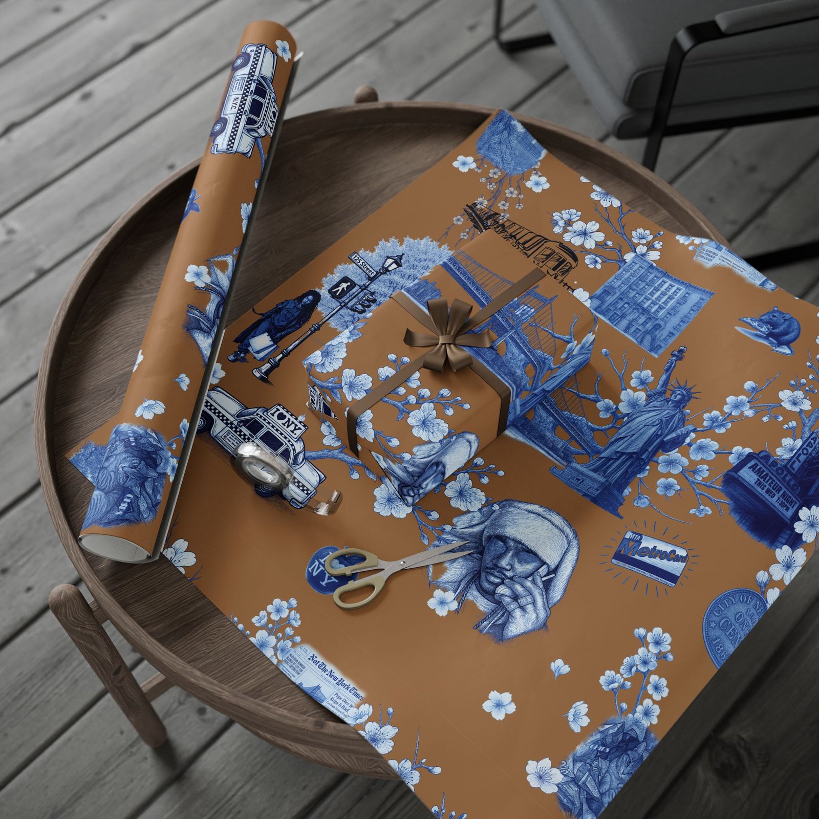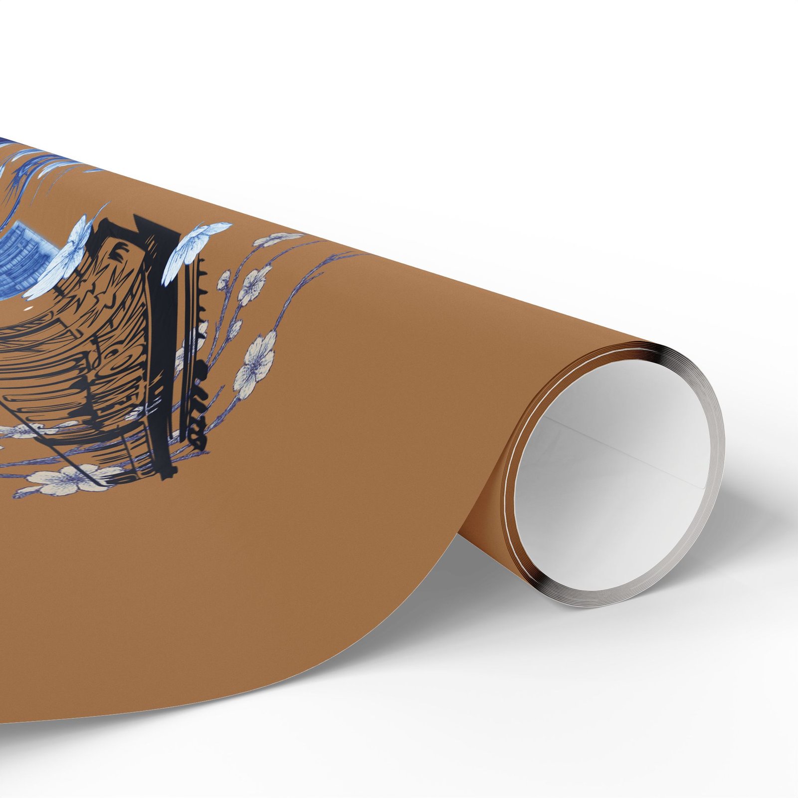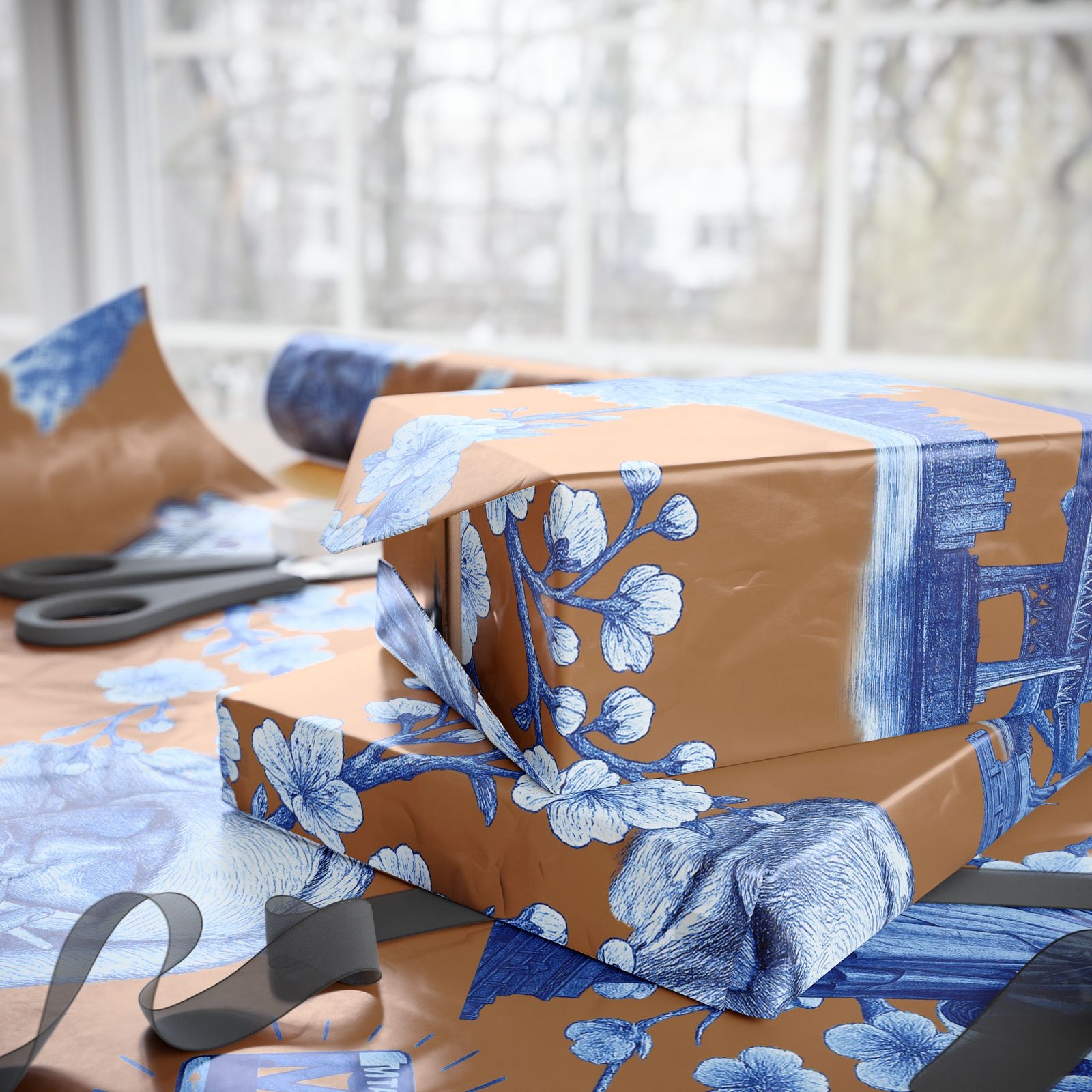 Wrap a gift in a storybook of city memories. This wrapping paper pairs warm caramel backgrounds with delicate blue-and-white illustrations—bridges, vintage taxis, neighborhood landmarks, and flowering branches—so every present arrives with a nostalgic, crafted feeling. Printed on heavyweight 90 gsm fine art paper in high-definition, the sheet lays smoothly around boxes and bundles, and you can choose between a glossy sheen that makes the colors pop or a matte finish for a softer, handcrafted look. Available in three sizes to suit small treasures or long, multi-gift runs; each roll prints on one side and includes a small white trim with a printed bar and QR code along the edge.