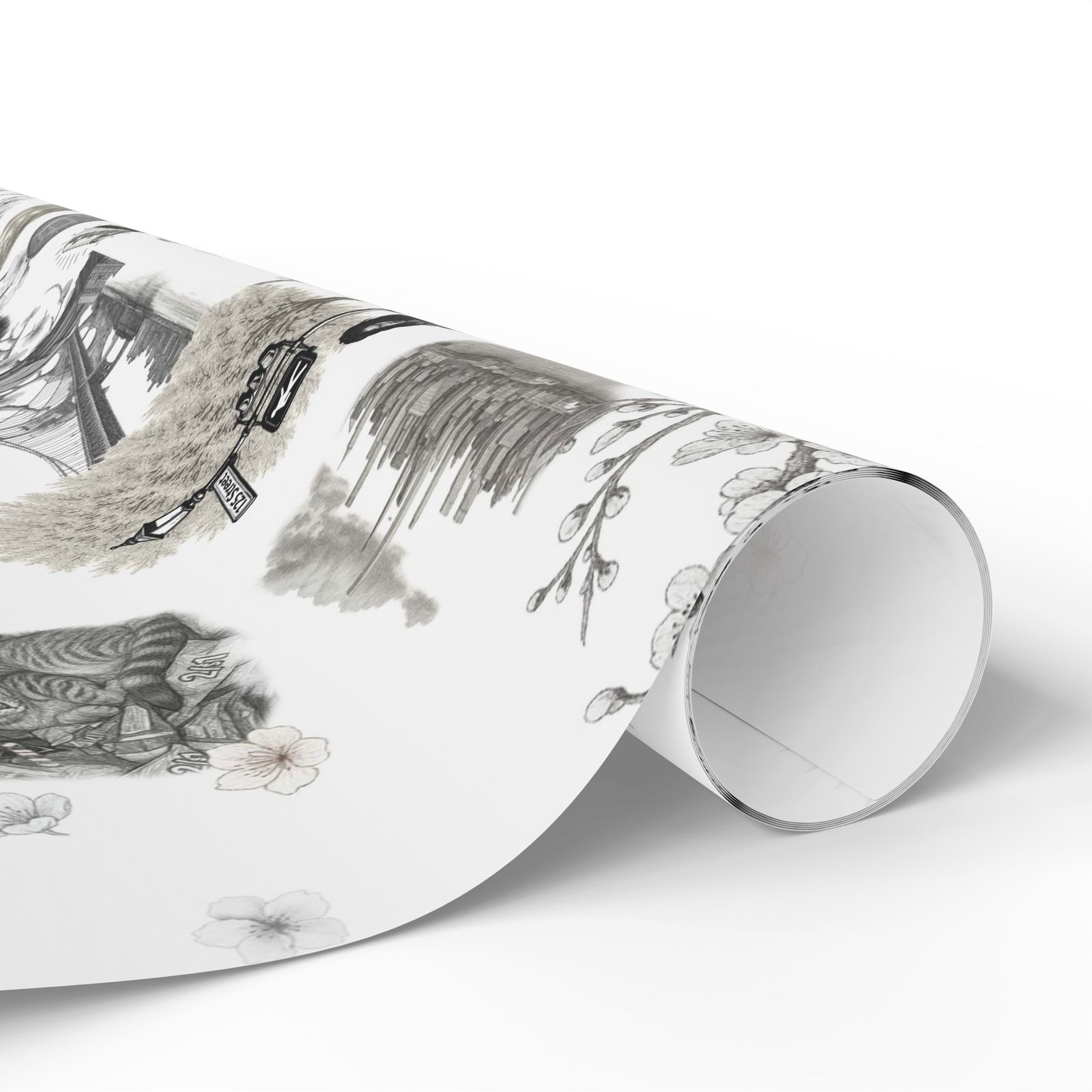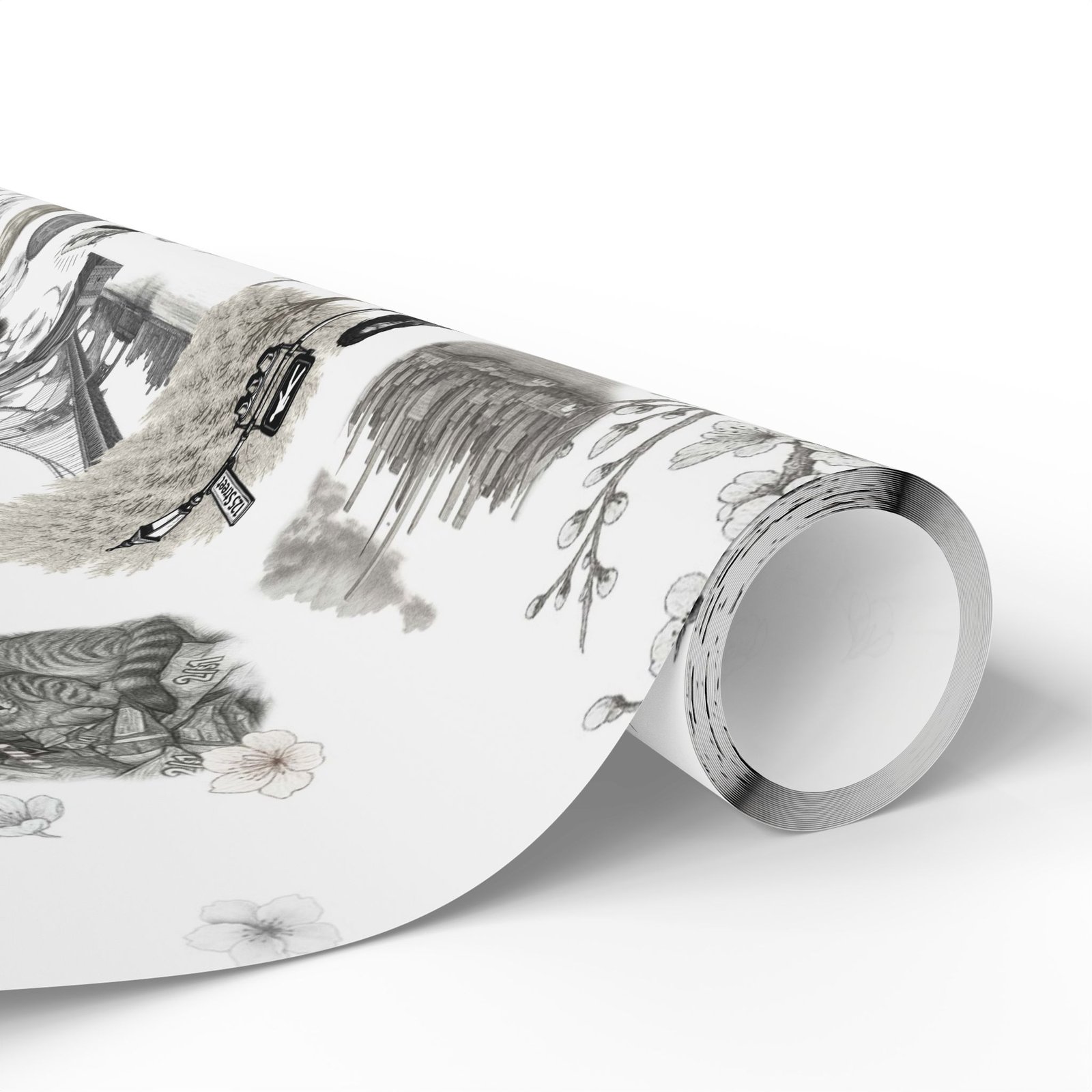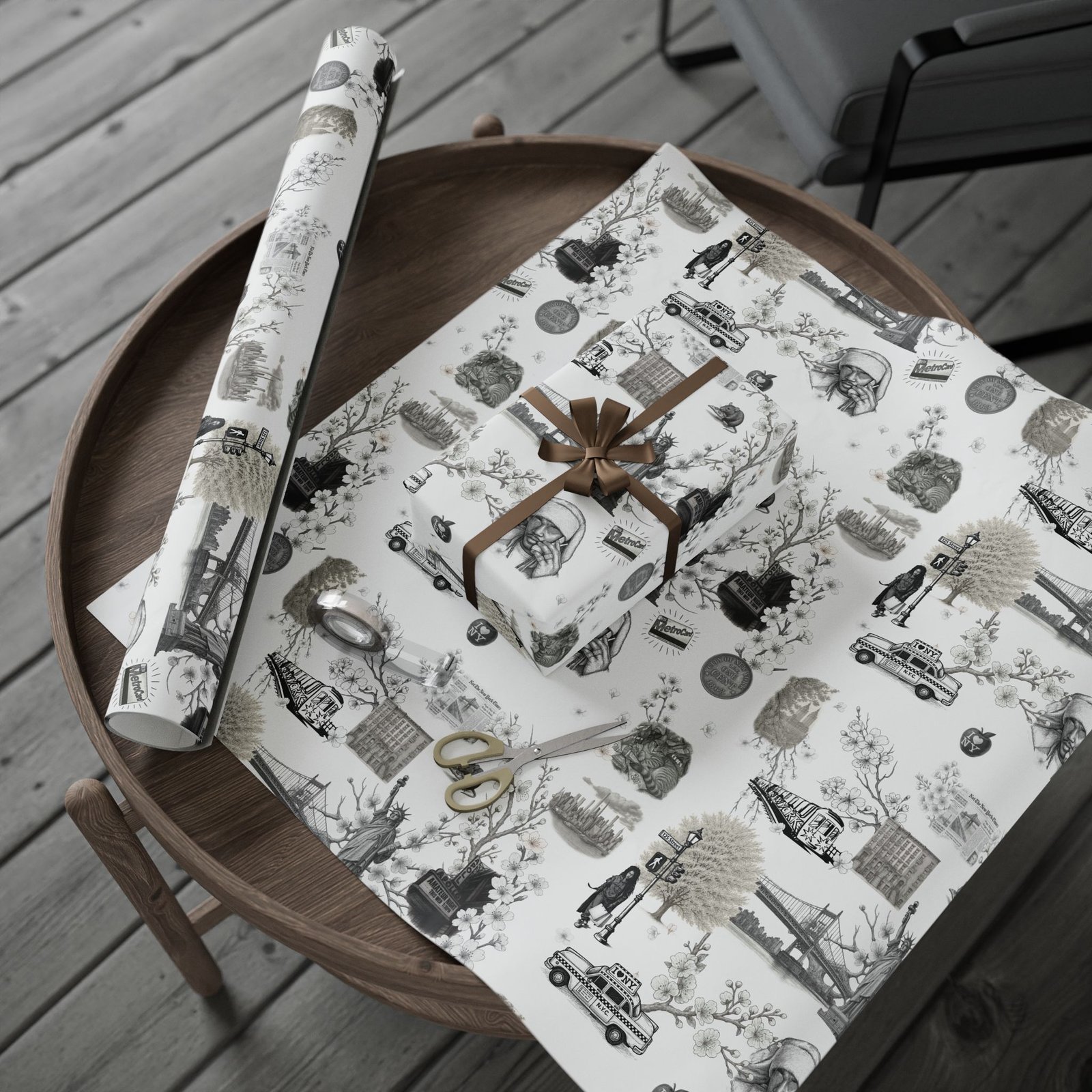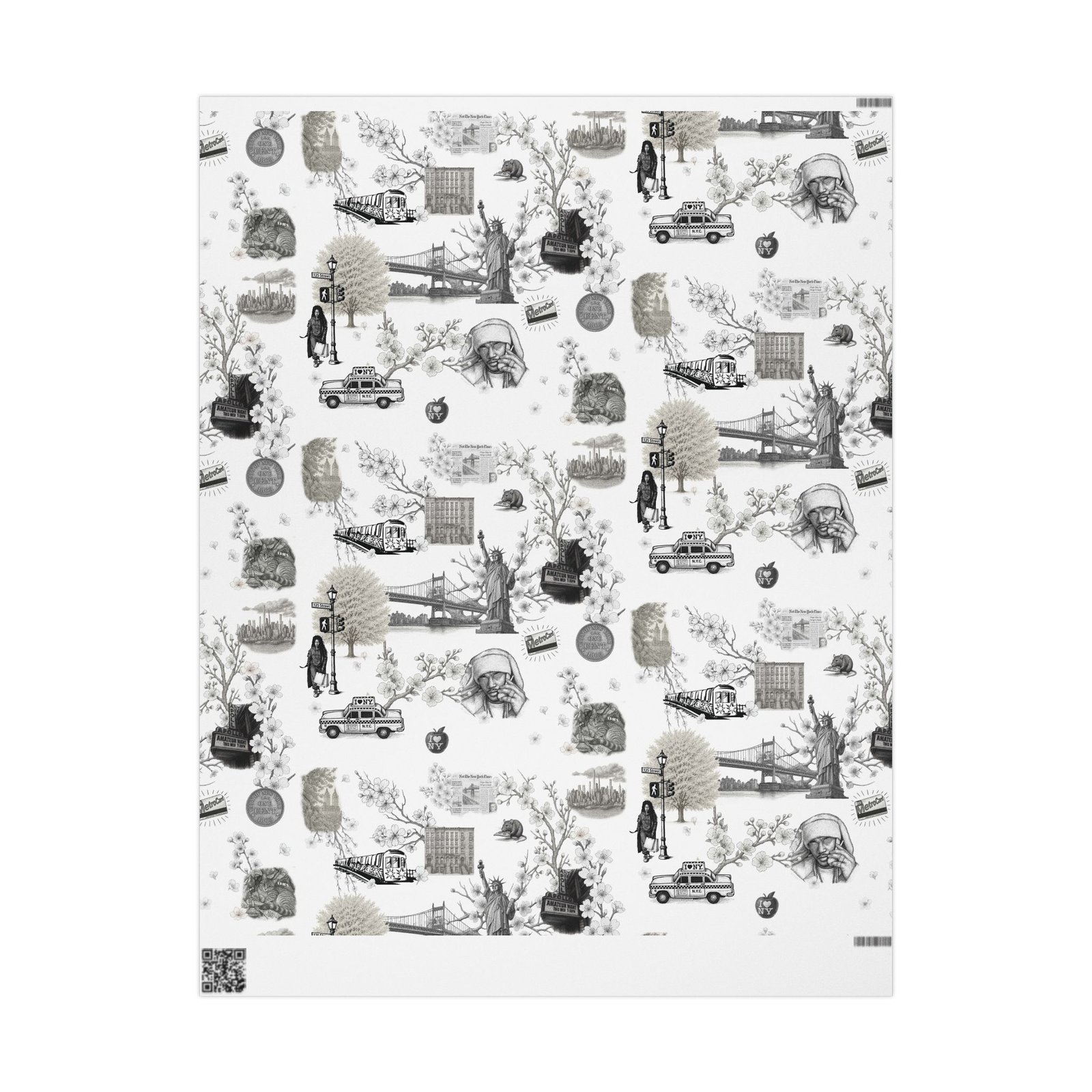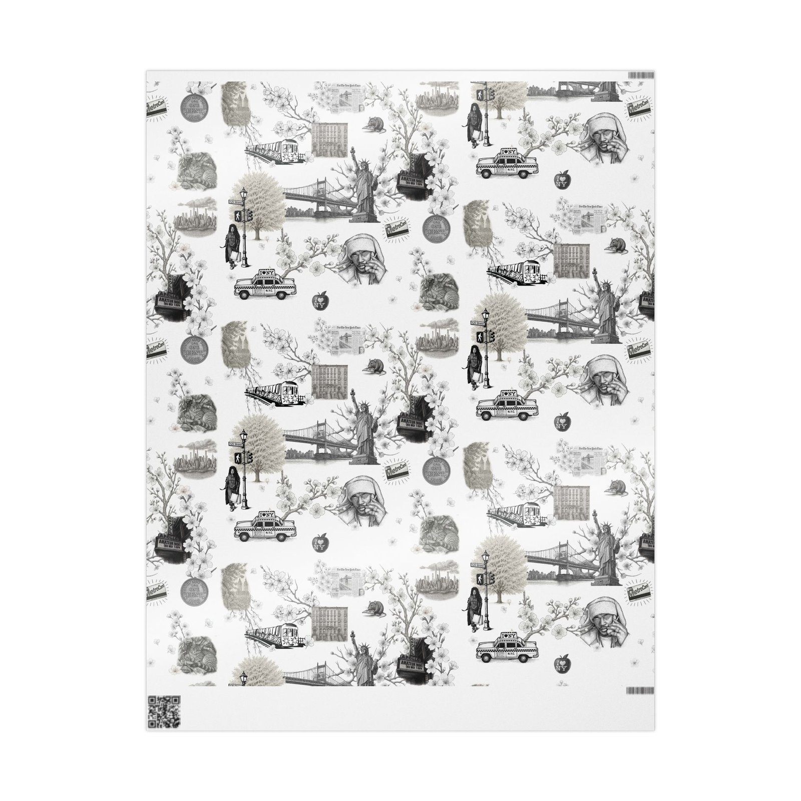 Soft cherry blossom branches delicately weave through gritty urban symbols subway trains, classic brownstones, the Queensboro Bridge, and the unmistakable MetroCard blurring the lines between raw edge and ethereal beauty. This isn’t just wrapping paper. It’s an immersive experience.