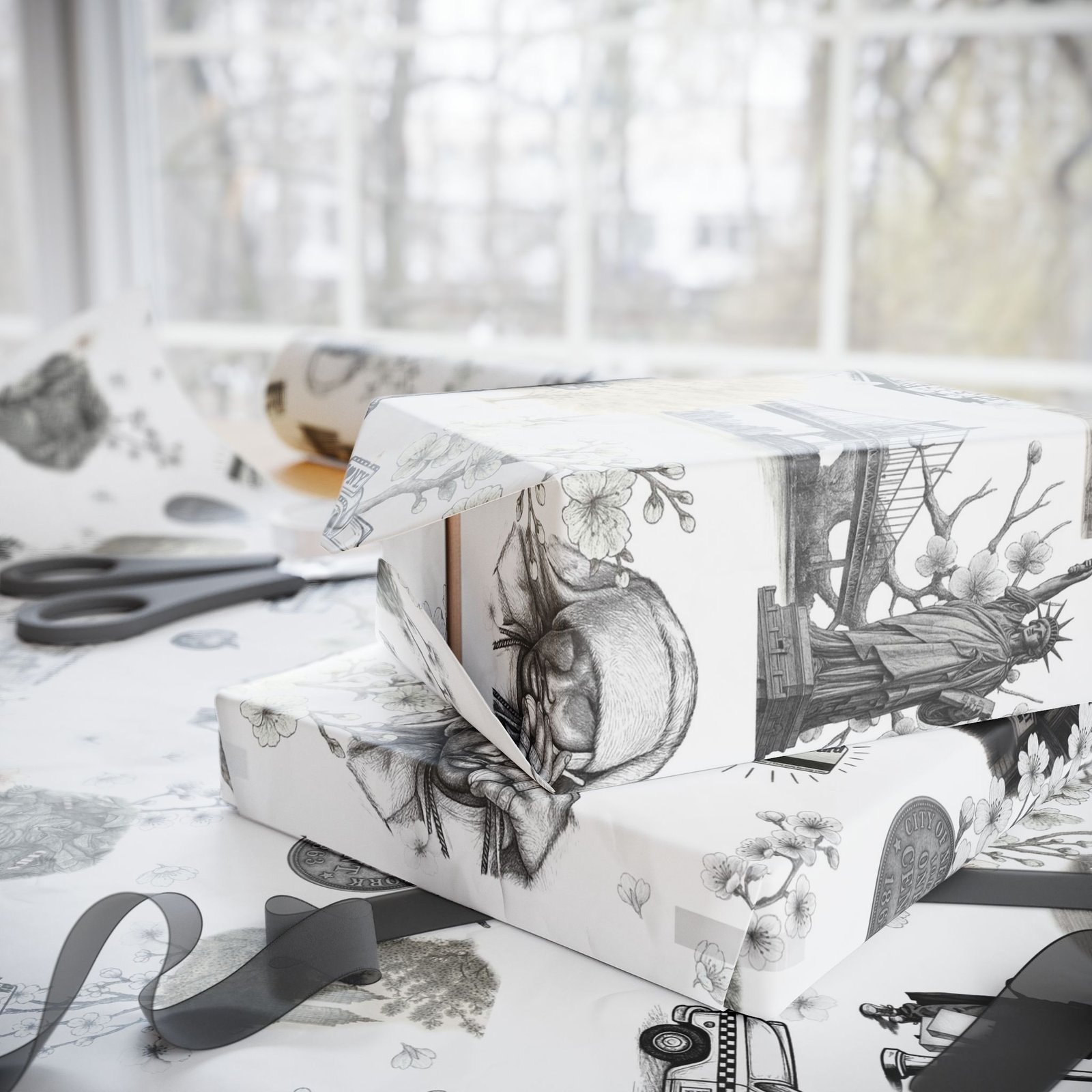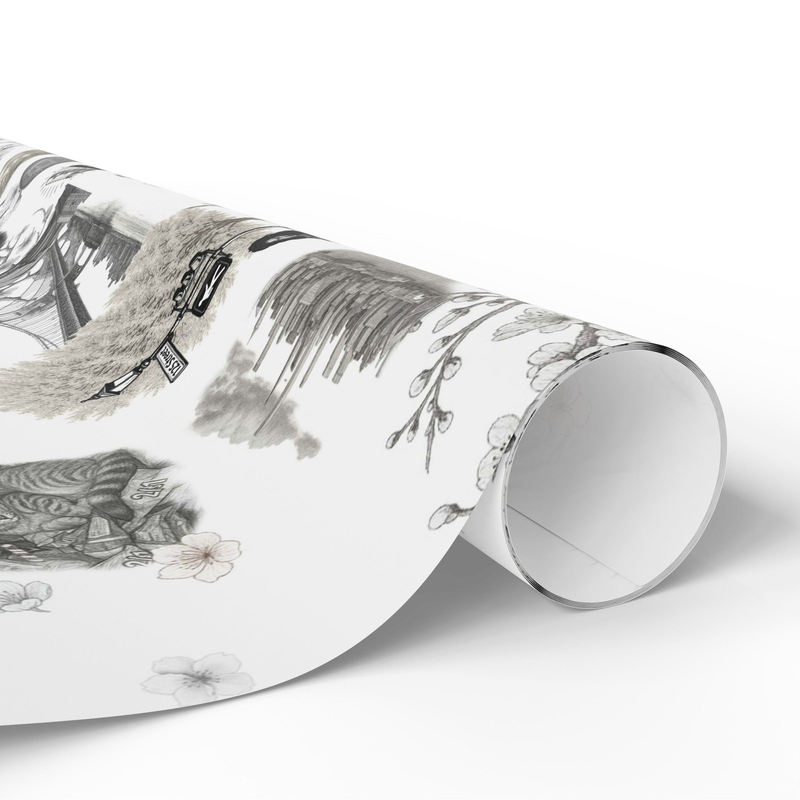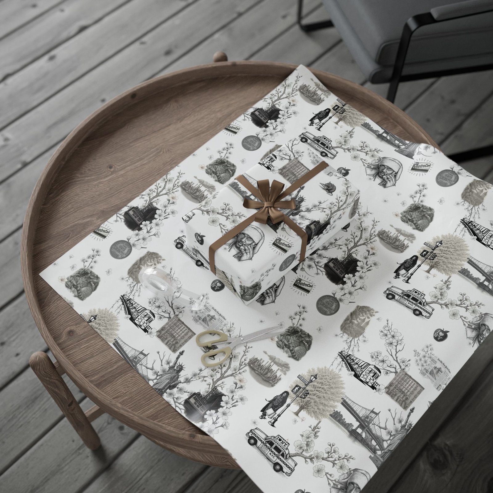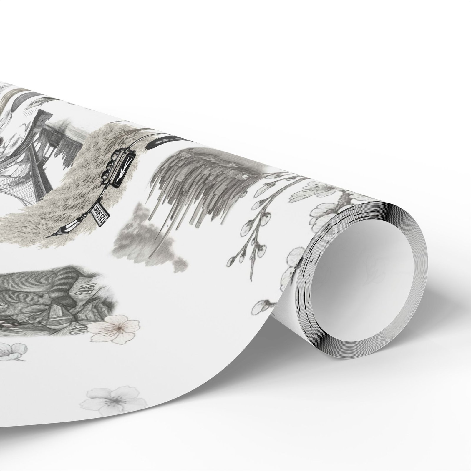 Soft cherry blossom branches delicately weave through gritty urban symbols subway trains, classic brownstones, the Queensboro Bridge, and the unmistakable MetroCard blurring the lines between raw edge and ethereal beauty. This isn’t just wrapping paper. It’s an immersive experience.