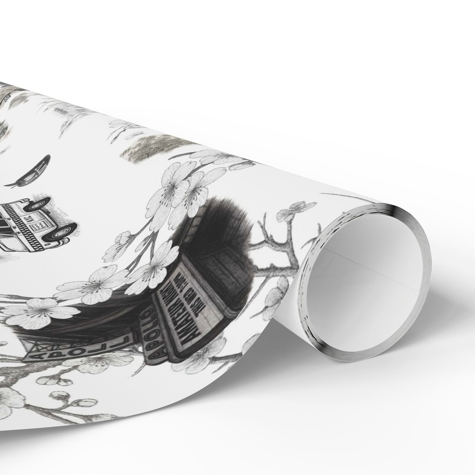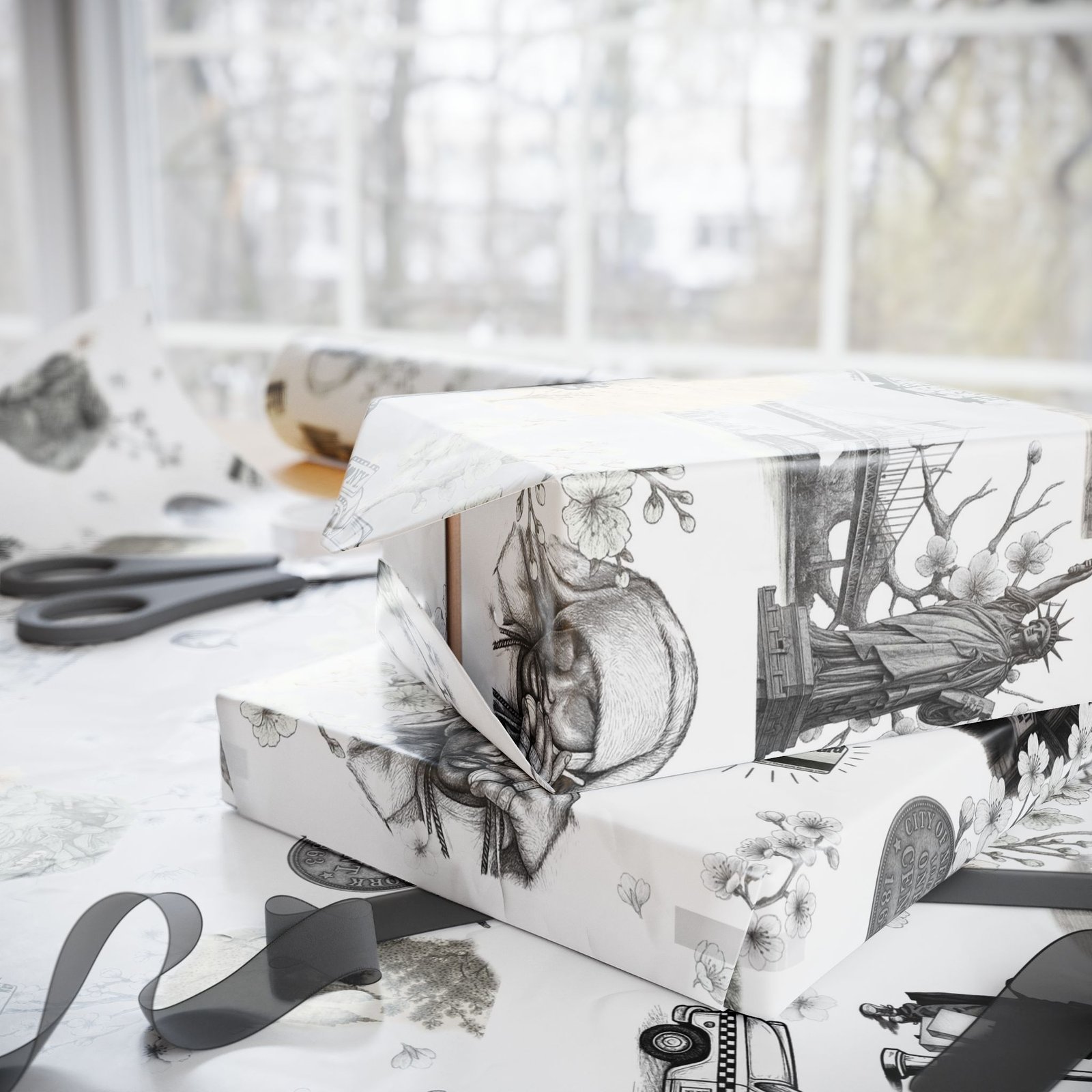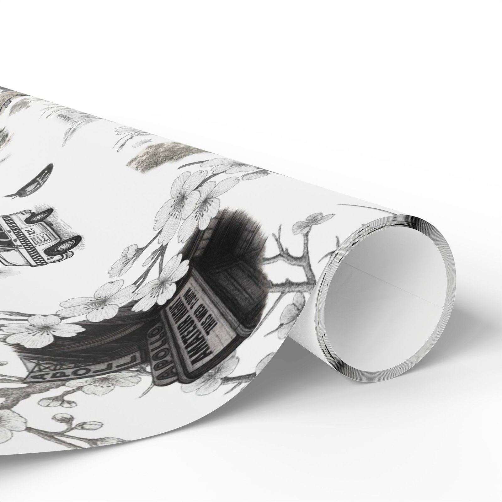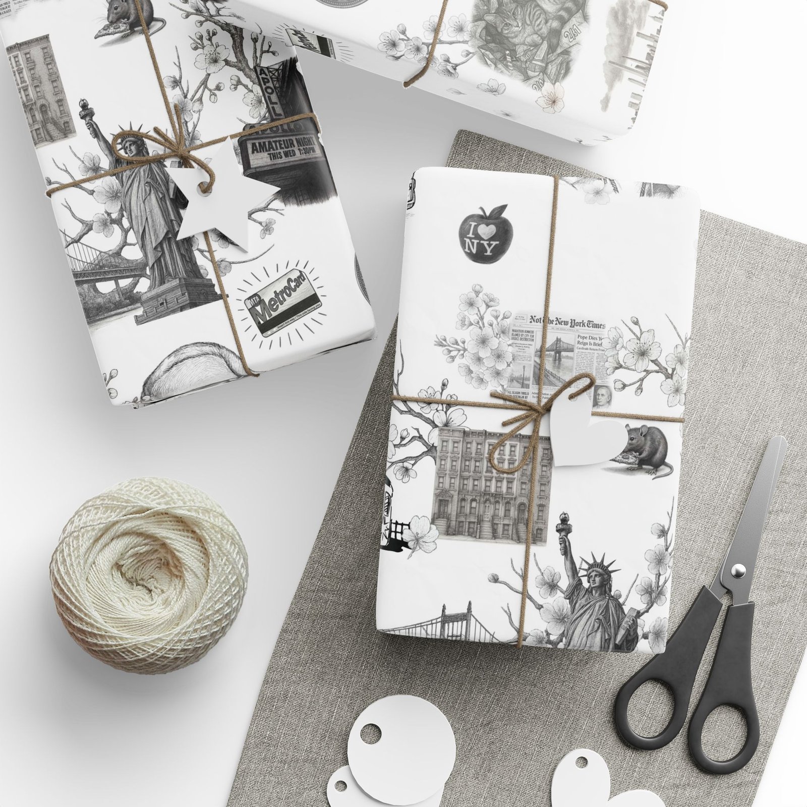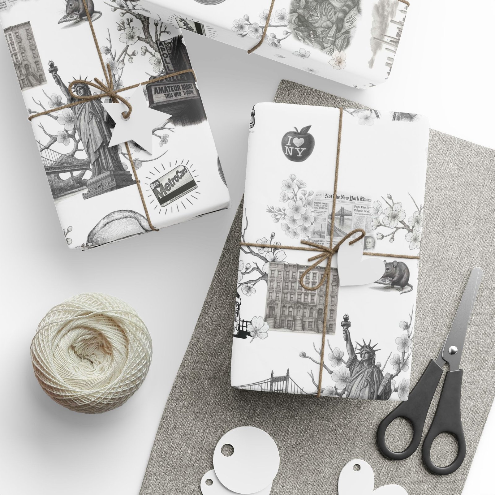 Soft cherry blossom branches delicately weave through gritty urban symbols subway trains, classic brownstones, the Queensboro Bridge, and the unmistakable MetroCard blurring the lines between raw edge and ethereal beauty. This isn’t just wrapping paper. It’s an immersive experience.