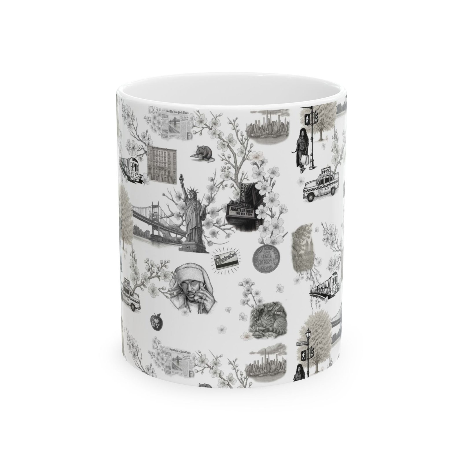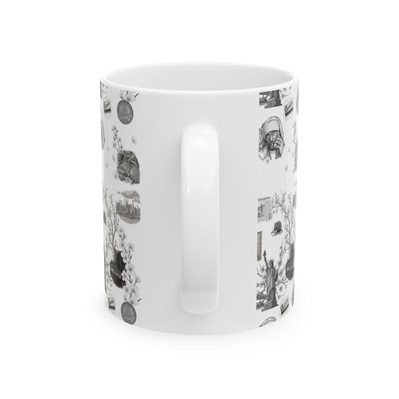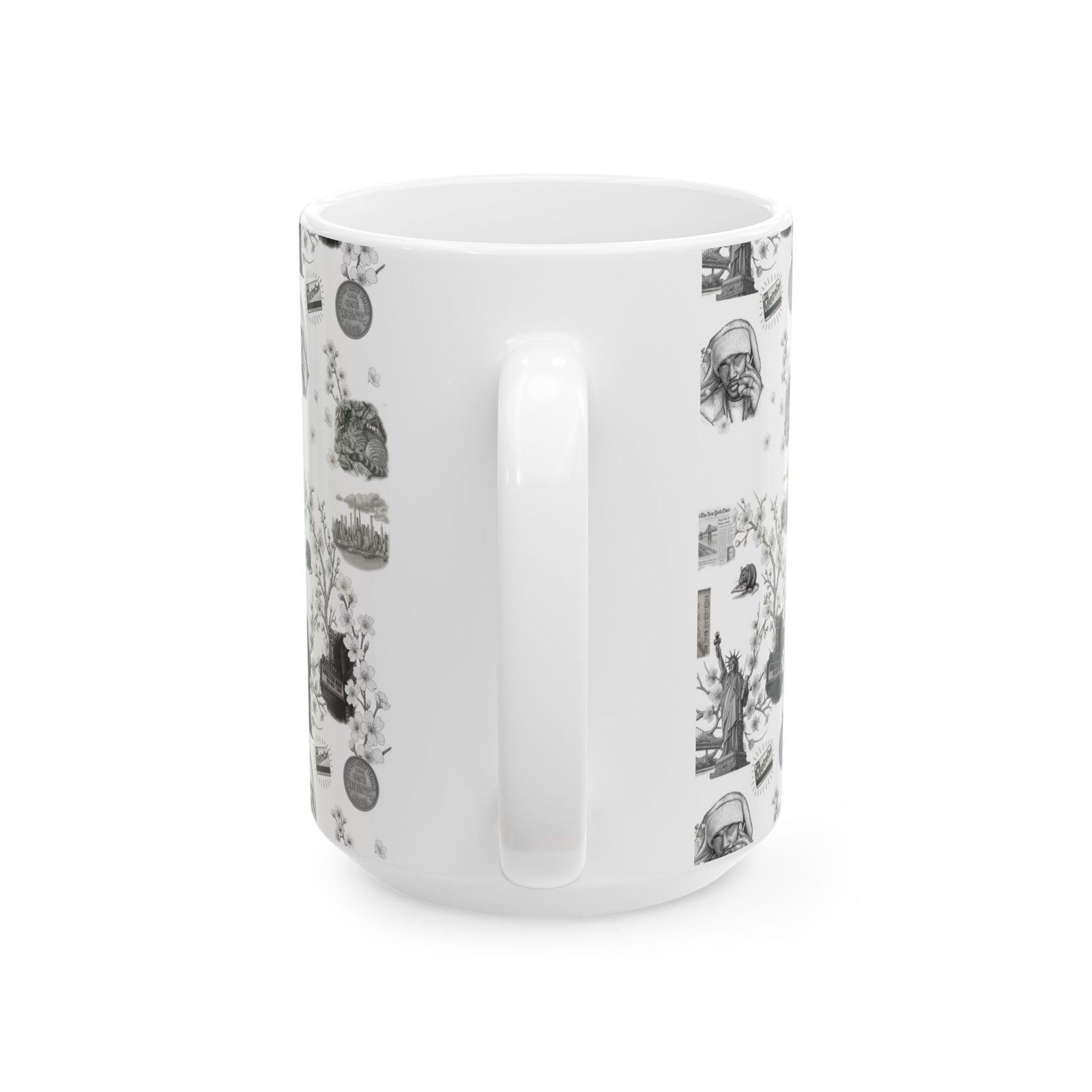 This ceramic mug brings quiet nostalgia to everyday mornings. A soft, monochrome collage wraps the glossy white surface — tiny illustrated scenes, vintage objects, and gentle textures that invite a slower breath between sips. It feels like a comforting pause: hands around a warm mug, steam rising, memories surfacing. For those who collect little moments — journaling sessions, early work calls, or weekend reading — this mug blends into a calm ritual. The compact 11oz or roomy 15oz size fits different routines, while the bright, durable print and shiny finish keep the artwork clear through daily use.