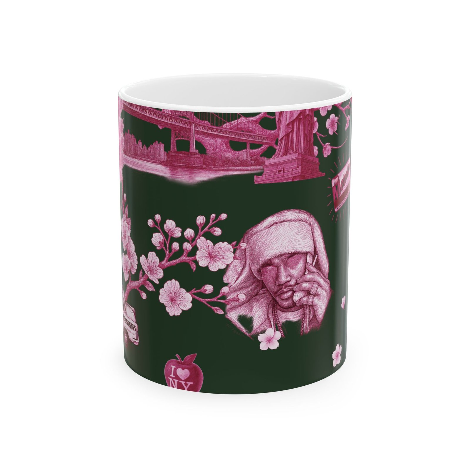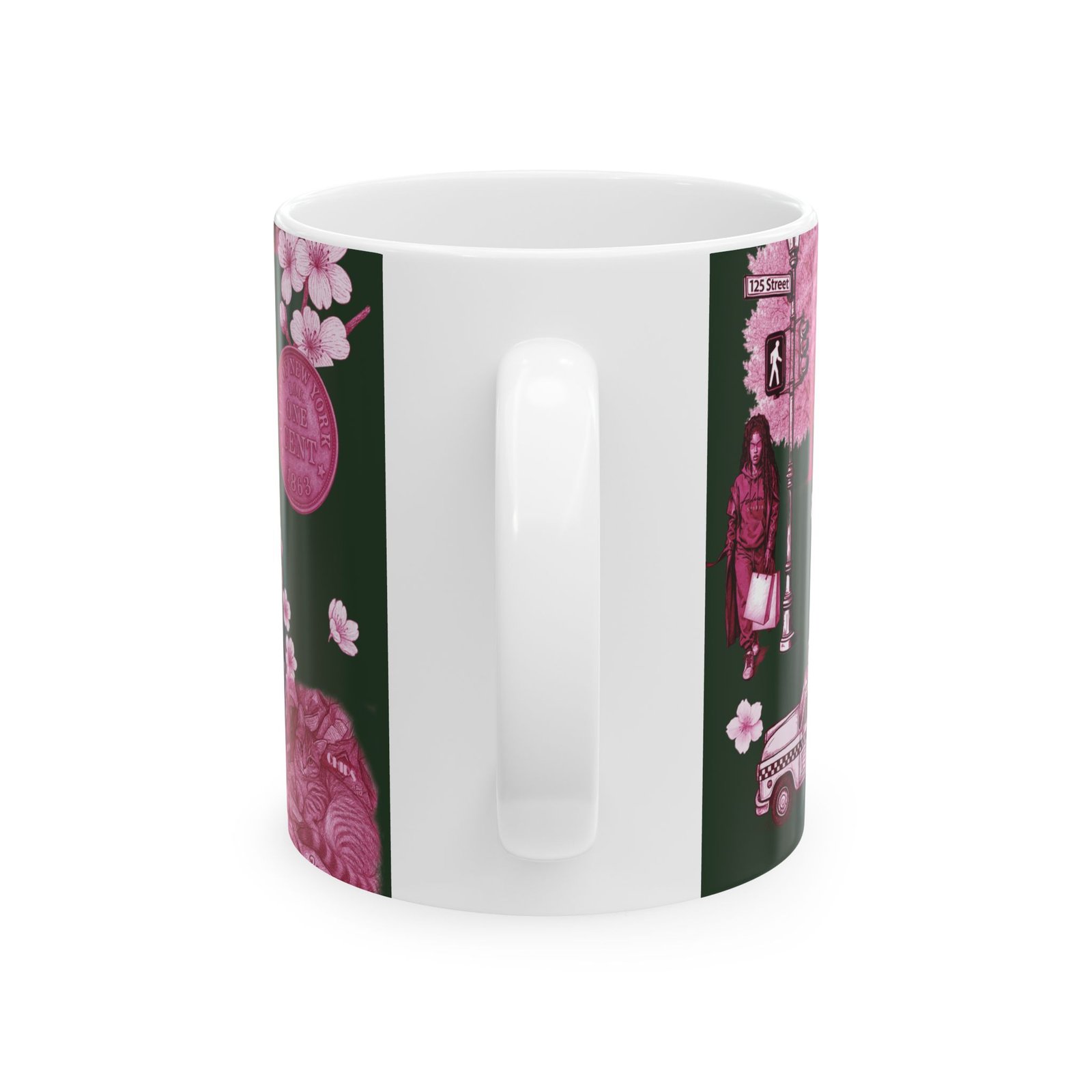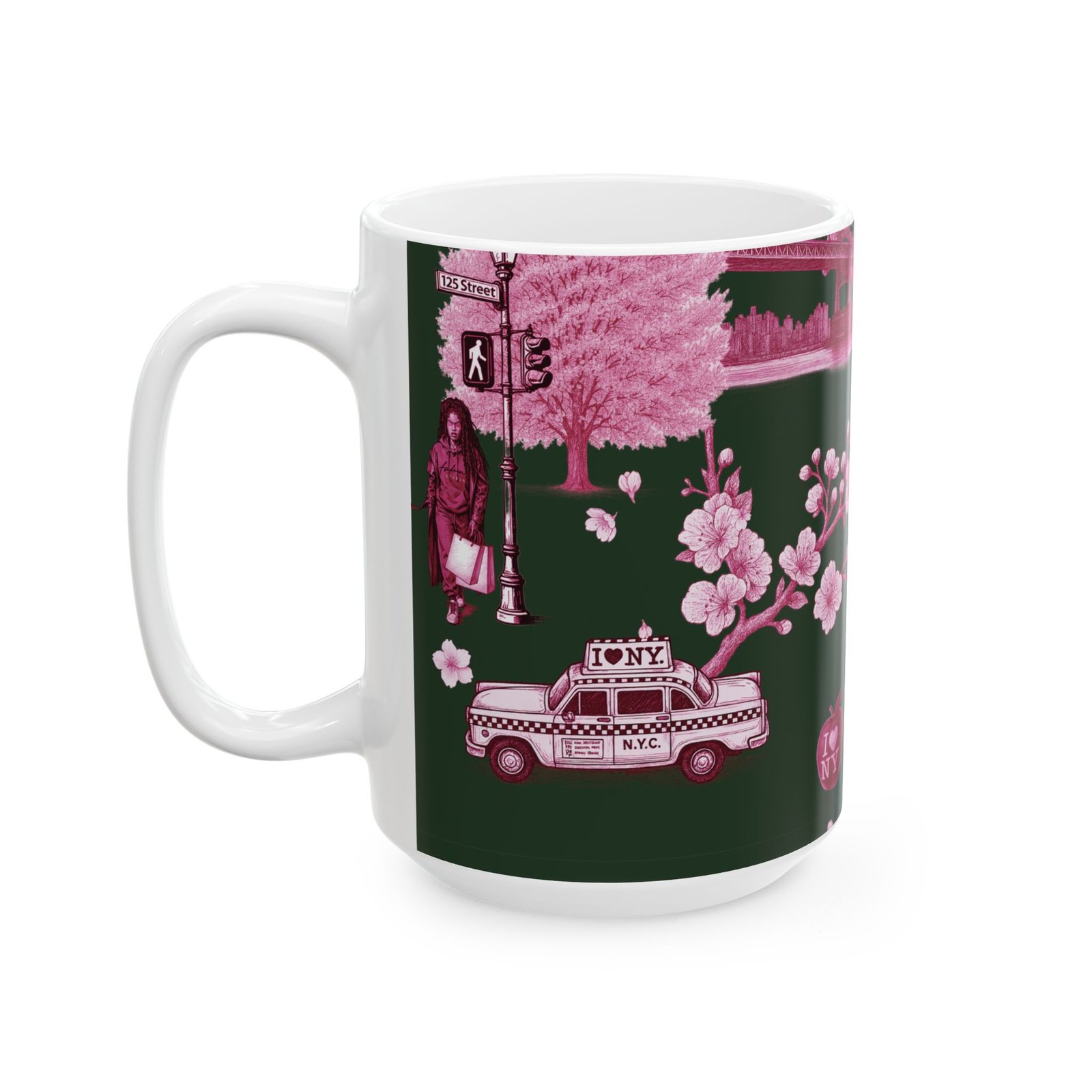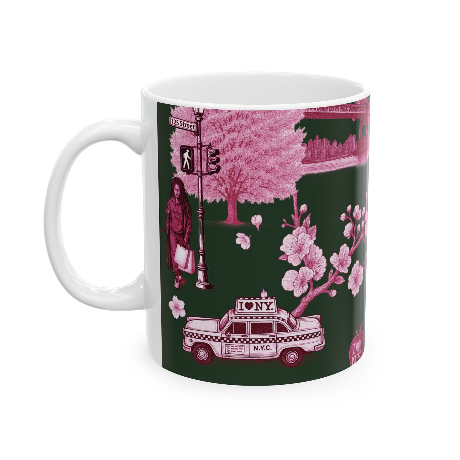 Steam rises from a city morning — warm coffee in hand, neon-pink blossoms soft against a deep forest backdrop. This 11 oz ceramic mug carries a small-city romance: skyline motifs, a classic taxi, and quiet park scenes rendered in moody pinks. It feels like a walk through early spring streets, phone tucked away, noticing the little scenes that make a neighborhood feel like home. For someone who treasures urban quiet, dusk walks, and the slow ritual of a morning brew, this mug brings that feeling to the kitchen counter.