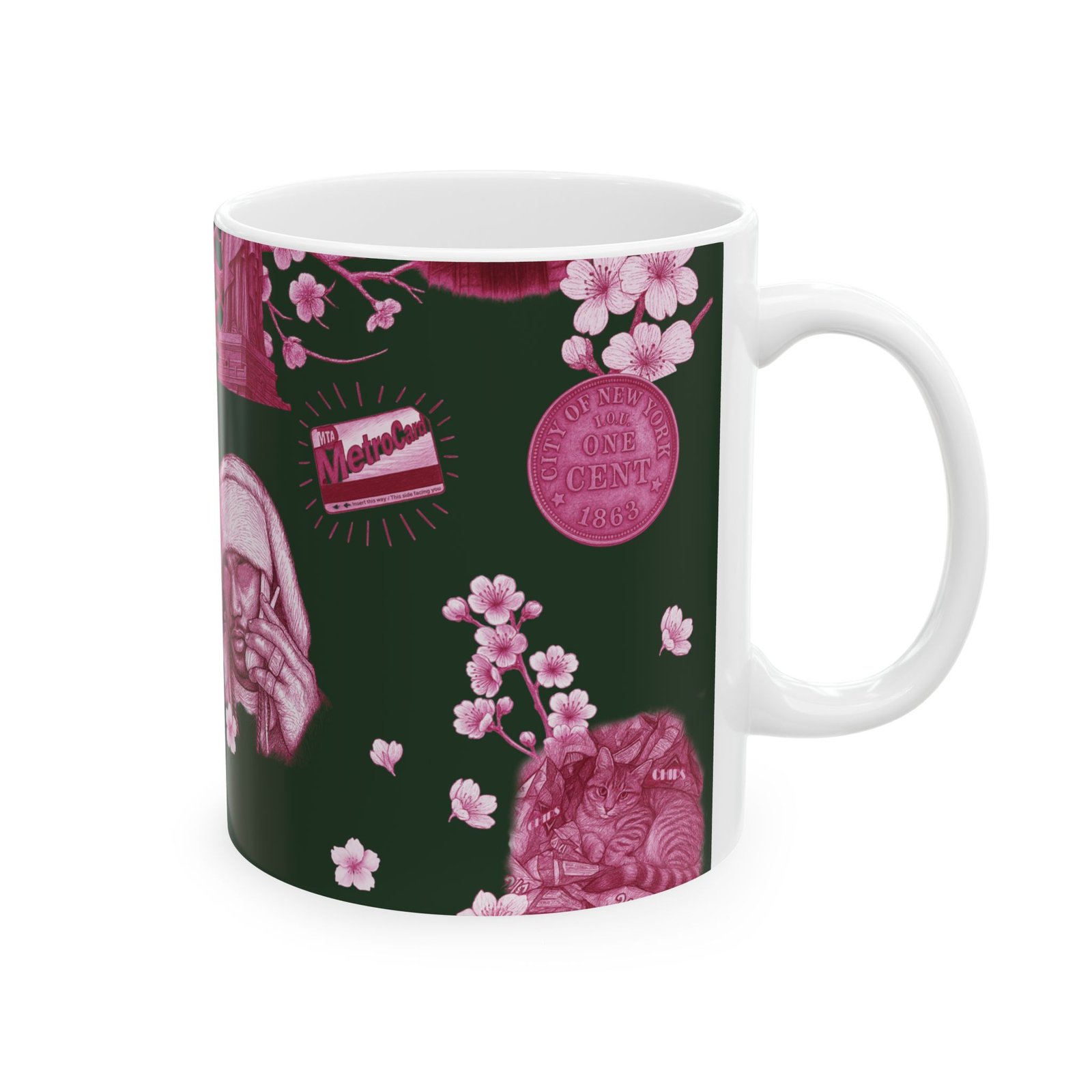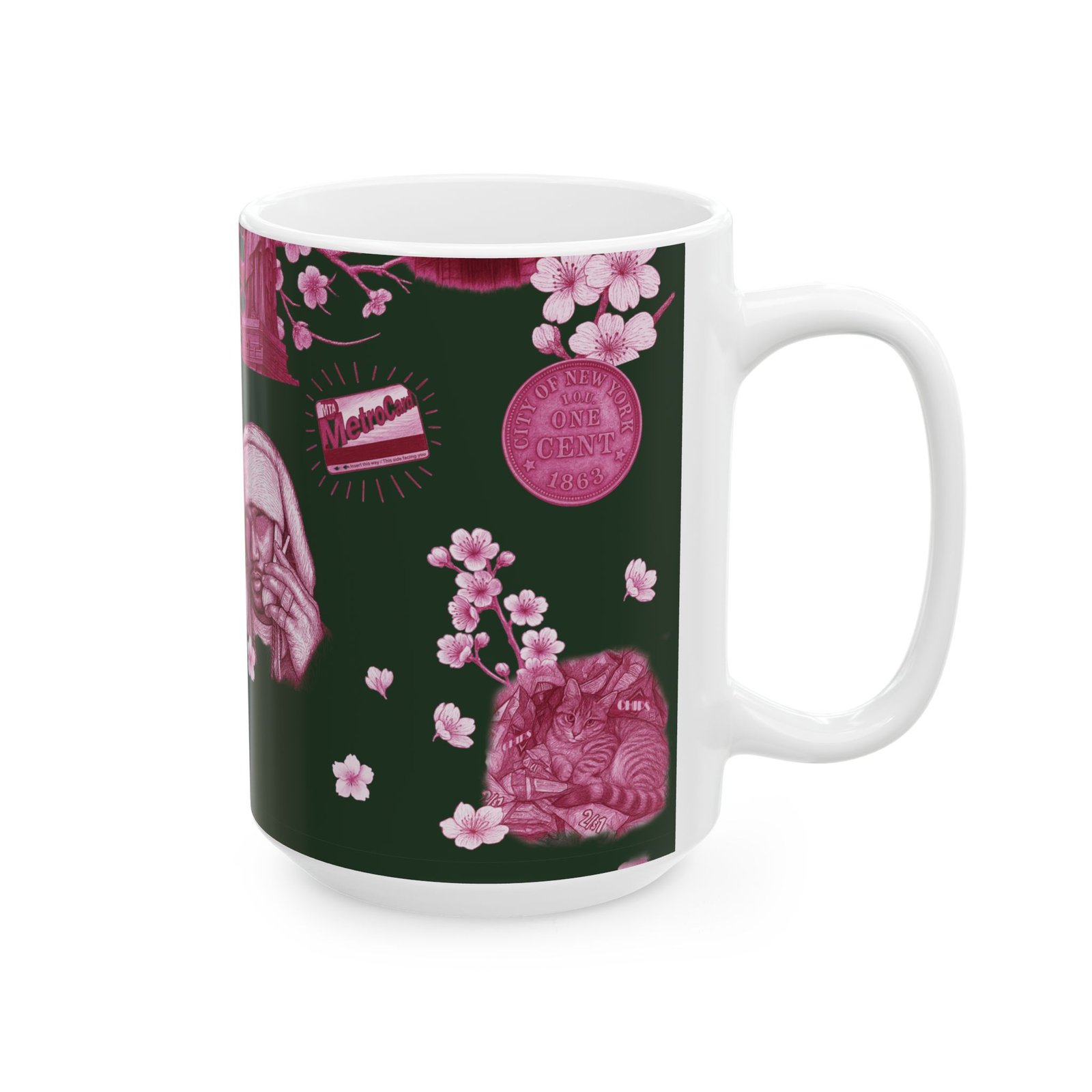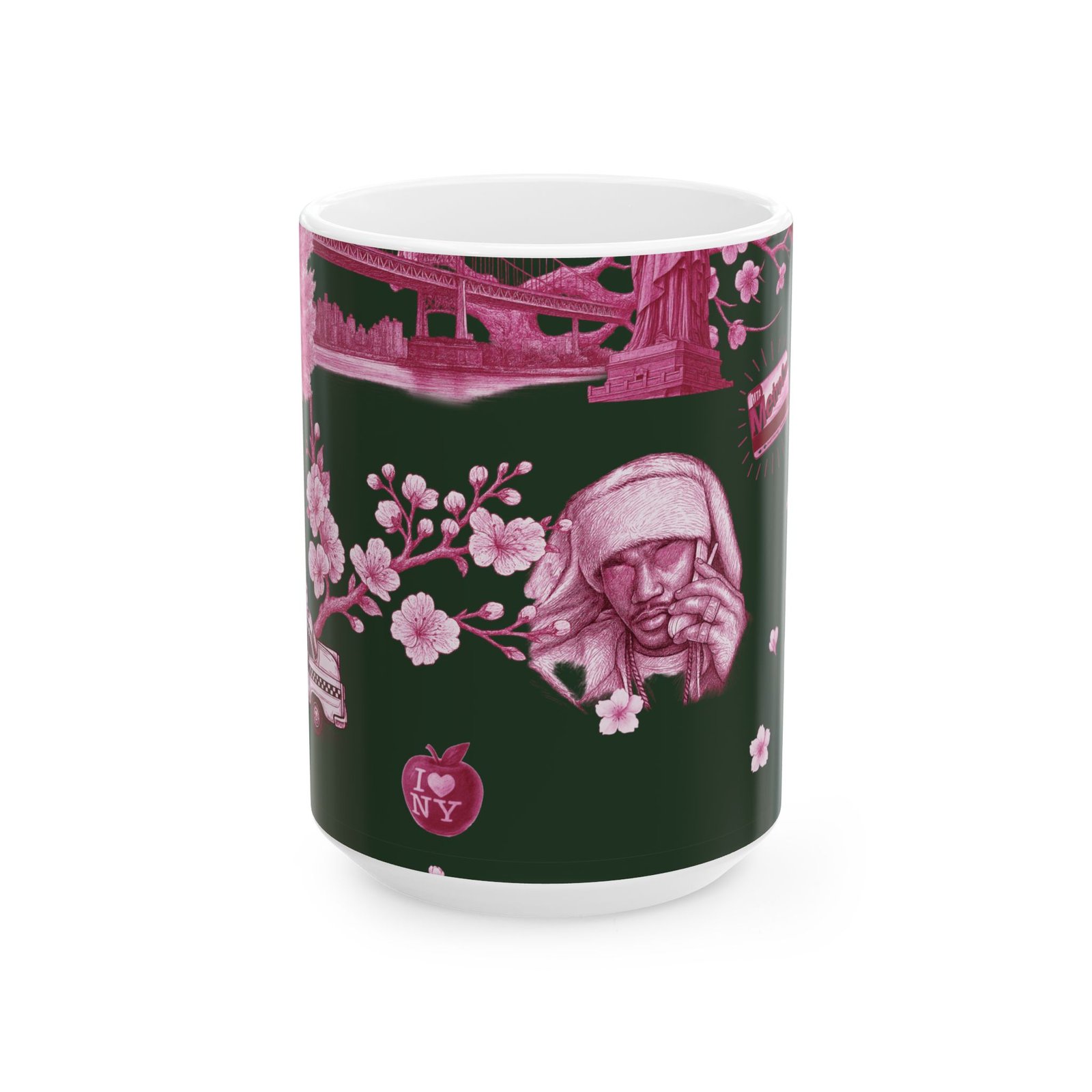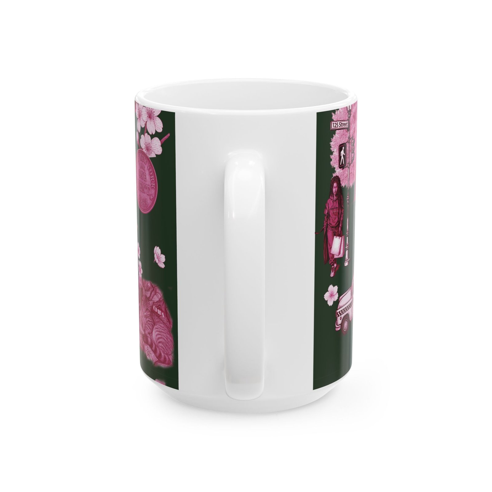 Steam rises from a city morning — warm coffee in hand, neon-pink blossoms soft against a deep forest backdrop. This 11 oz ceramic mug carries a small-city romance: skyline motifs, a classic taxi, and quiet park scenes rendered in moody pinks. It feels like a walk through early spring streets, phone tucked away, noticing the little scenes that make a neighborhood feel like home. For someone who treasures urban quiet, dusk walks, and the slow ritual of a morning brew, this mug brings that feeling to the kitchen counter.