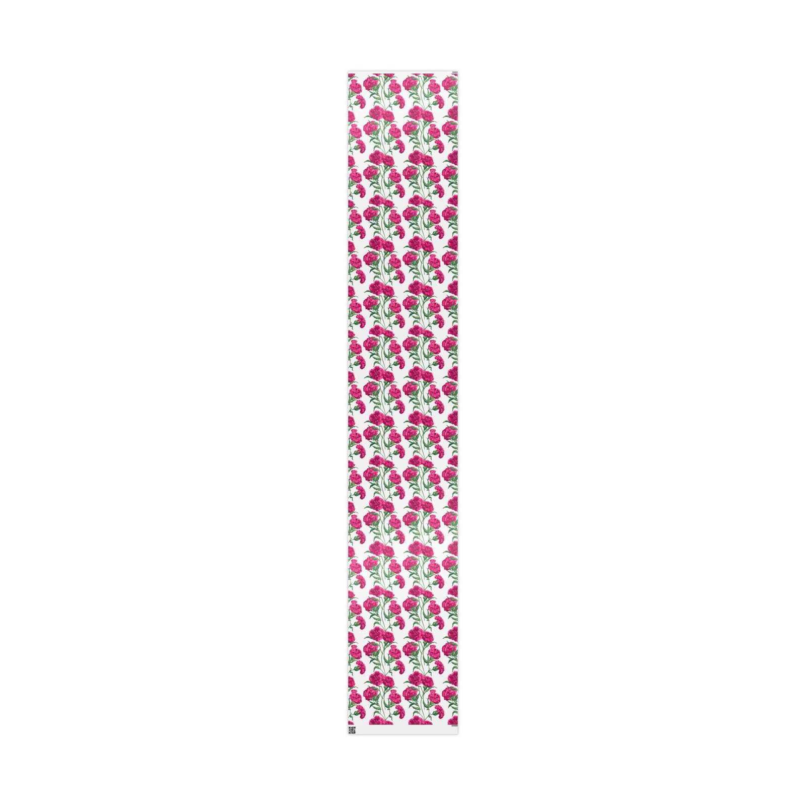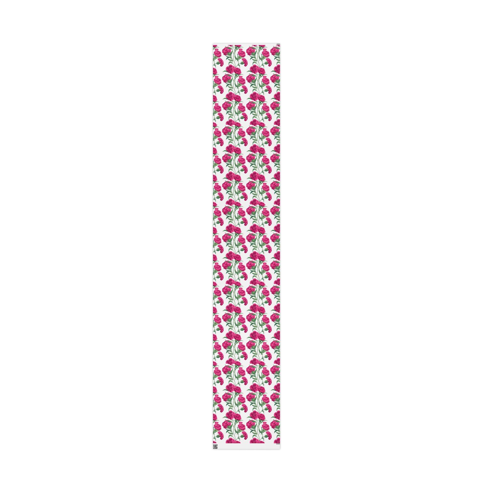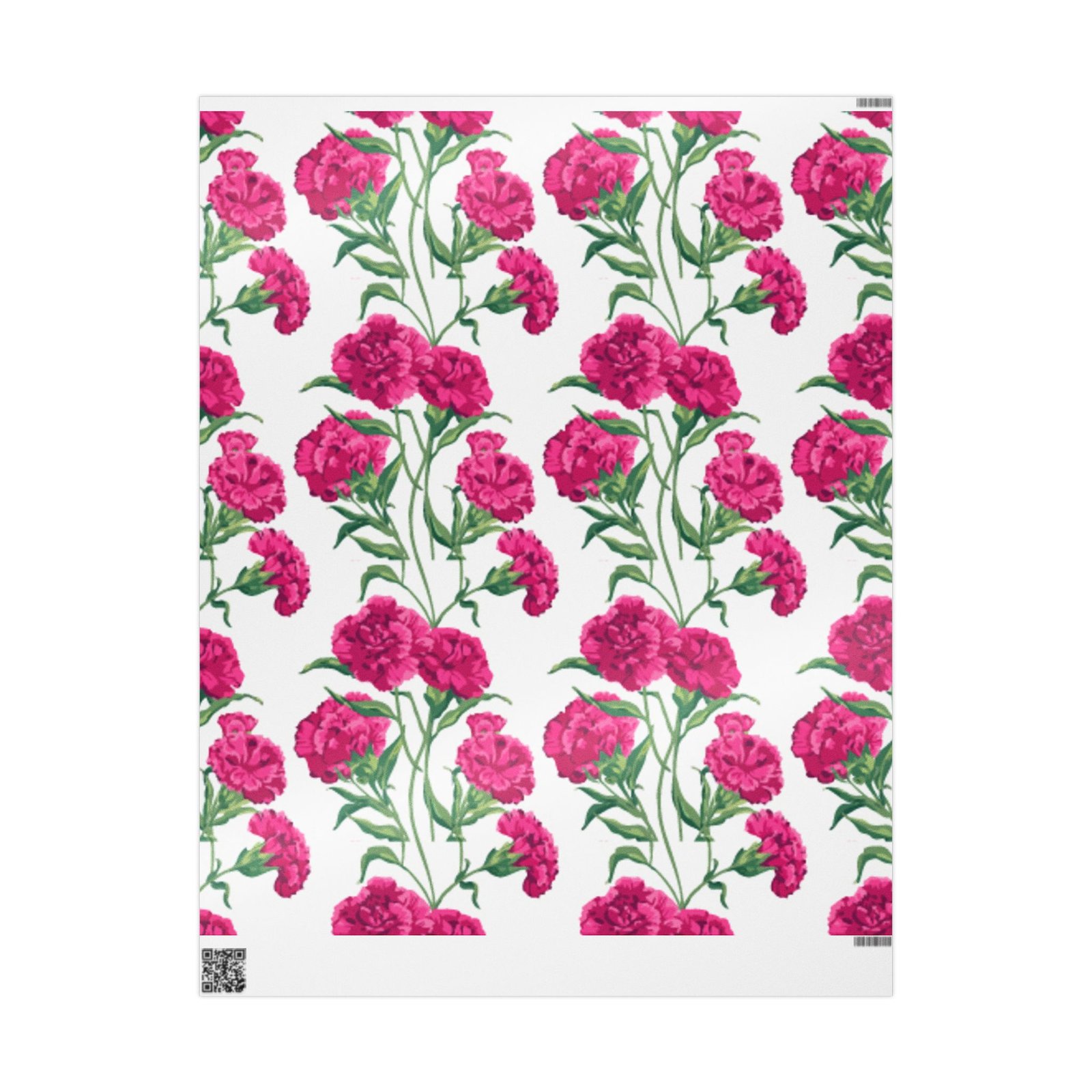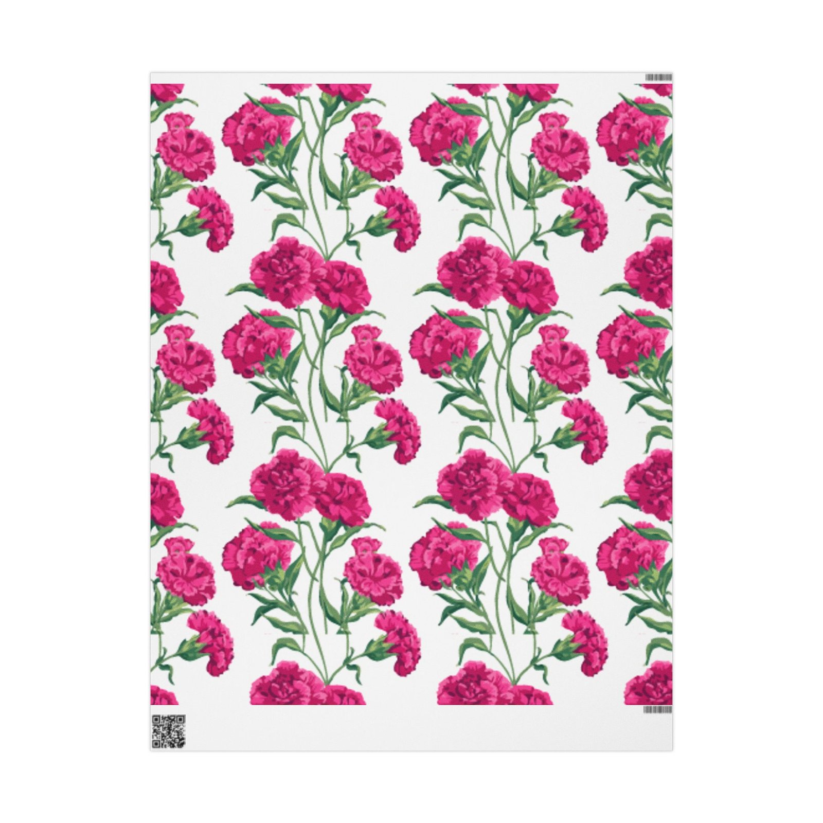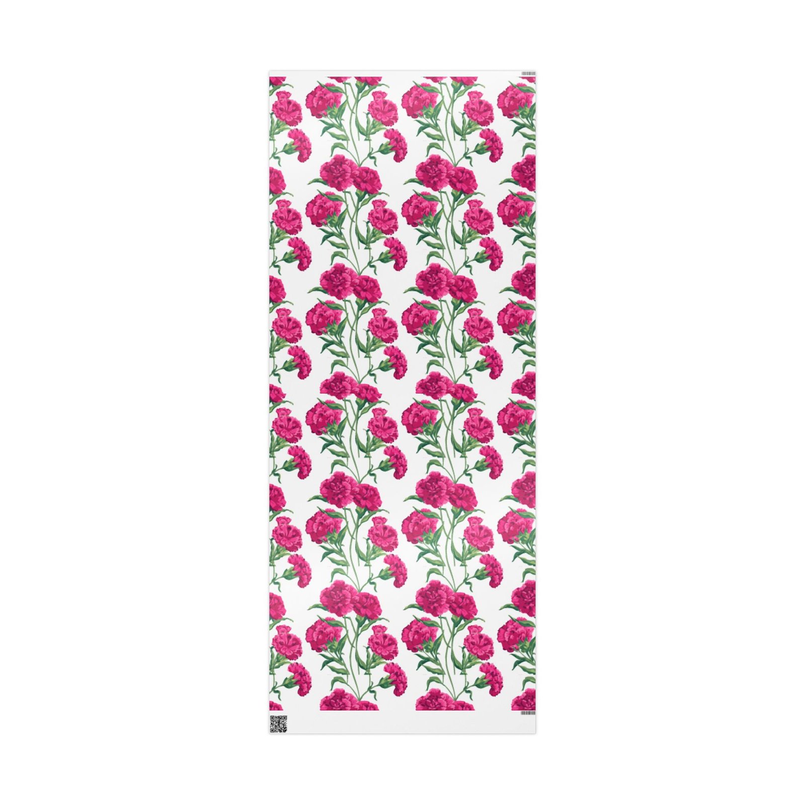 A roll of floral wrapping paper that brings a fresh, handmade touch to every gift. Bright magenta peonies bloom across a clean white background, their painterly stems and leaves creating a lively, repeating pattern. The print is produced in high-definition on heavyweight 90gsm fine art paper, available with your choice of a glossy or smooth matte finish. Rolls come in three generous lengths so you can wrap small treasures or larger keepsakes, and the one-sided print keeps the reverse clean for easy folding. The subtle white border with a small bar and QR code remains at the top and bottom edge of each sheet.
