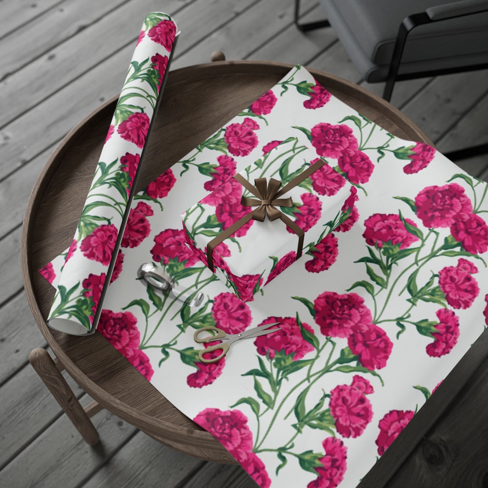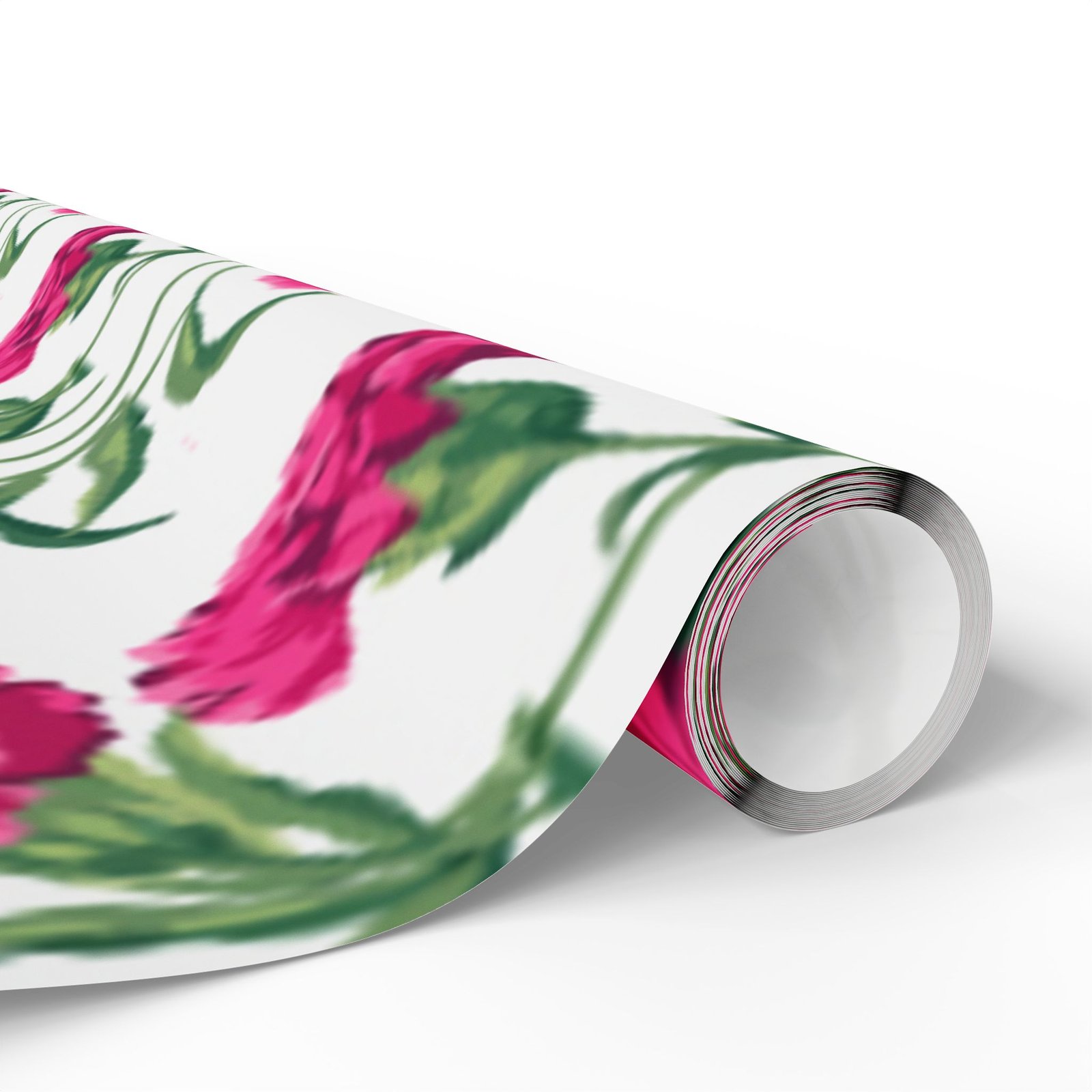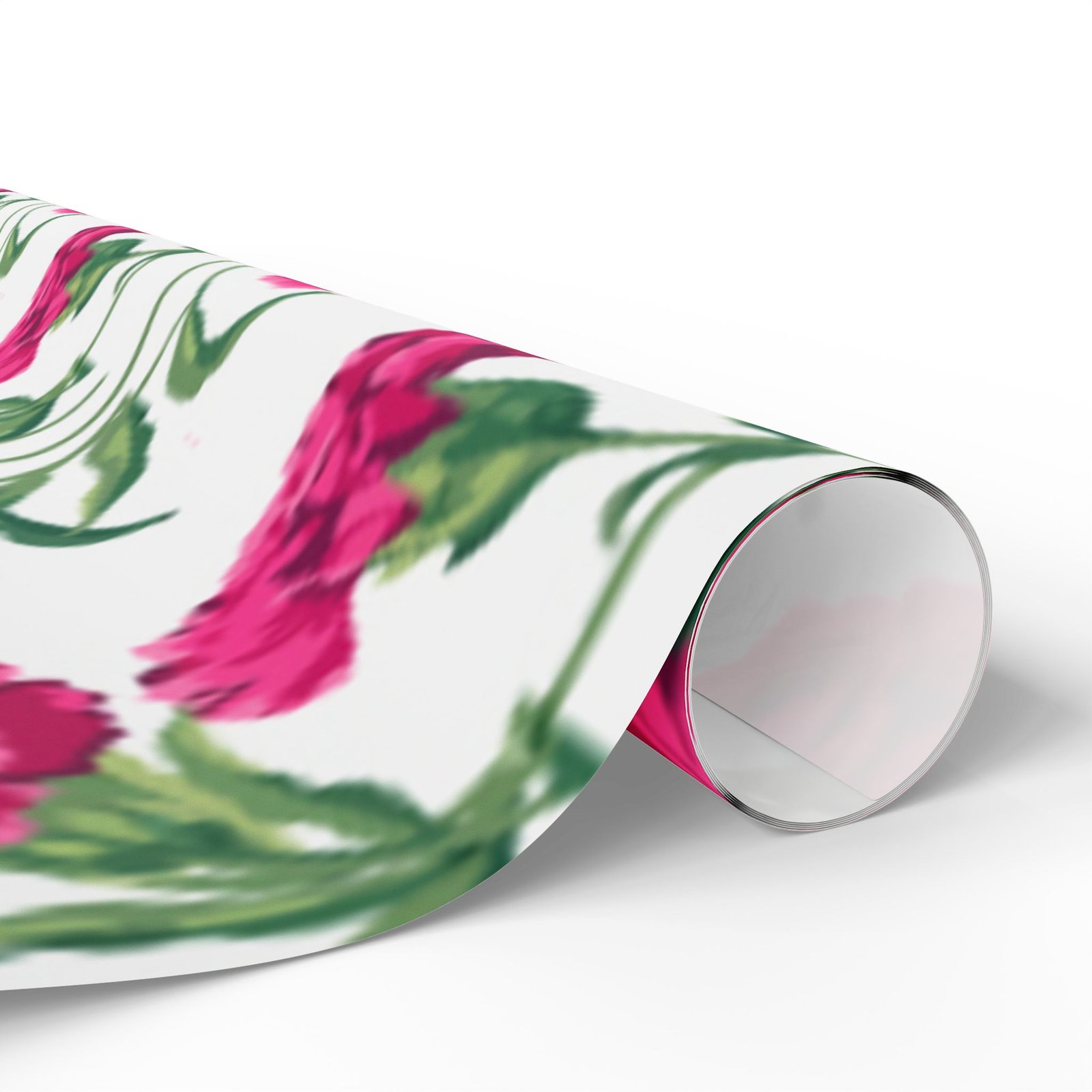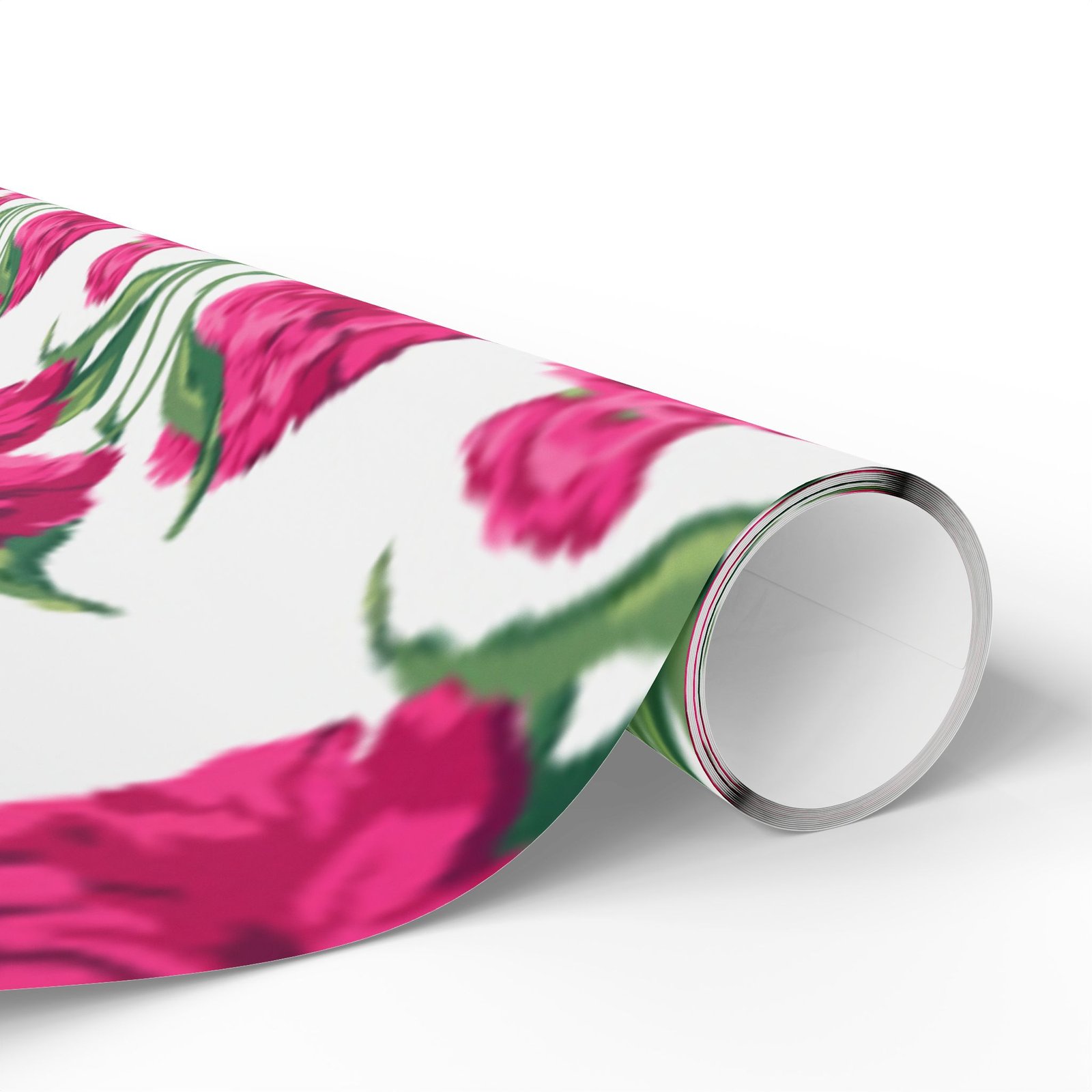 A roll of floral wrapping paper that brings a fresh, handmade touch to every gift. Bright magenta peonies bloom across a clean white background, their painterly stems and leaves creating a lively, repeating pattern. The print is produced in high-definition on heavyweight 90gsm fine art paper, available with your choice of a glossy or smooth matte finish. Rolls come in three generous lengths so you can wrap small treasures or larger keepsakes, and the one-sided print keeps the reverse clean for easy folding. The subtle white border with a small bar and QR code remains at the top and bottom edge of each sheet.