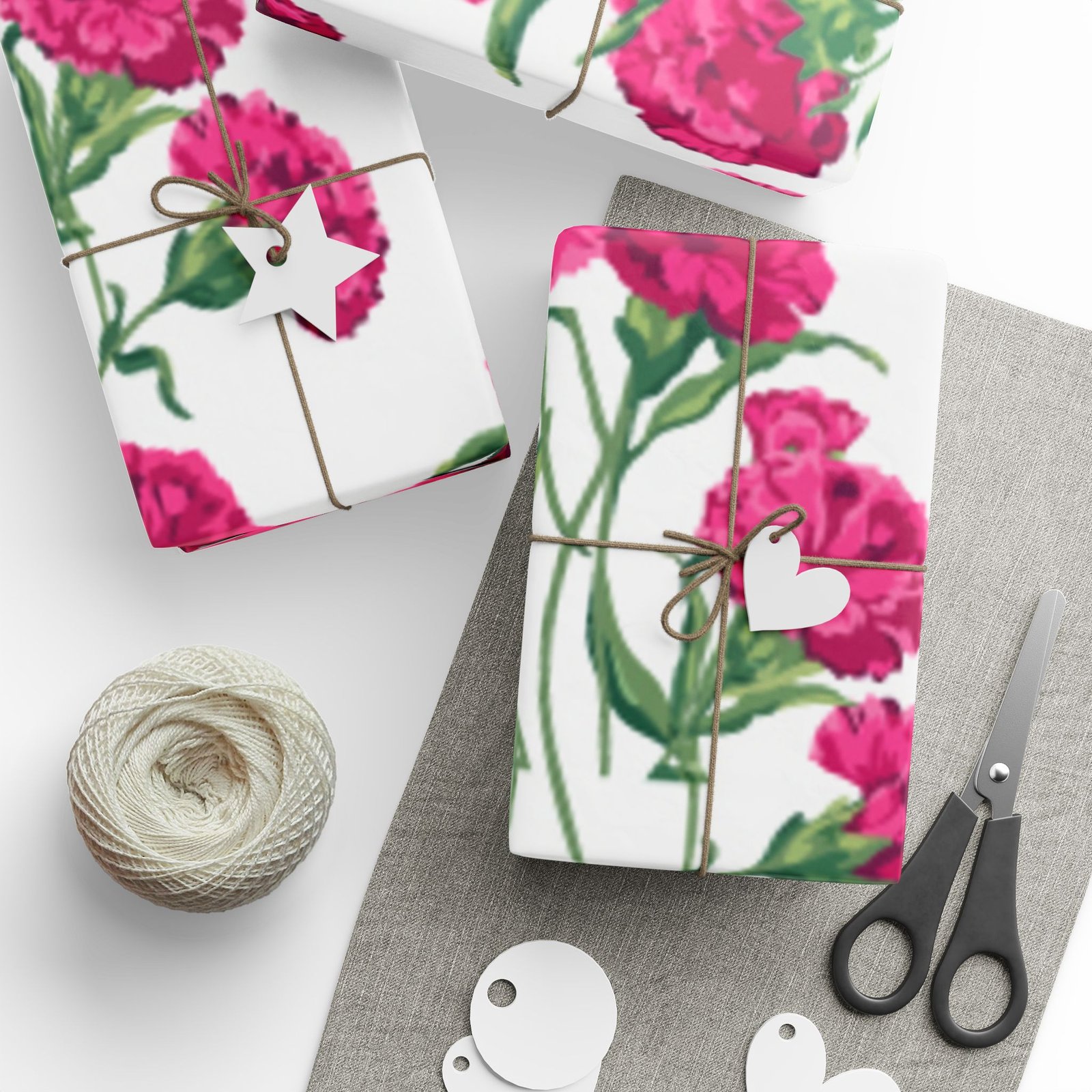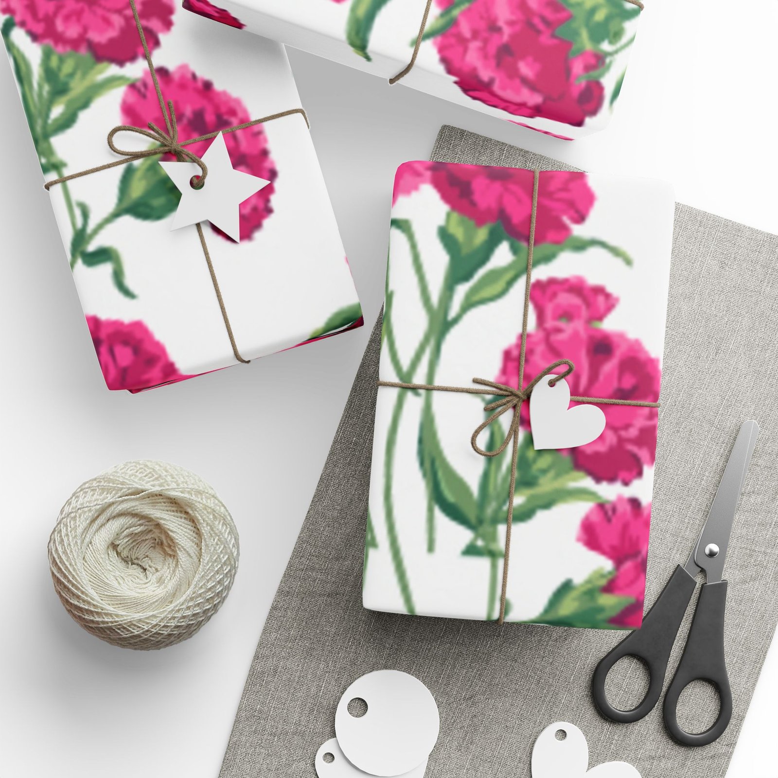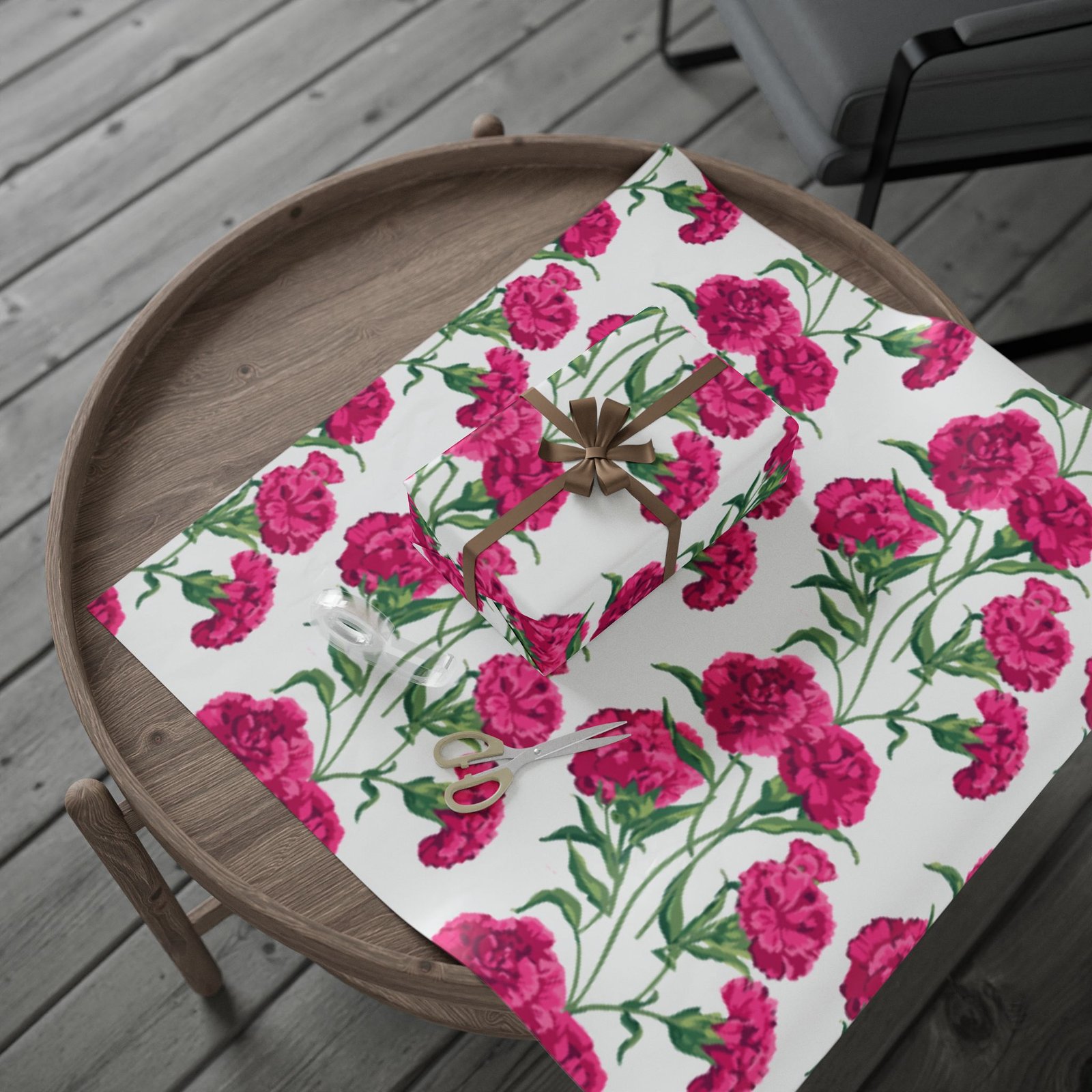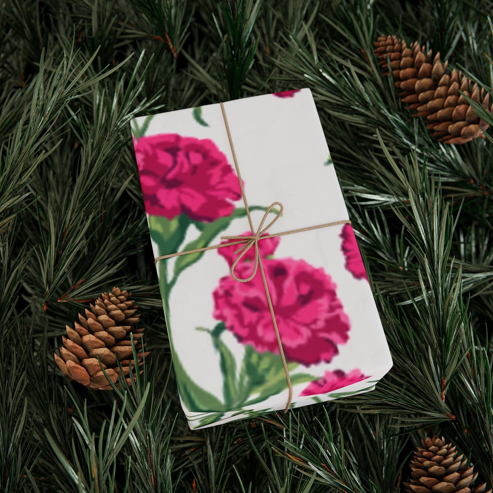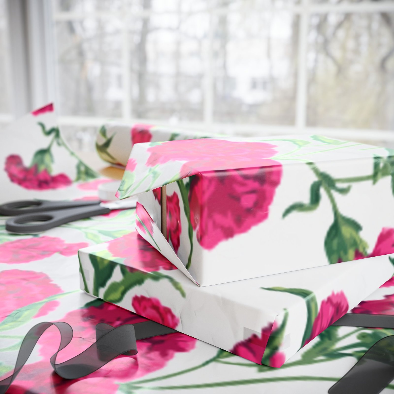 A roll of floral wrapping paper that brings a fresh, handmade touch to every gift. Bright magenta peonies bloom across a clean white background, their painterly stems and leaves creating a lively, repeating pattern. The print is produced in high-definition on heavyweight 90gsm fine art paper, available with your choice of a glossy or smooth matte finish. Rolls come in three generous lengths so you can wrap small treasures or larger keepsakes, and the one-sided print keeps the reverse clean for easy folding. The subtle white border with a small bar and QR code remains at the top and bottom edge of each sheet.