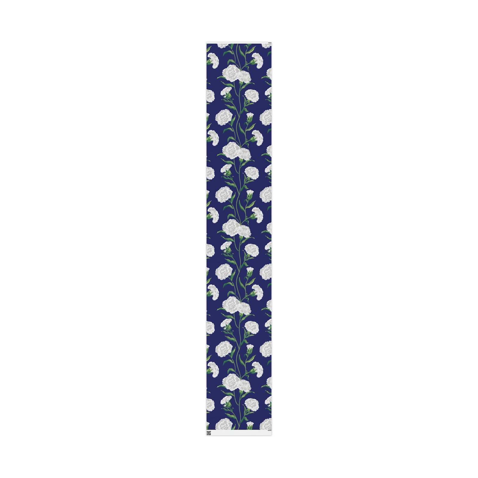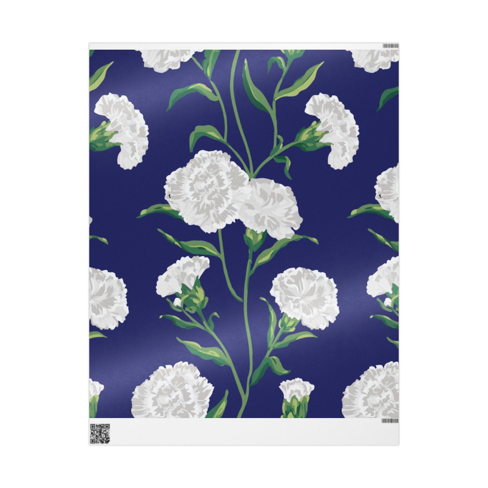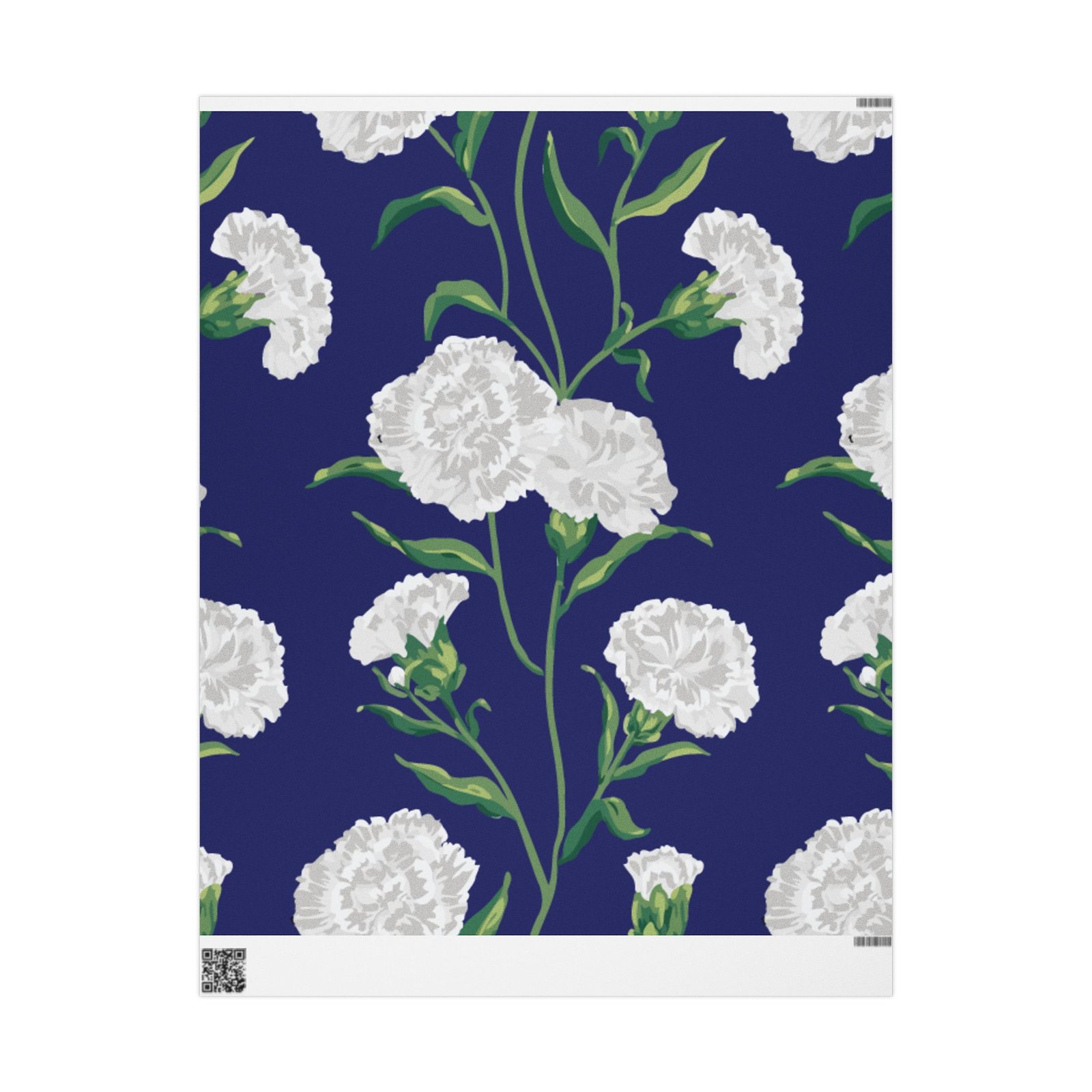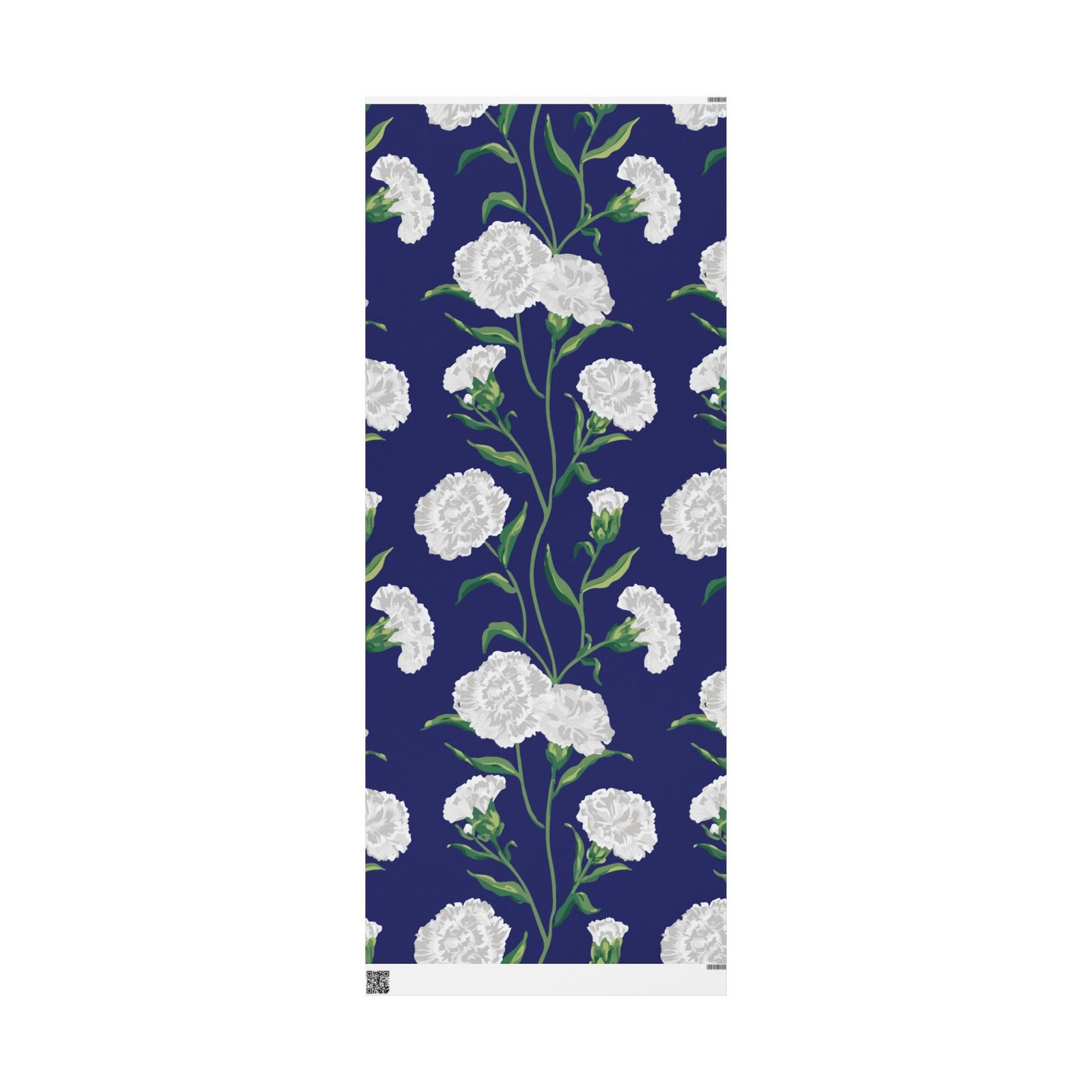 A roll of elegant floral wrapping paper that turns gift-giving into a quiet, thoughtful moment. Soft white carnations float across a deep navy background, their delicate petals and verdant stems painted with painterly brushstrokes that feel handcrafted. The paper’s substantial 90gsm fine art stock holds folds and ribbons beautifully, while your choice of glossy or matte finish lets you control the final mood — luminous and polished, or soft and understated. Available in three generous lengths, this single-sided print brings a refined, botanical touch to birthdays, anniversaries, bridal showers, and seasonal gatherings. Small white trim at the roll edges includes a producer barcode and QR band.