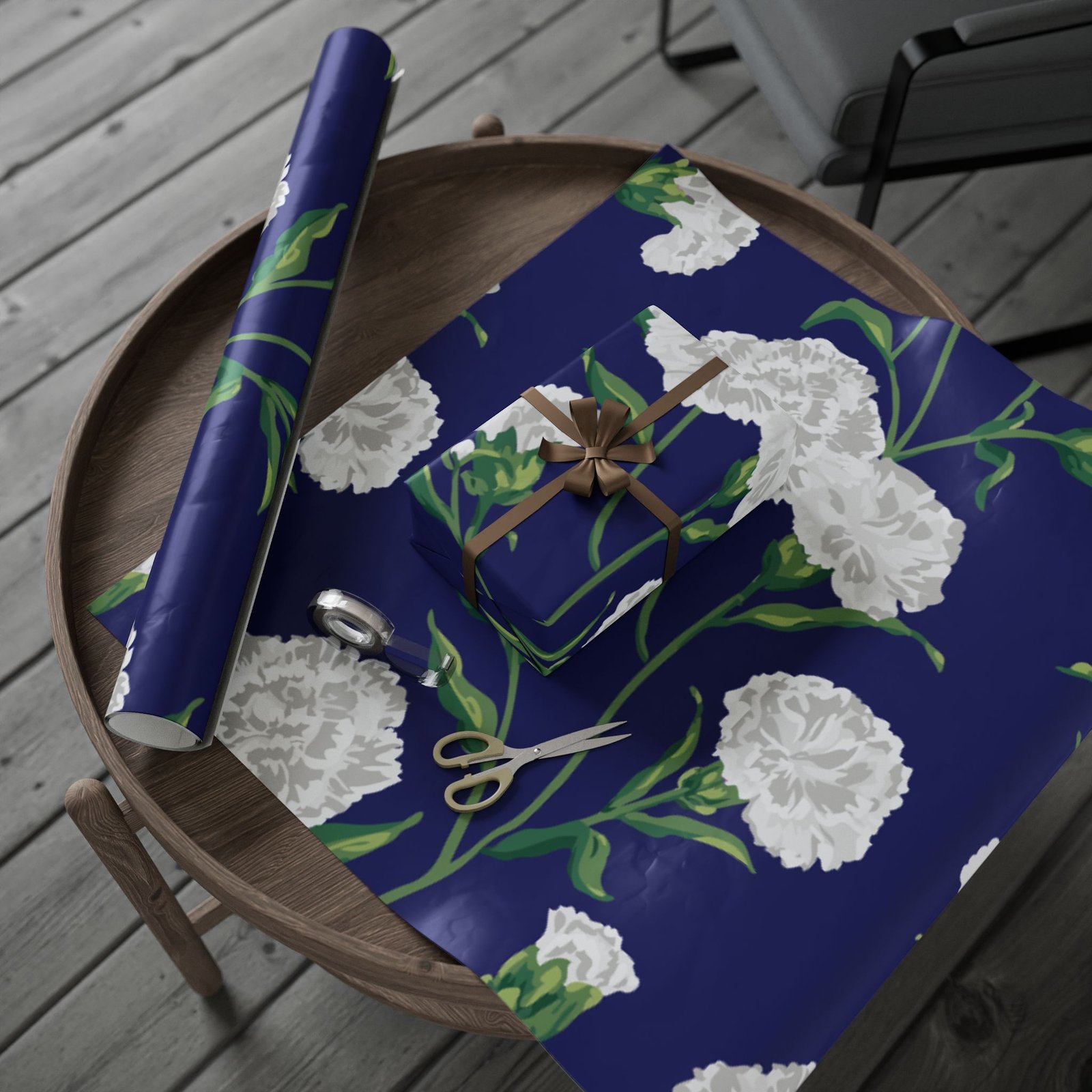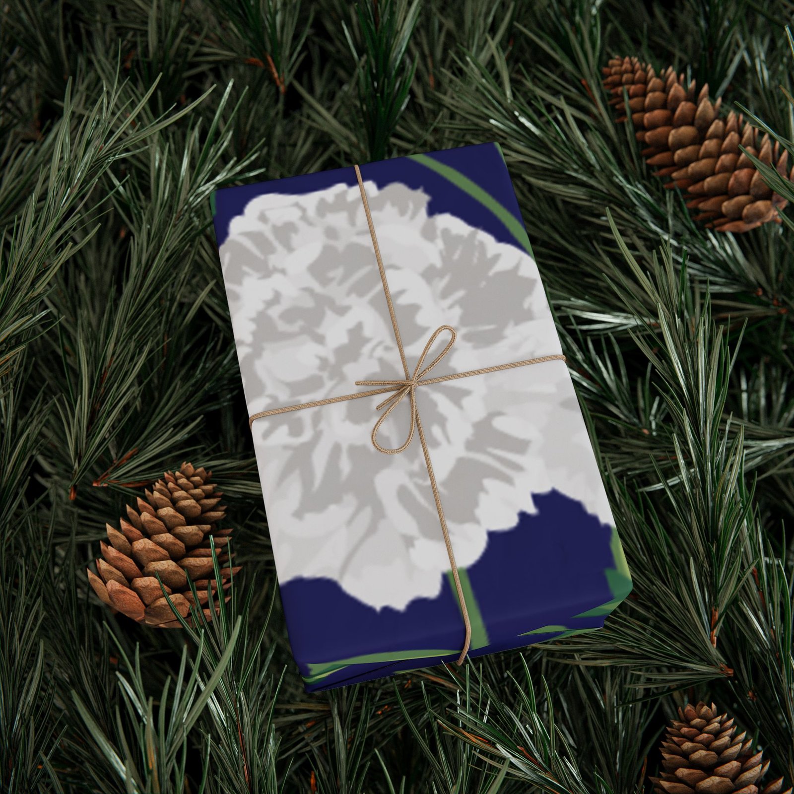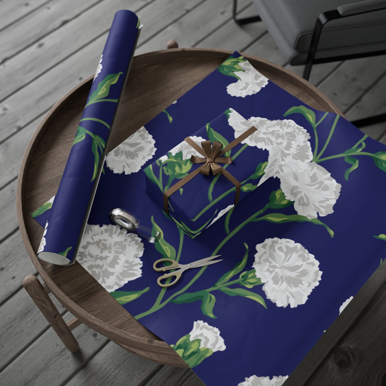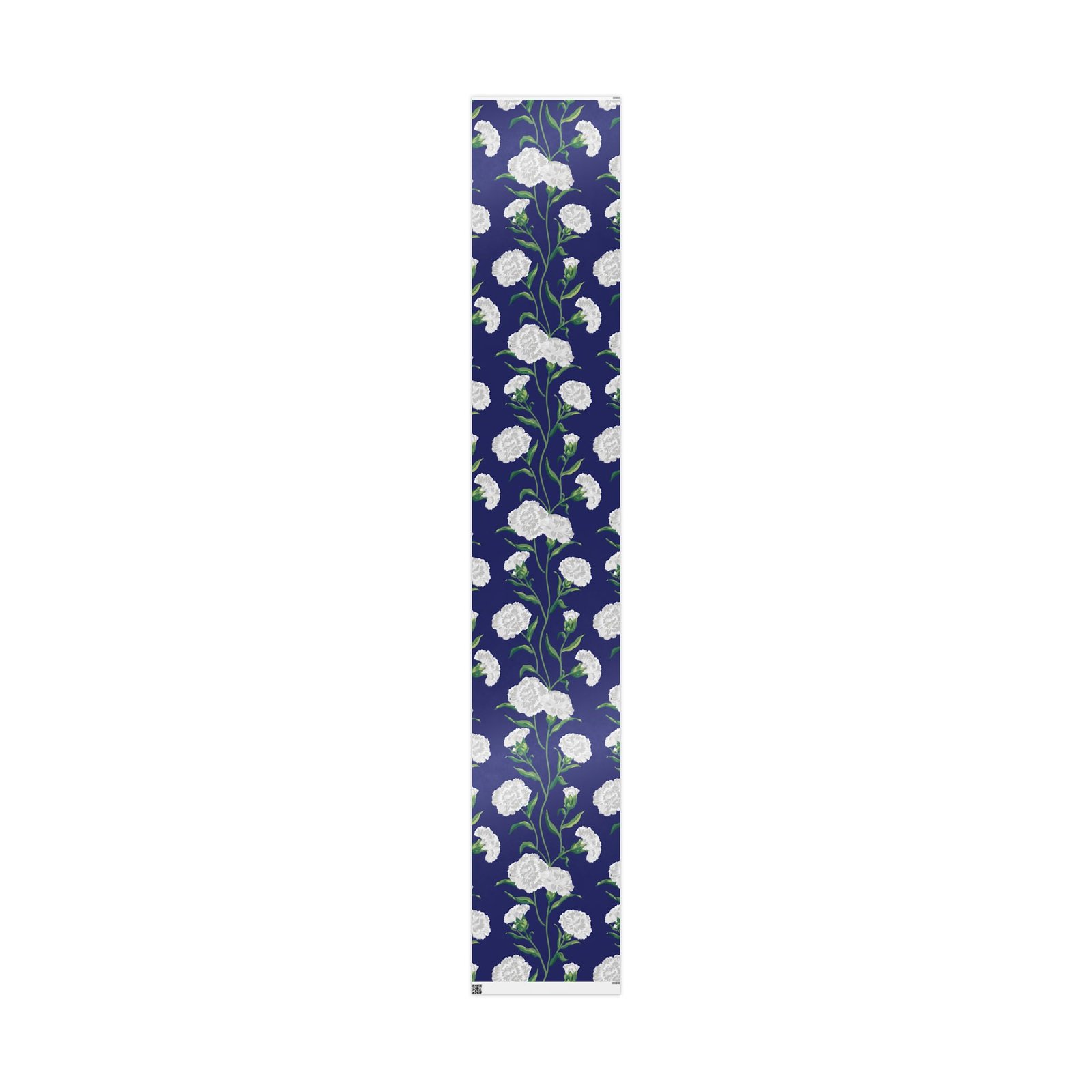 A roll of elegant floral wrapping paper that turns gift-giving into a quiet, thoughtful moment. Soft white carnations float across a deep navy background, their delicate petals and verdant stems painted with painterly brushstrokes that feel handcrafted. The paper’s substantial 90gsm fine art stock holds folds and ribbons beautifully, while your choice of glossy or matte finish lets you control the final mood — luminous and polished, or soft and understated. Available in three generous lengths, this single-sided print brings a refined, botanical touch to birthdays, anniversaries, bridal showers, and seasonal gatherings. Small white trim at the roll edges includes a producer barcode and QR band.