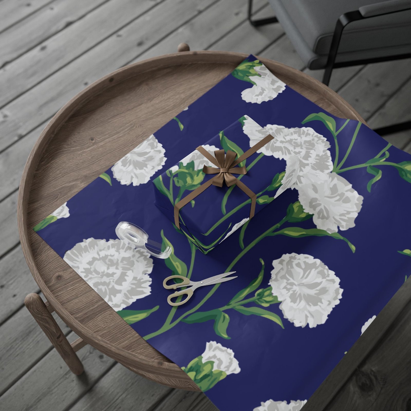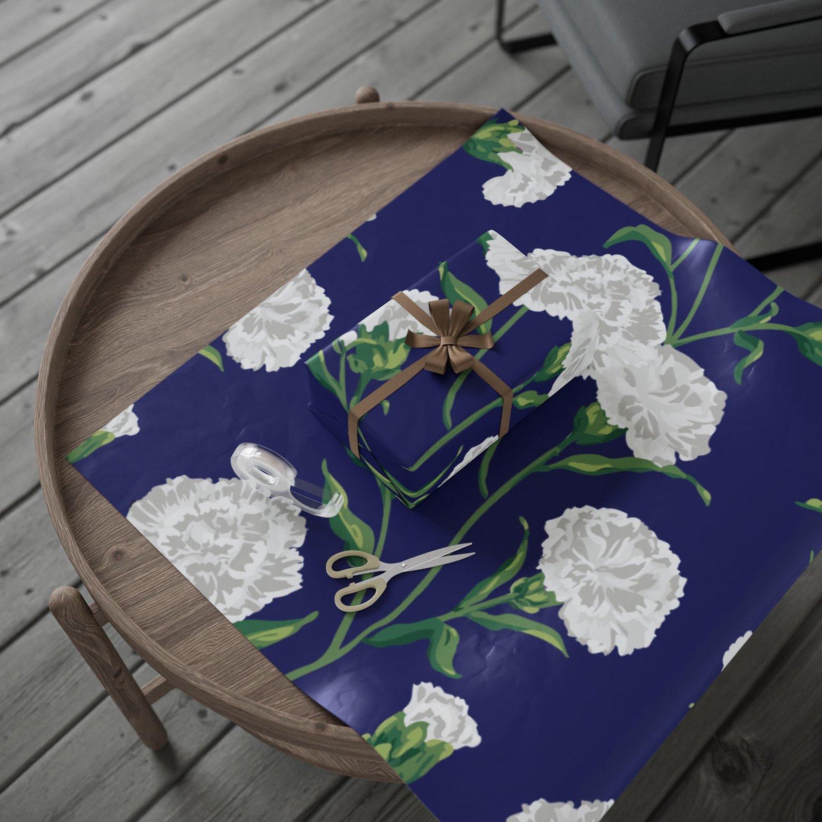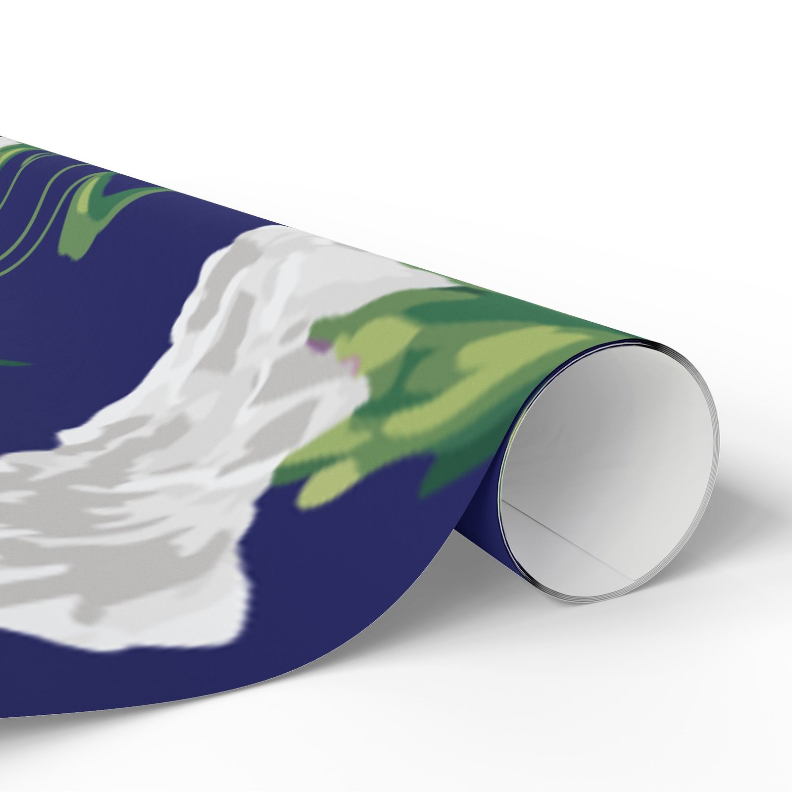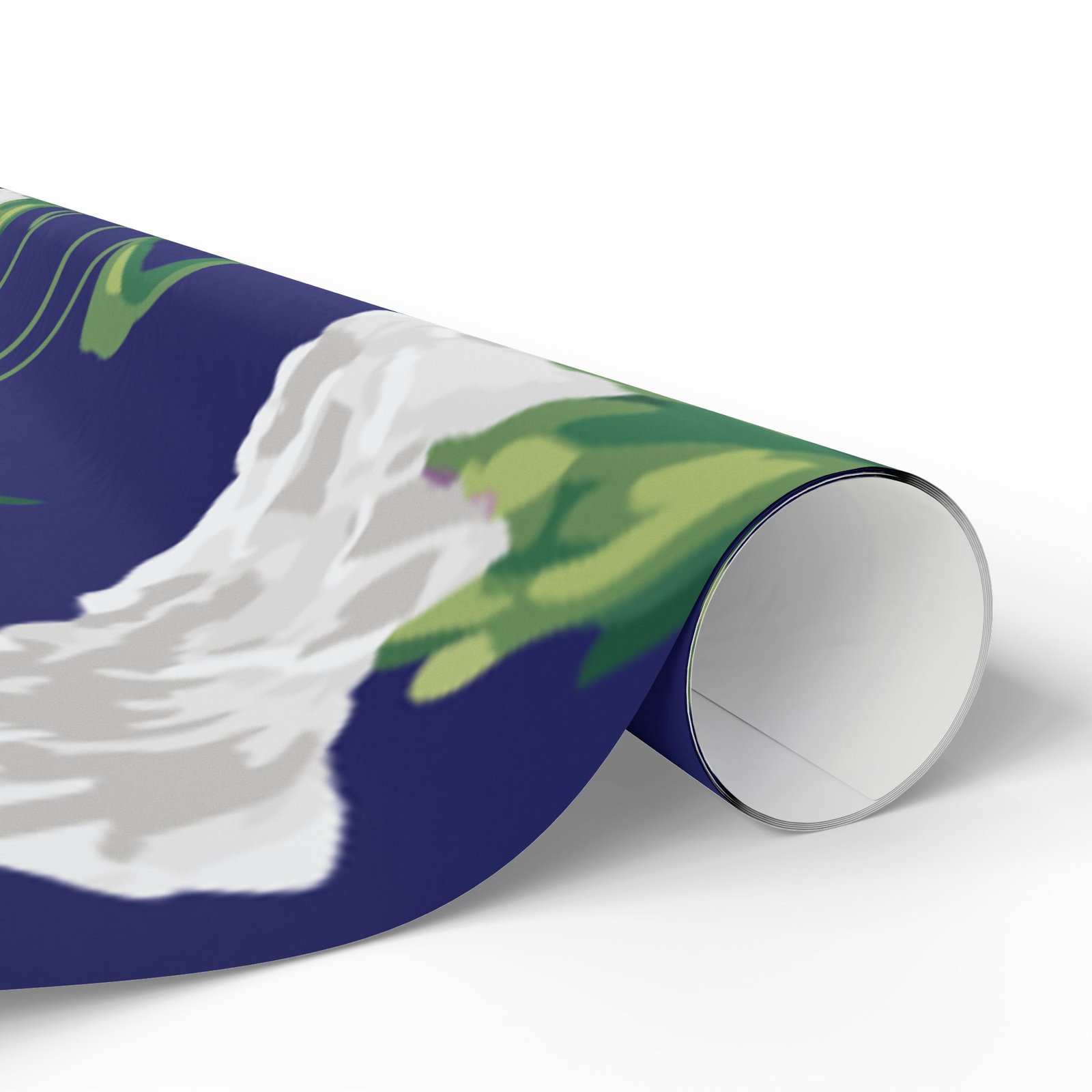 A roll of elegant floral wrapping paper that turns gift-giving into a quiet, thoughtful moment. Soft white carnations float across a deep navy background, their delicate petals and verdant stems painted with painterly brushstrokes that feel handcrafted. The paper’s substantial 90gsm fine art stock holds folds and ribbons beautifully, while your choice of glossy or matte finish lets you control the final mood — luminous and polished, or soft and understated. Available in three generous lengths, this single-sided print brings a refined, botanical touch to birthdays, anniversaries, bridal showers, and seasonal gatherings. Small white trim at the roll edges includes a producer barcode and QR band.