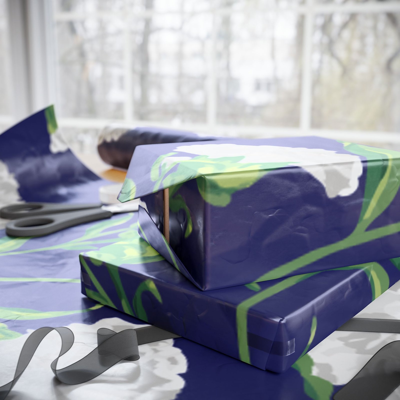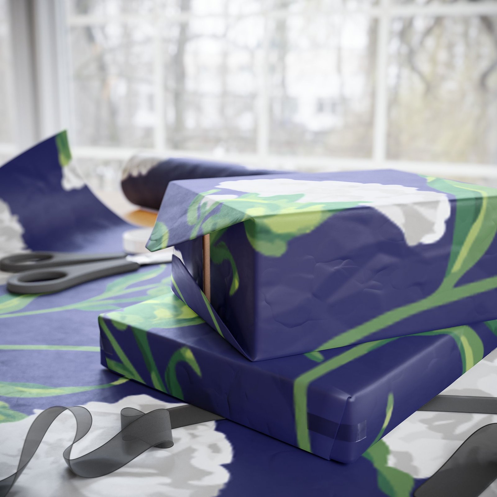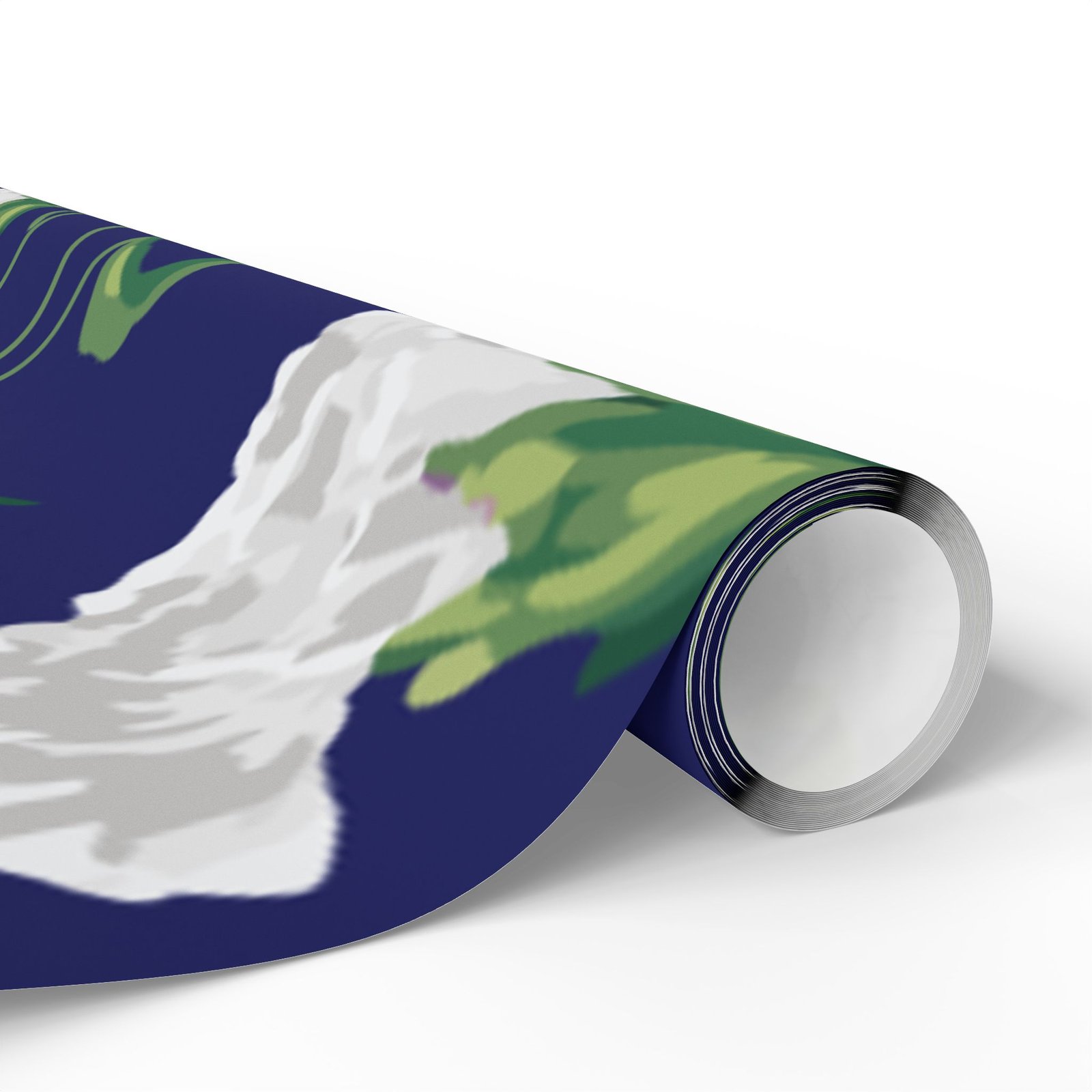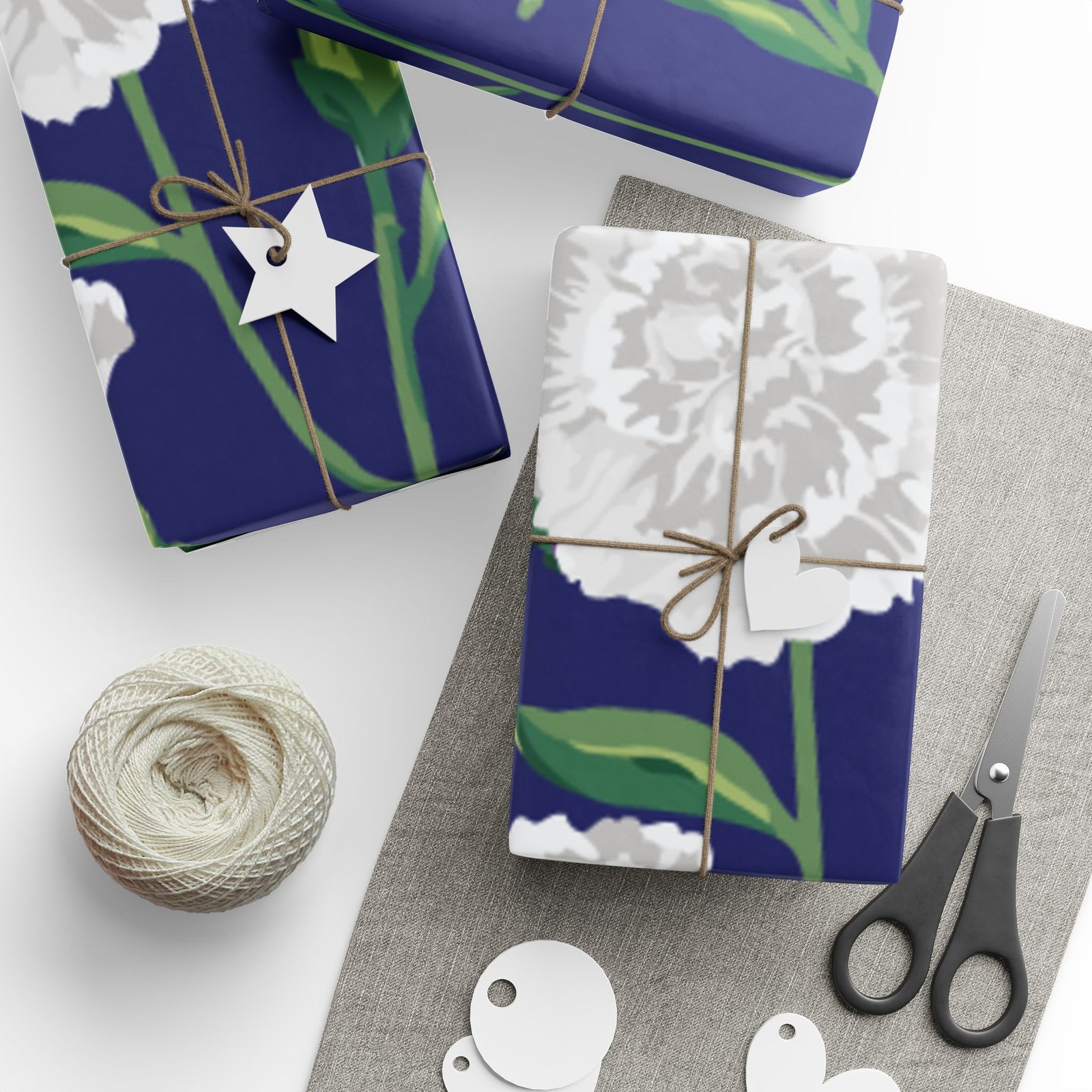 A roll of elegant floral wrapping paper that turns gift-giving into a quiet, thoughtful moment. Soft white carnations float across a deep navy background, their delicate petals and verdant stems painted with painterly brushstrokes that feel handcrafted. The paper’s substantial 90gsm fine art stock holds folds and ribbons beautifully, while your choice of glossy or matte finish lets you control the final mood — luminous and polished, or soft and understated. Available in three generous lengths, this single-sided print brings a refined, botanical touch to birthdays, anniversaries, bridal showers, and seasonal gatherings. Small white trim at the roll edges includes a producer barcode and QR band.