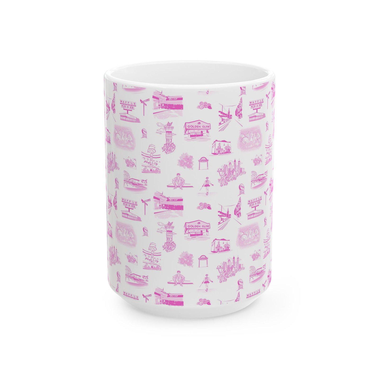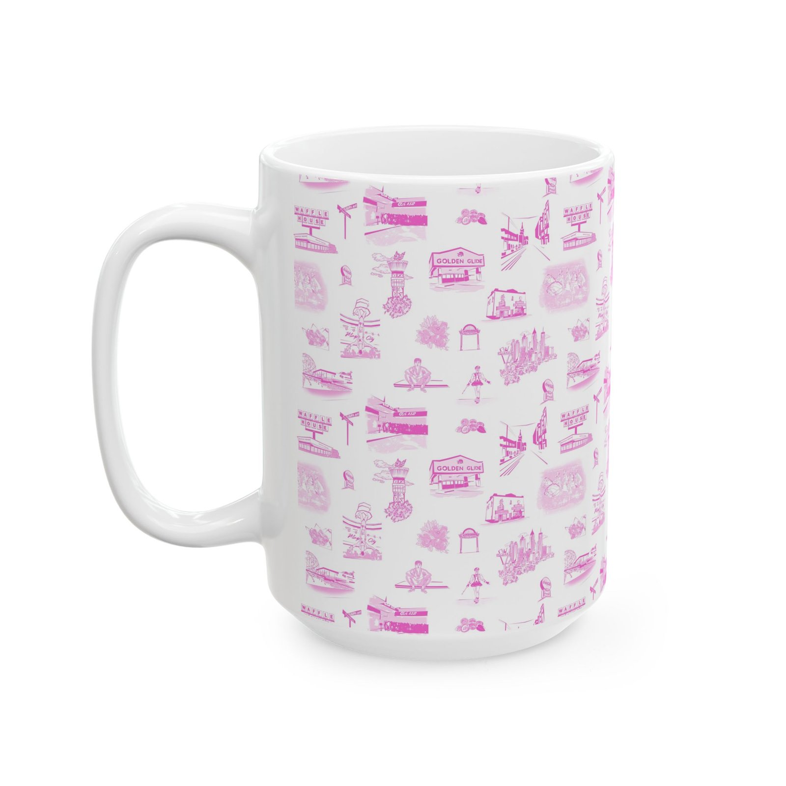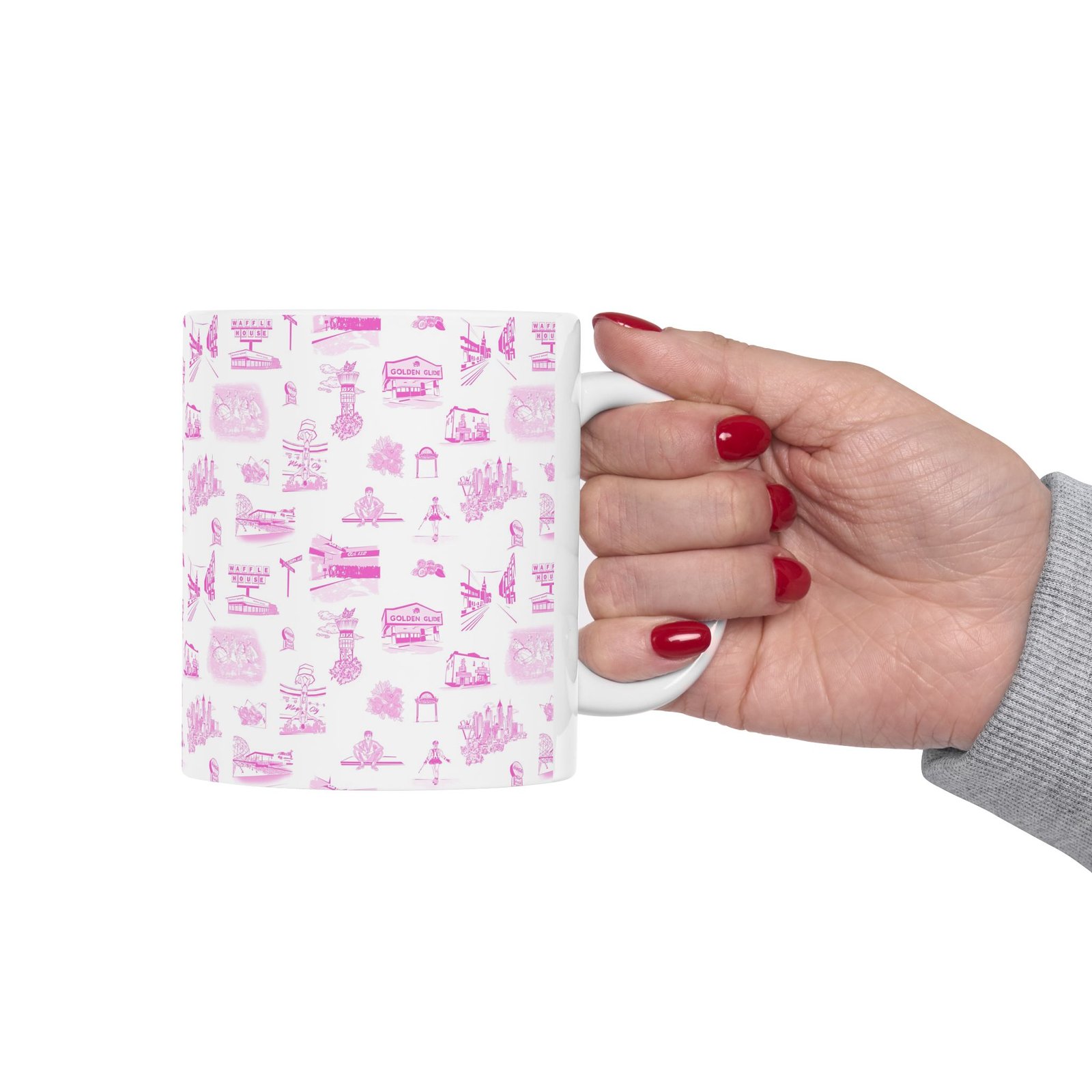A bright, glossy ceramic mug wrapped in a delicate pattern of tiny pink illustrations. Each sip feels gentle and familiar — like a slow morning with soft light and small, whimsical details scattered across the surface. The slim, C-shaped handle sits comfortably in hand while lively, crisp printing keeps the artwork vivid wash after wash. Choose the 11oz for focused morning coffee or the 15oz for long warm drinks during quiet afternoons. Dishwasher- and microwave-safe, this mug blends everyday practicality with a sweet, nostalgic aesthetic that fits into a cozy kitchen, an artist’s studio, or a leisurely weekend routine.