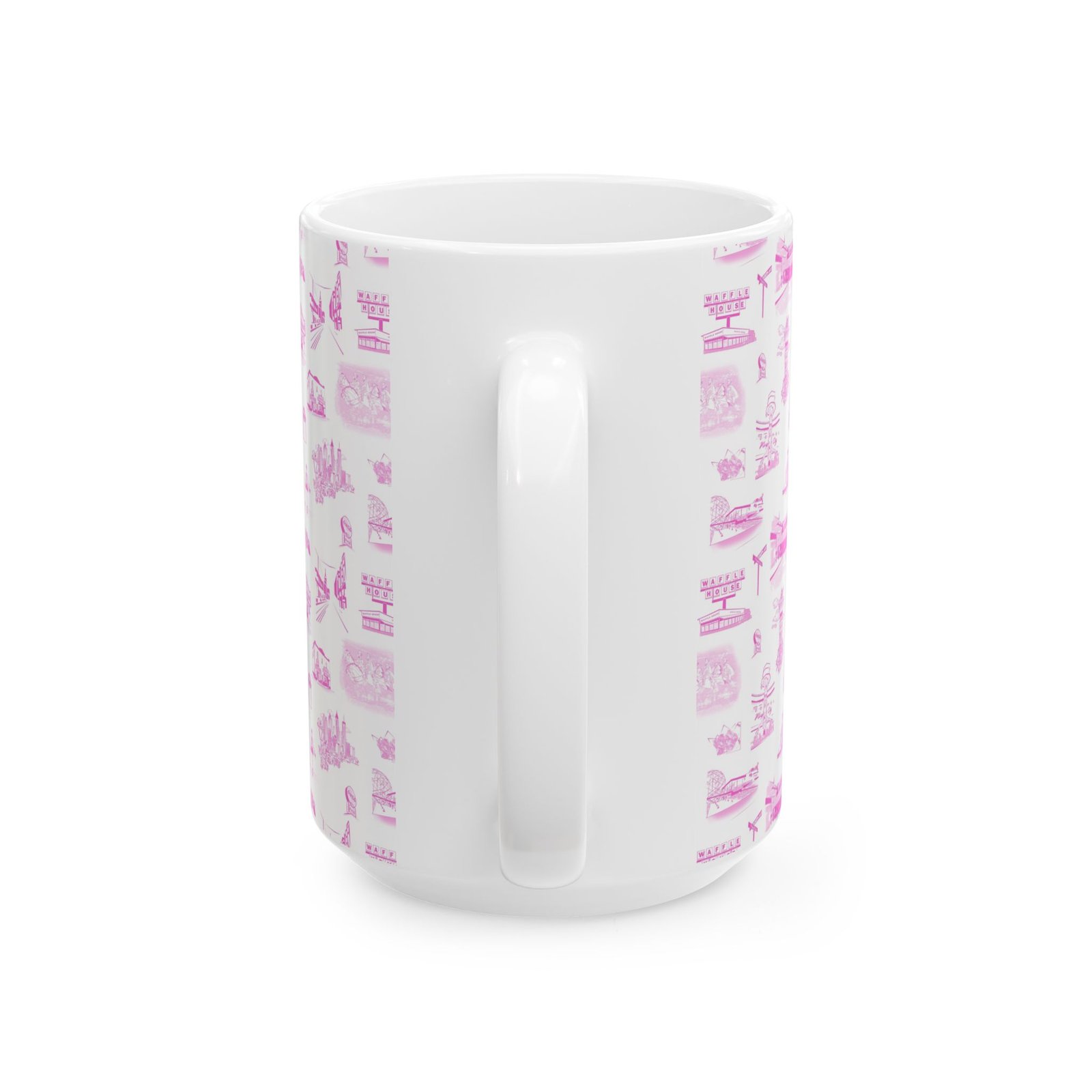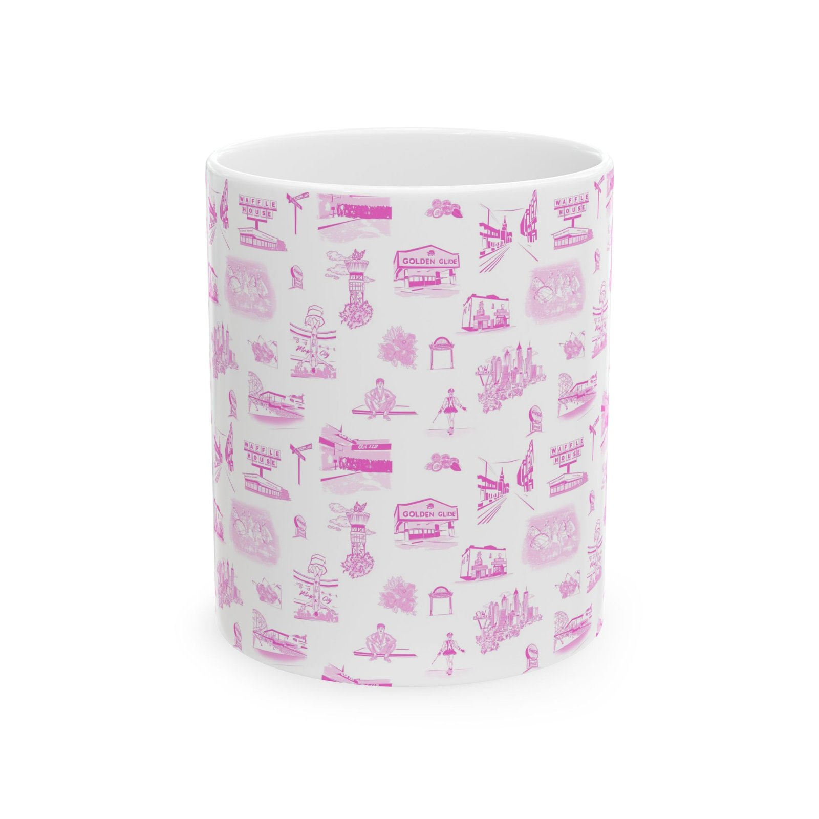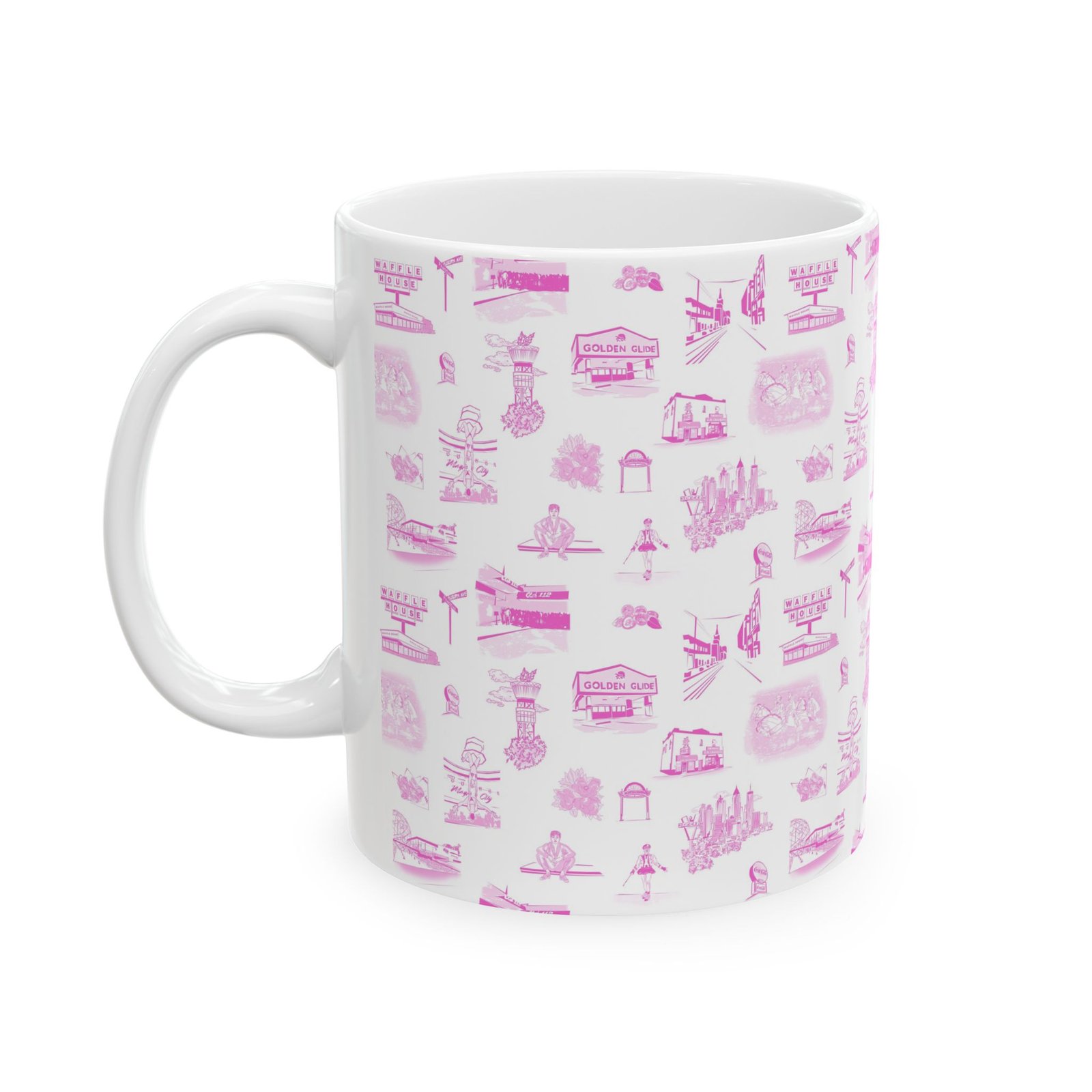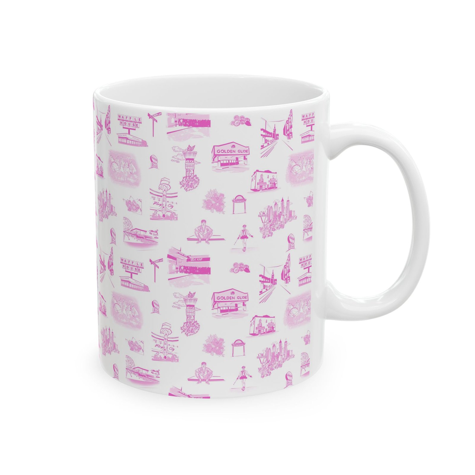 A bright, glossy ceramic mug wrapped in a delicate pattern of tiny pink illustrations. Each sip feels gentle and familiar — like a slow morning with soft light and small, whimsical details scattered across the surface. The slim, C-shaped handle sits comfortably in hand while lively, crisp printing keeps the artwork vivid wash after wash. Choose the 11oz for focused morning coffee or the 15oz for long warm drinks during quiet afternoons. Dishwasher- and microwave-safe, this mug blends everyday practicality with a sweet, nostalgic aesthetic that fits into a cozy kitchen, an artist’s studio, or a leisurely weekend routine.