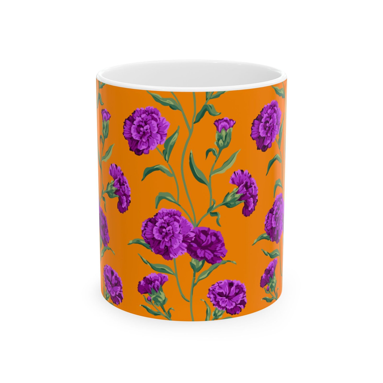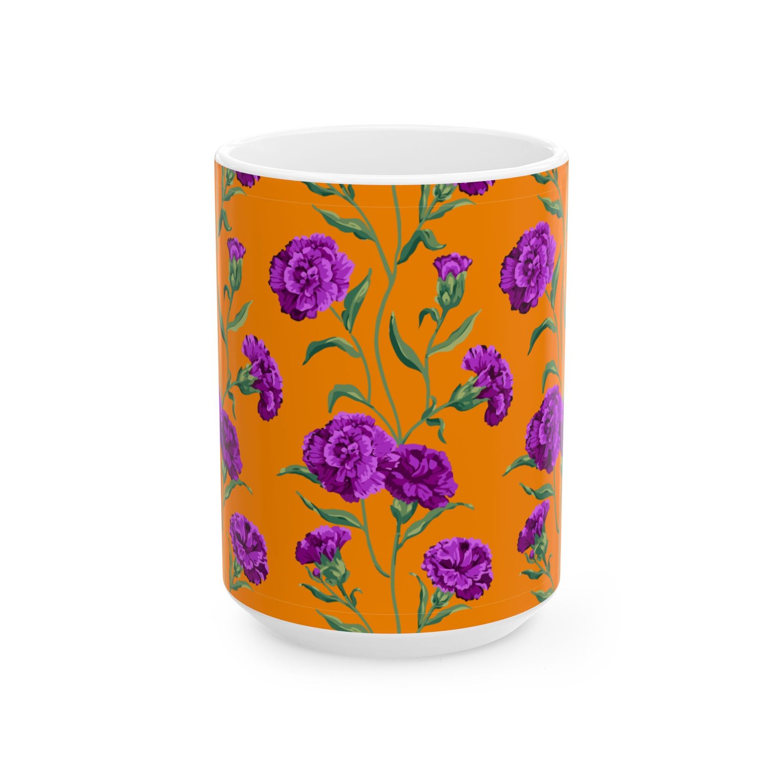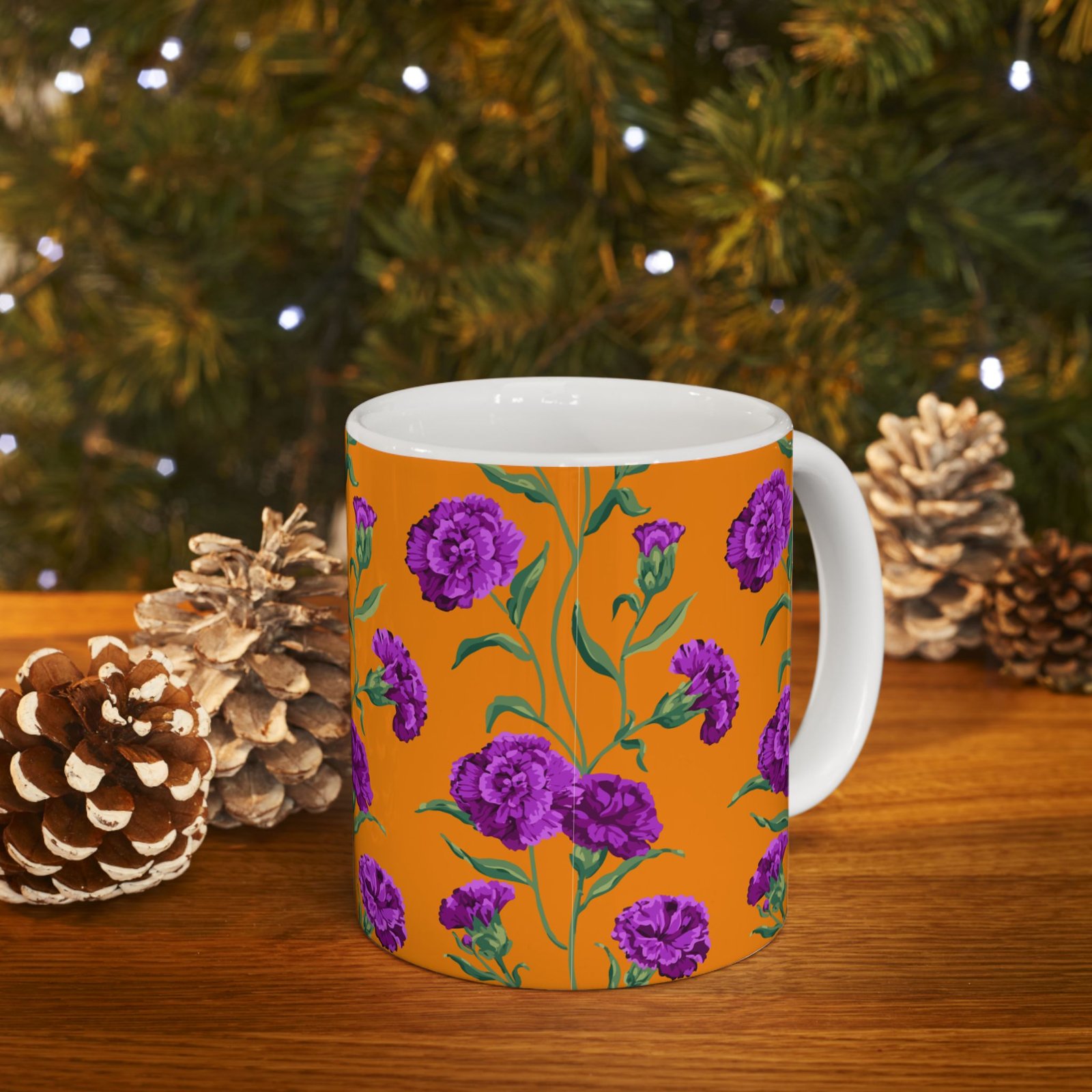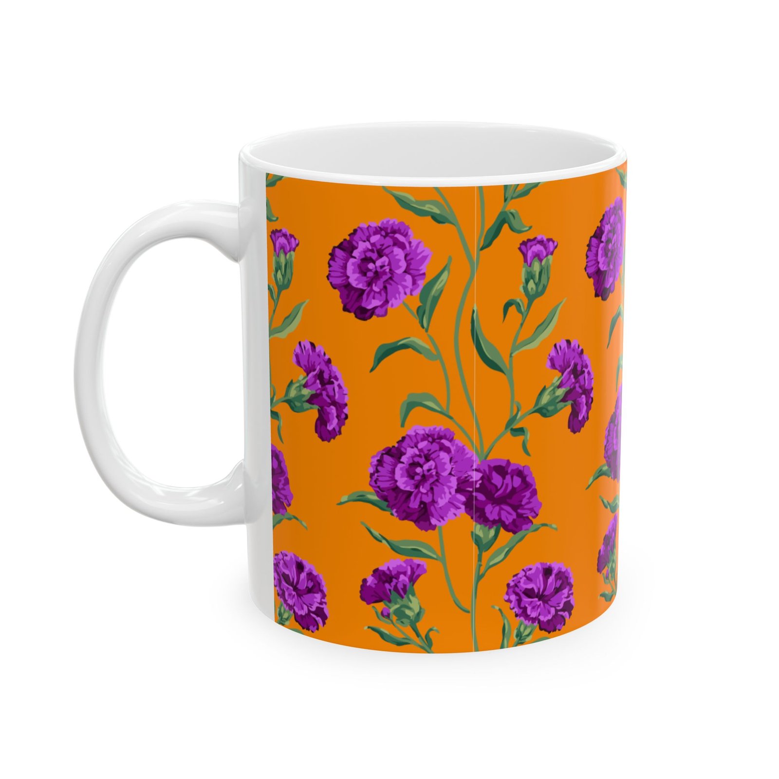 Bright, bold, and full of character — this ceramic mug brings a splash of joyful color to morning routines and slow-afternoon sips. Vivid purple carnations climb against a warm orange backdrop, turning a simple drink into a small, uplifting ritual. The glossy finish catches the light, letting the floral details pop whether it’s full of coffee, tea, or cocoa. Light in hand with a comfortable C-handle, it’s the kind of mug that sits on your desk and makes the day feel a bit more intentional. Use it while journaling, chatting with friends, or settling into a cozy window seat during a quiet weekend brunch.